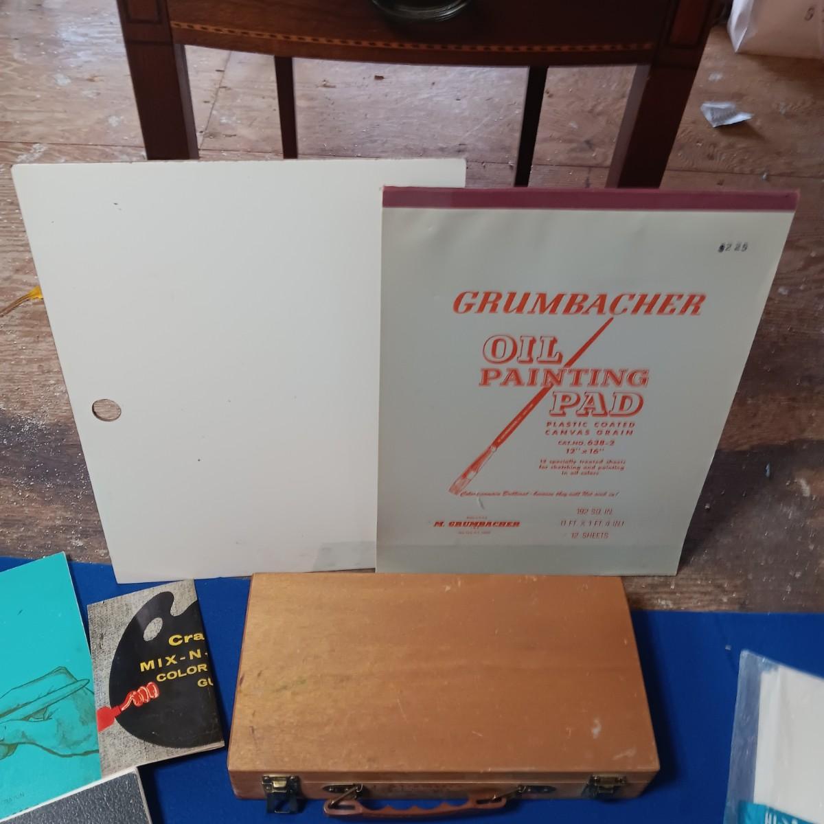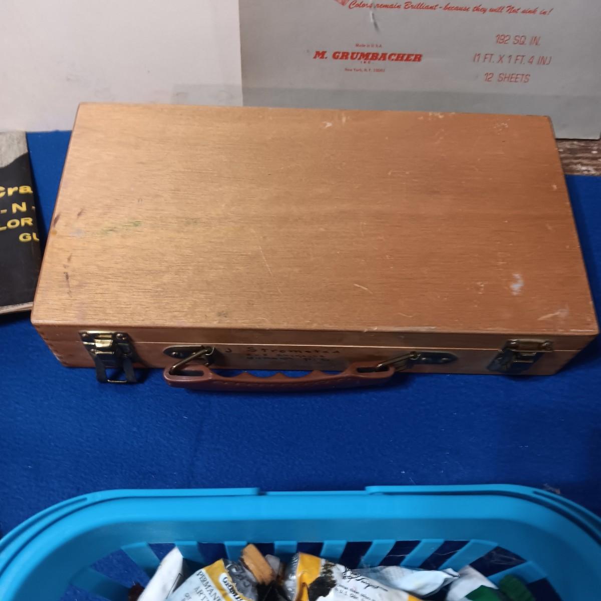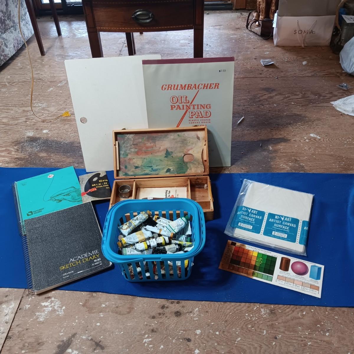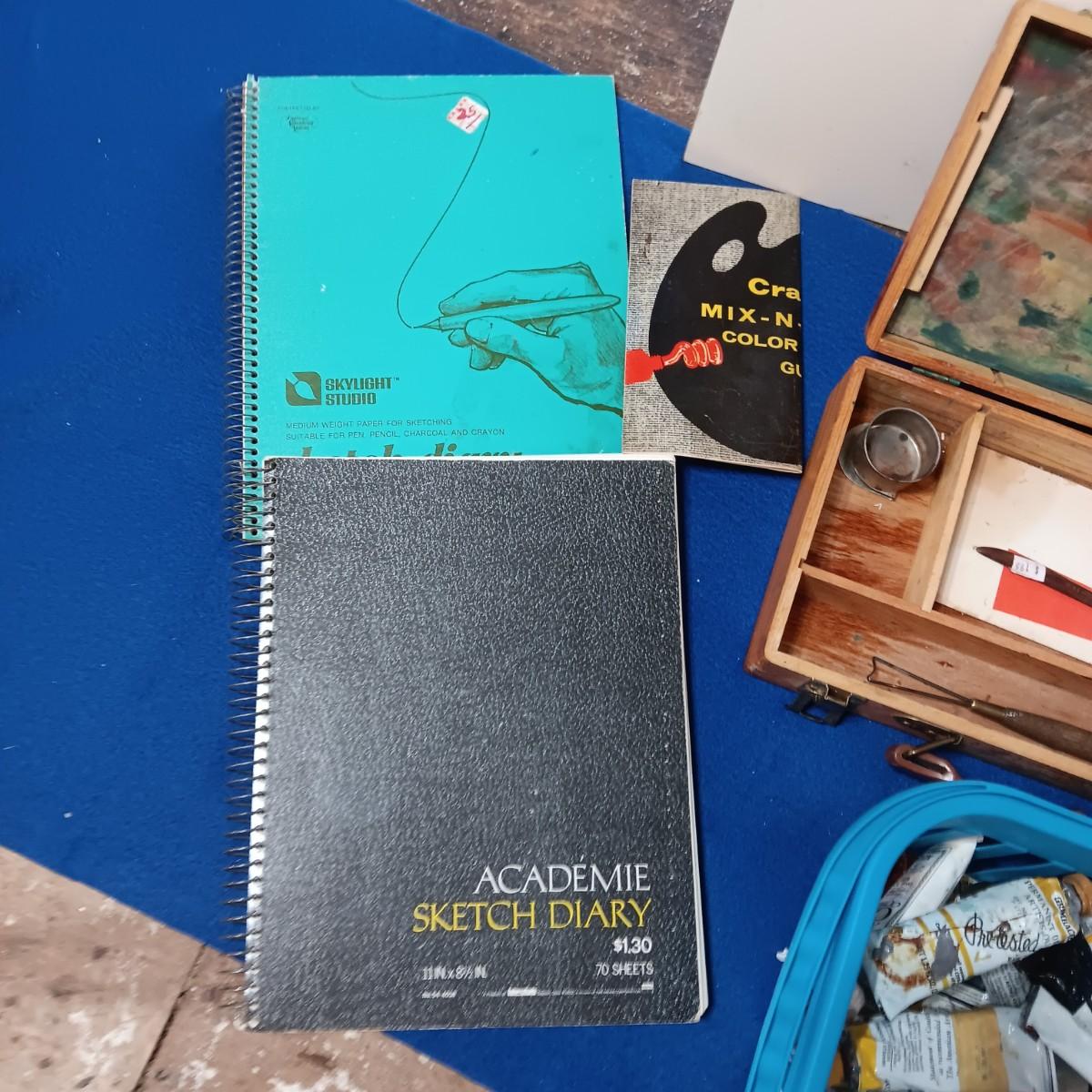 ACRYLIC PAINTS, SKETCH BOOKS, THREE 8 X 10 CANVAS AND ARTISTS WOODEN BOX