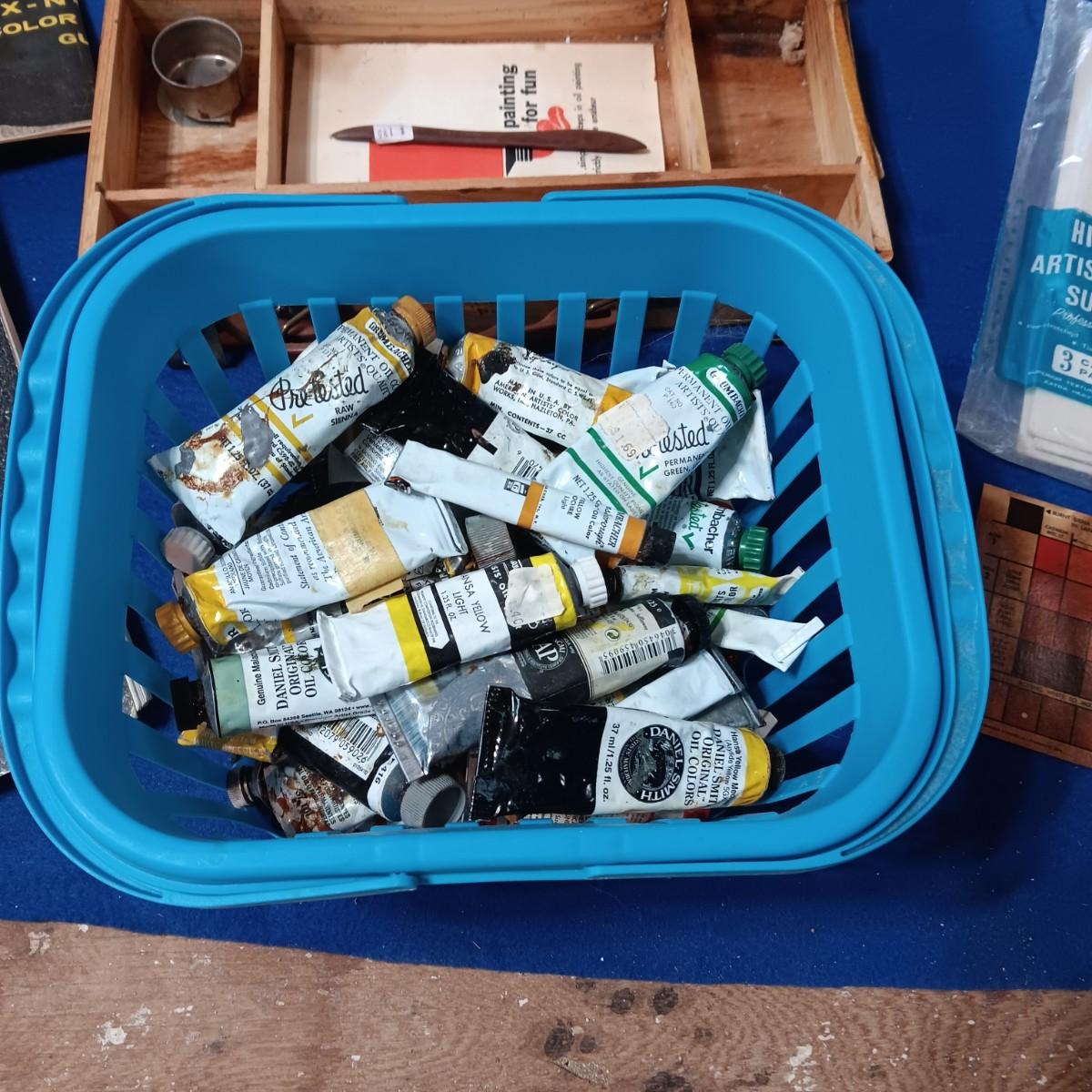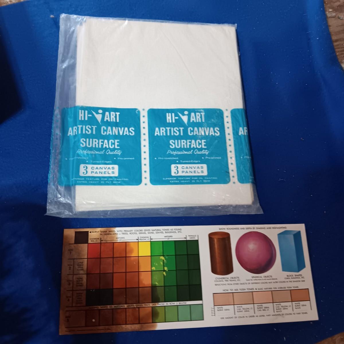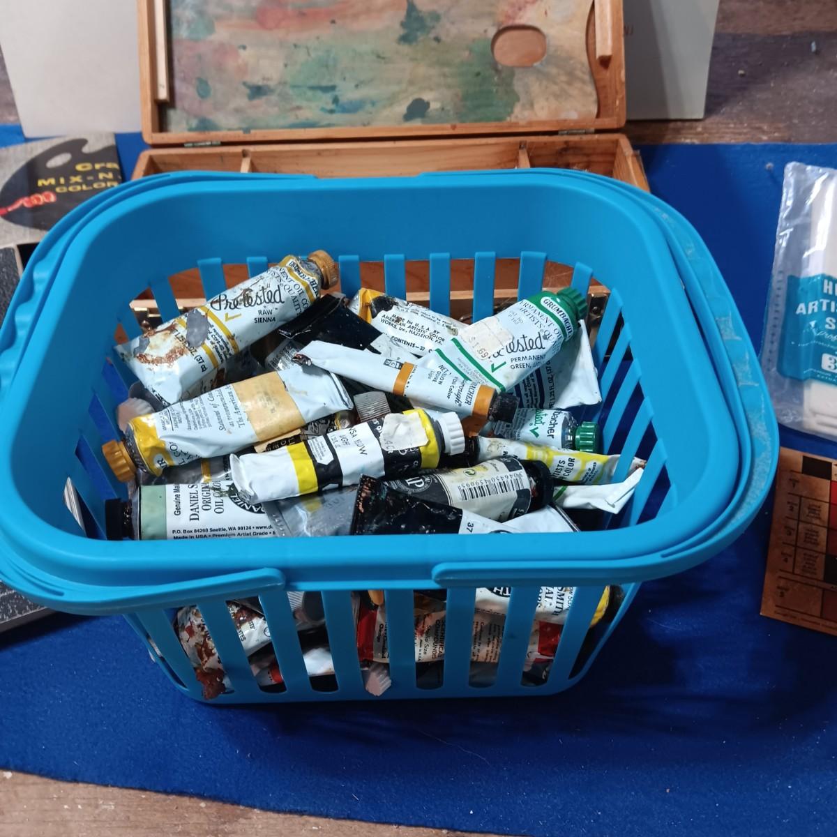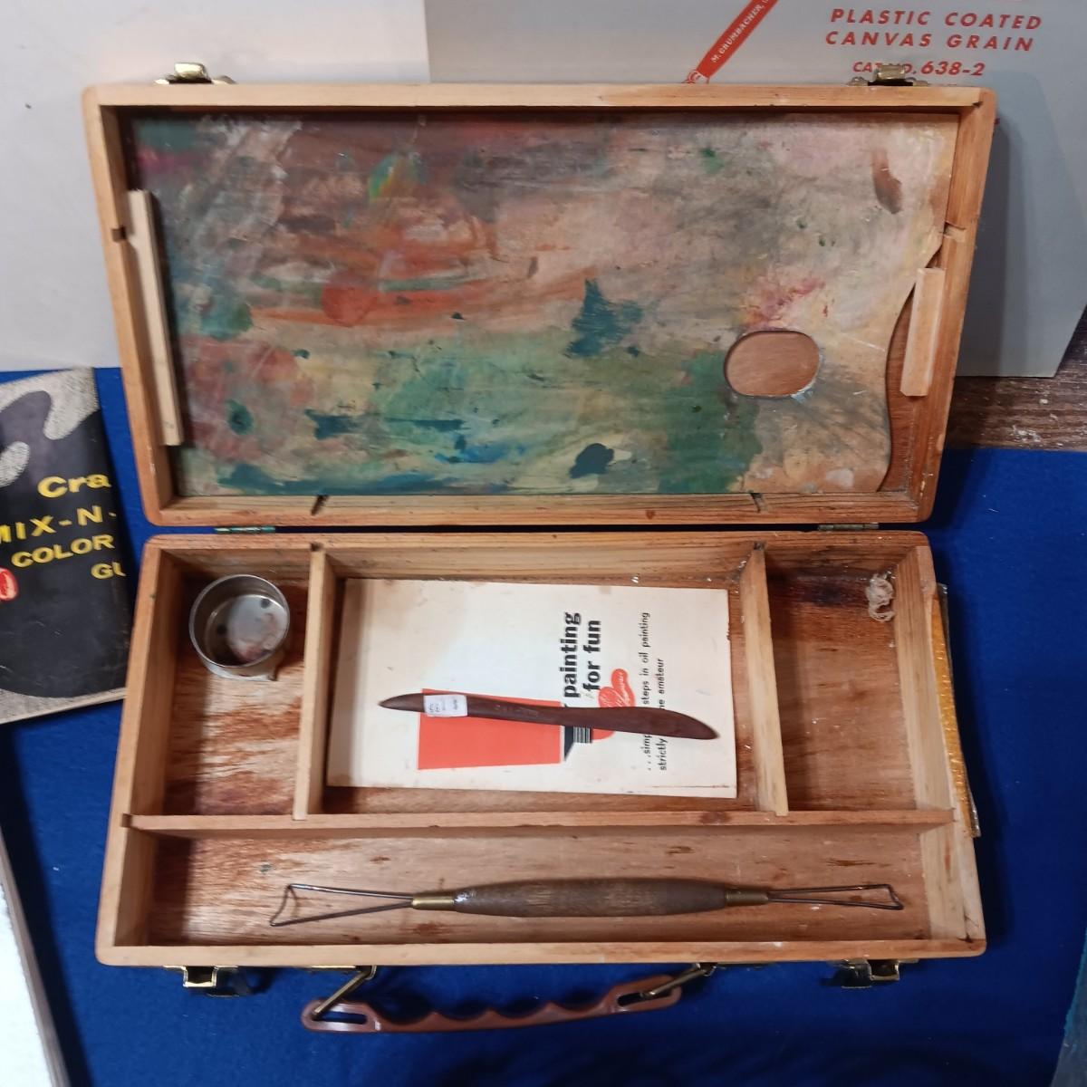 ACRYLIC PAINTS, SKETCH BOOKS, THREE 8 X 10 CANVAS AND ARTISTS WOODEN BOX