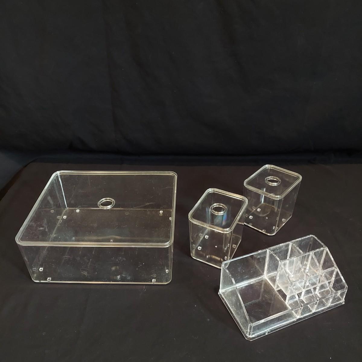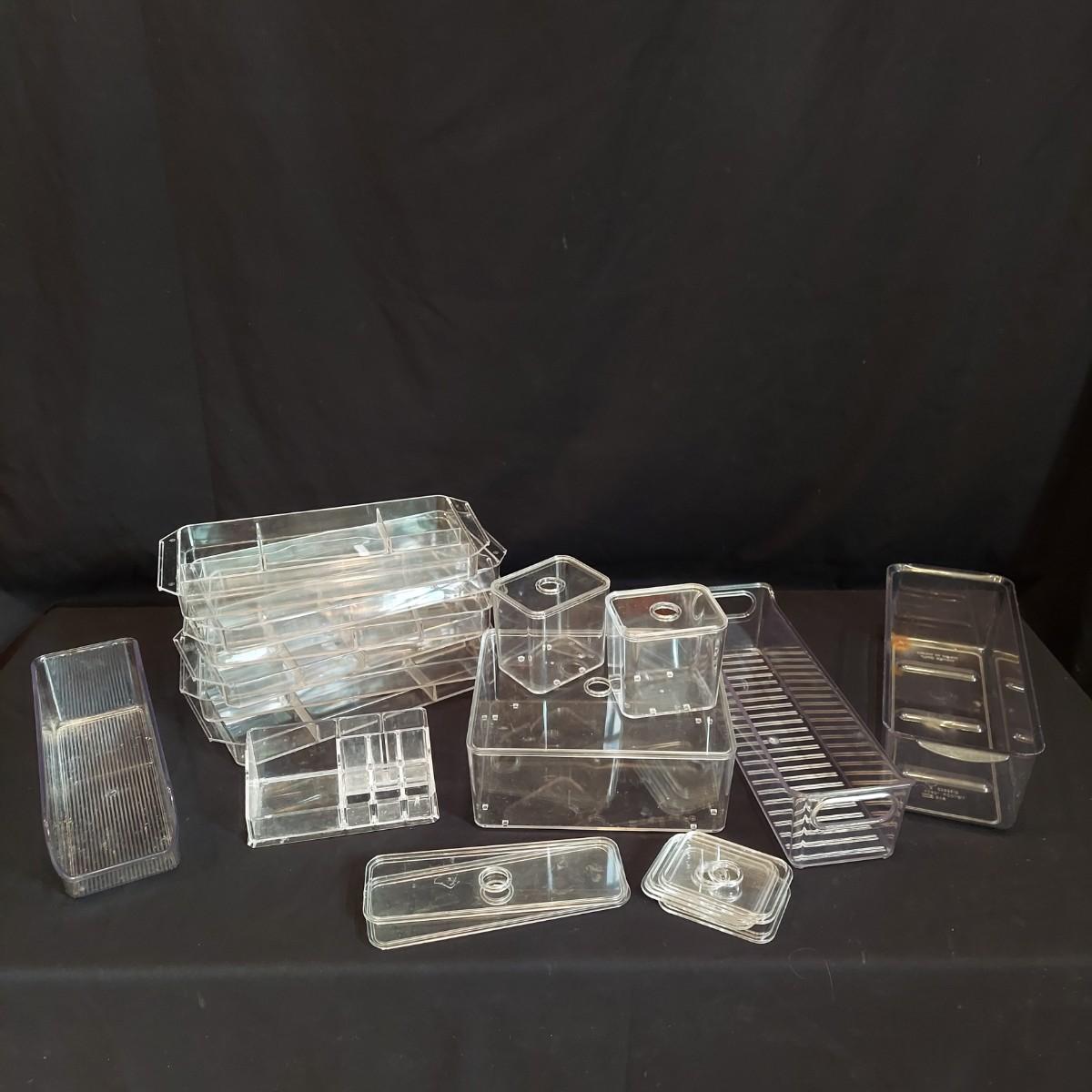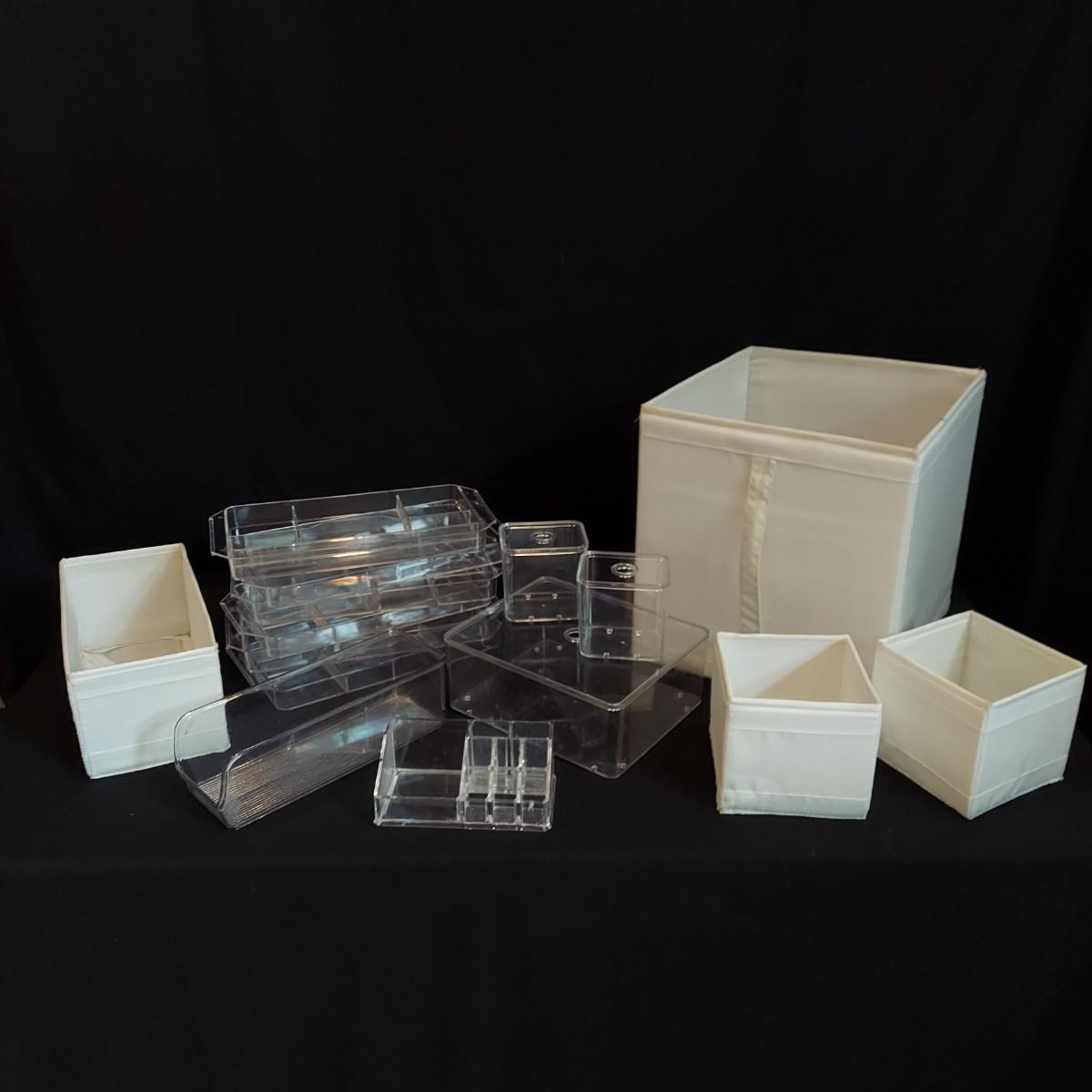 Lot of many cloth and acrylic bins. There are six clear acrylic drawer organizers and 3 clear acrylic "fridge" bins. They range from 11-14" long. Also includes three containers with lids, a counter top organizer and extra lids. The large acrylic container is 8 x 9.5 x 4"H. The two small containers are 4 x 3 x 4"H. Plus two large cloth bins that are 13" cubed with three smaller cloth bins. Shipping available. Shipping certain items can be costly. We suggest contacting our preferred local shipping provider, Postage Express, with dimensions and getting an estimate before bidding: (828) 670-5501 or postageexpress@yahoo.com.