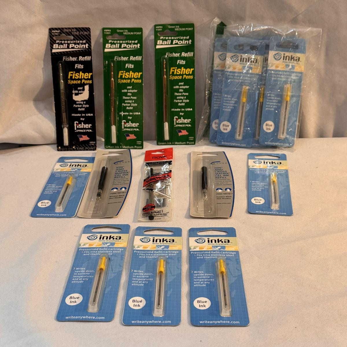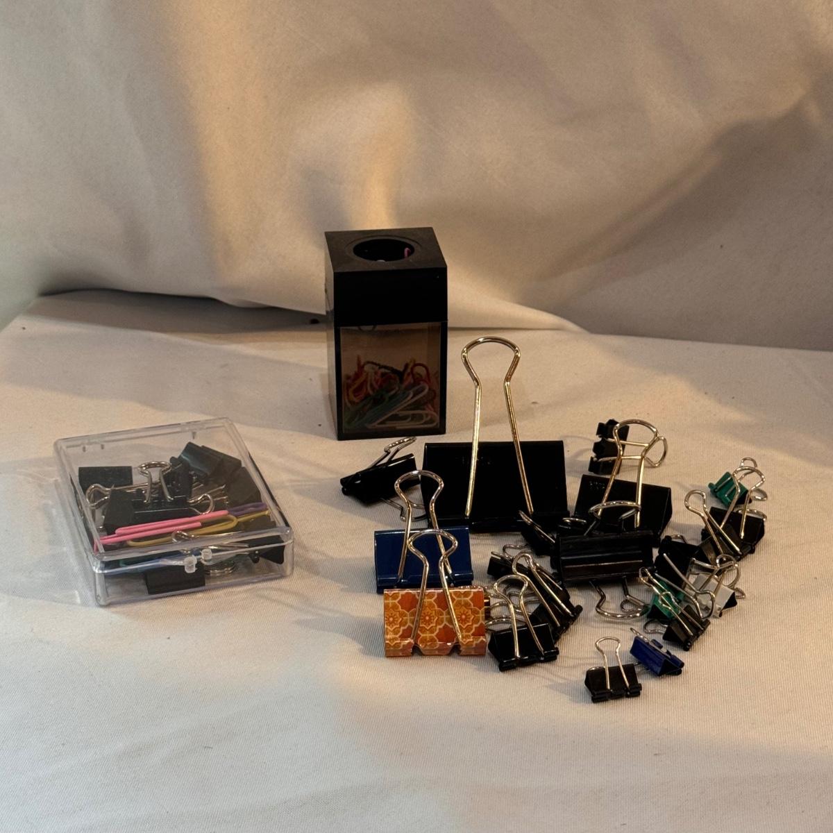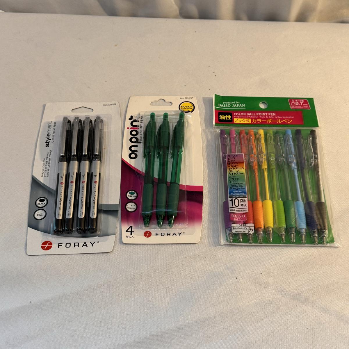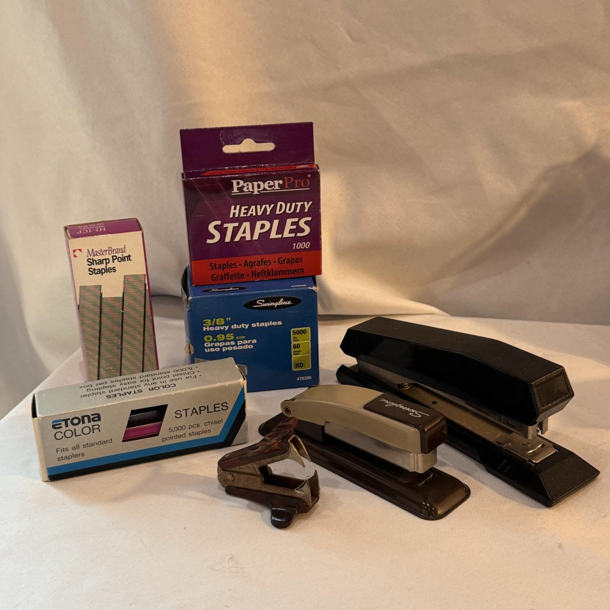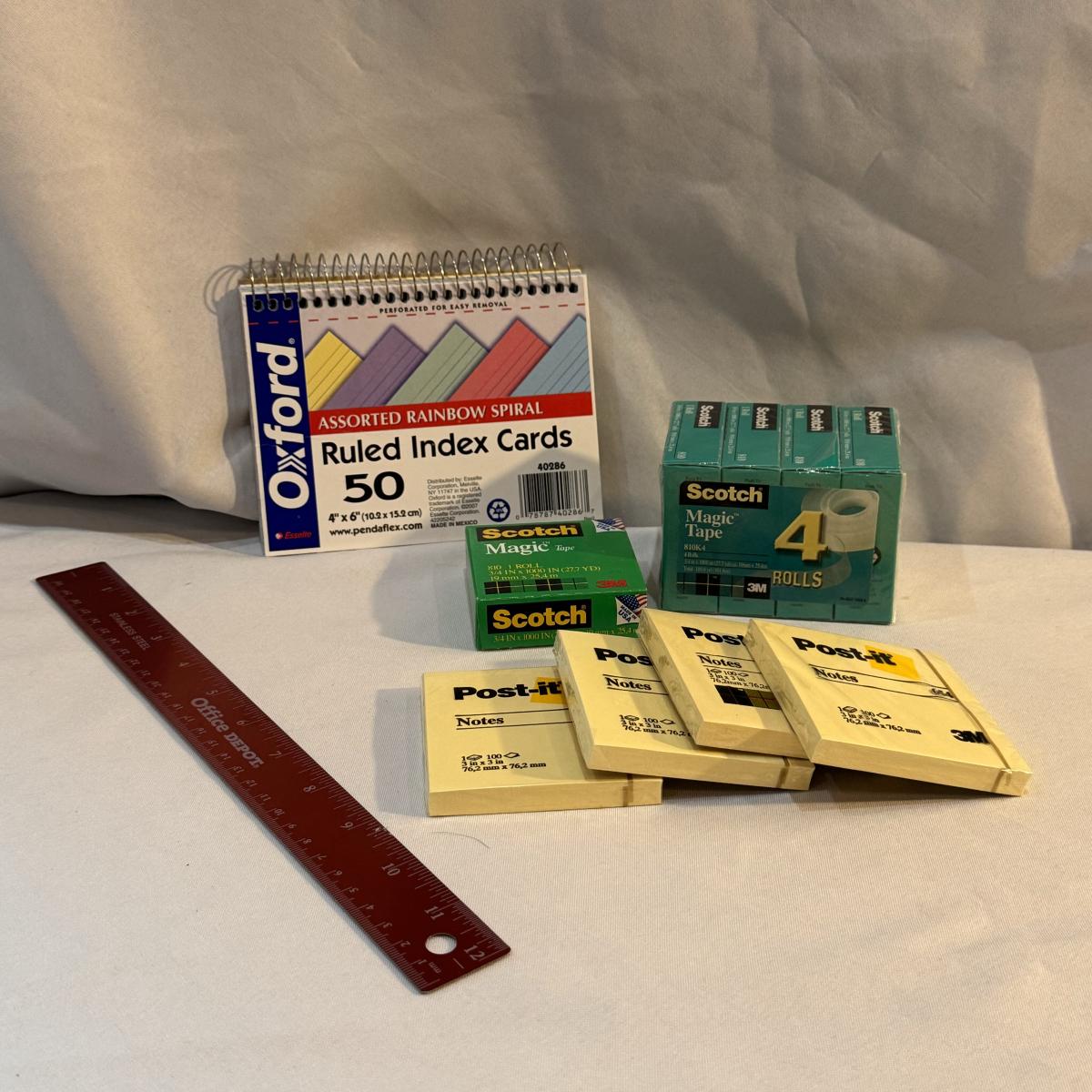 This lot includes two standard staplers (one from Swingline), one staple remover that reads Ace on the side, one heavy duty stapler from Office Depot, four boxes of various kinds of staples, one Ativa paper shredder model no. MD1250, several metal paper clamps and paper clips, six Office Depot professional yellow writing pads, one small writing notepad, seven packs of multi-purpose stick-on labels, three large writing pads, several packs of clear mailing labels and high visibility labels, three packs of mini-sheets laser labels, two Boston pencil sharpener in various sizes, one Office Depot ruler, four packs of Post-it notes, five rolls of Scotch magic tape, ten Inka pressurized refill cartridges, three pressurized ballpoint Fisher space pens refills, three packs of two broad Sharpies, one 5-pack of Office Depot pencil pillows, pack of 18 Ticonderoga pencils, four Sharpie highlighters, four Sharpie brush tips, two clipboards, and several other pens. The pencil sharpeners and paper shredder powered on when plugged in. Shipping available.