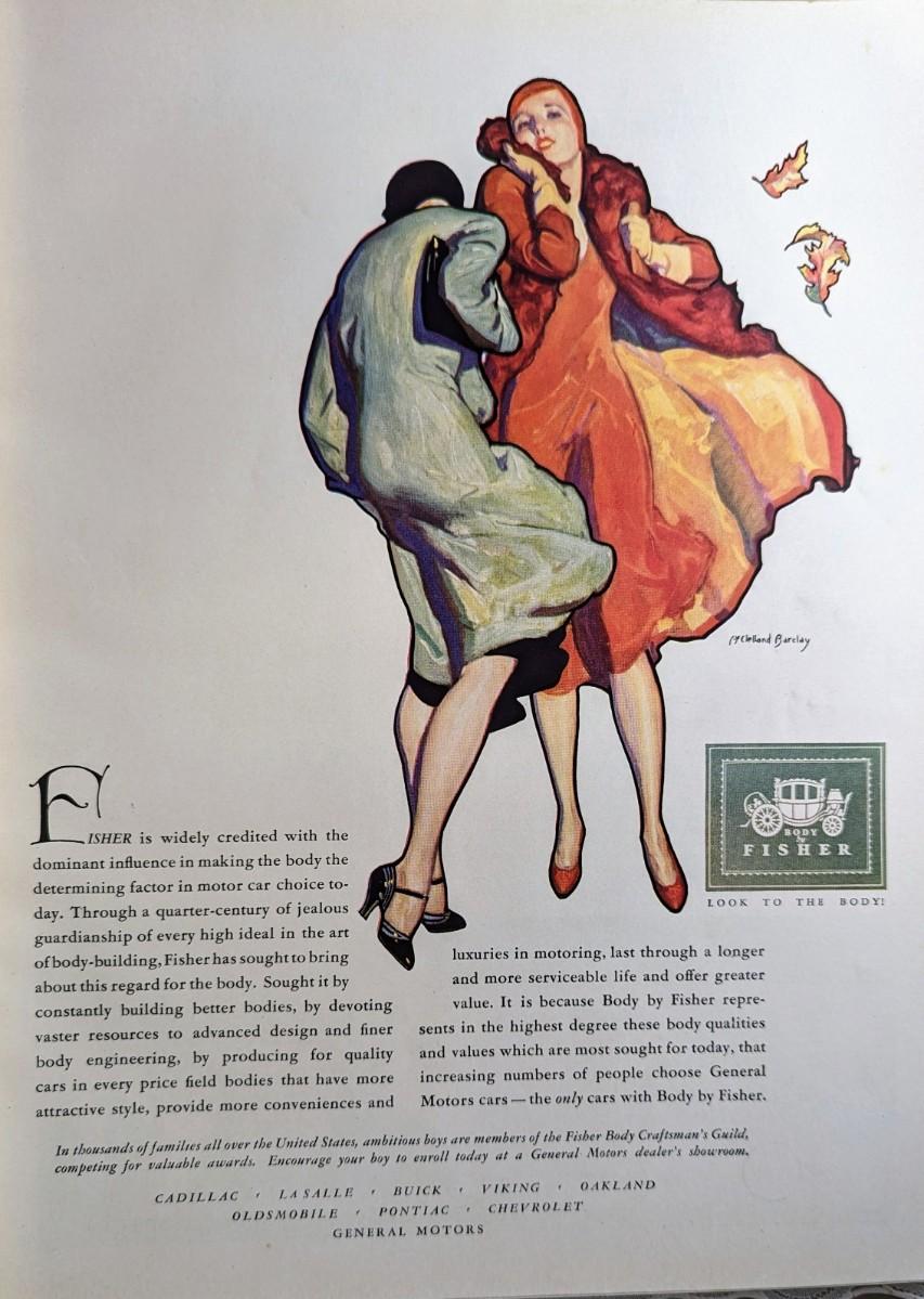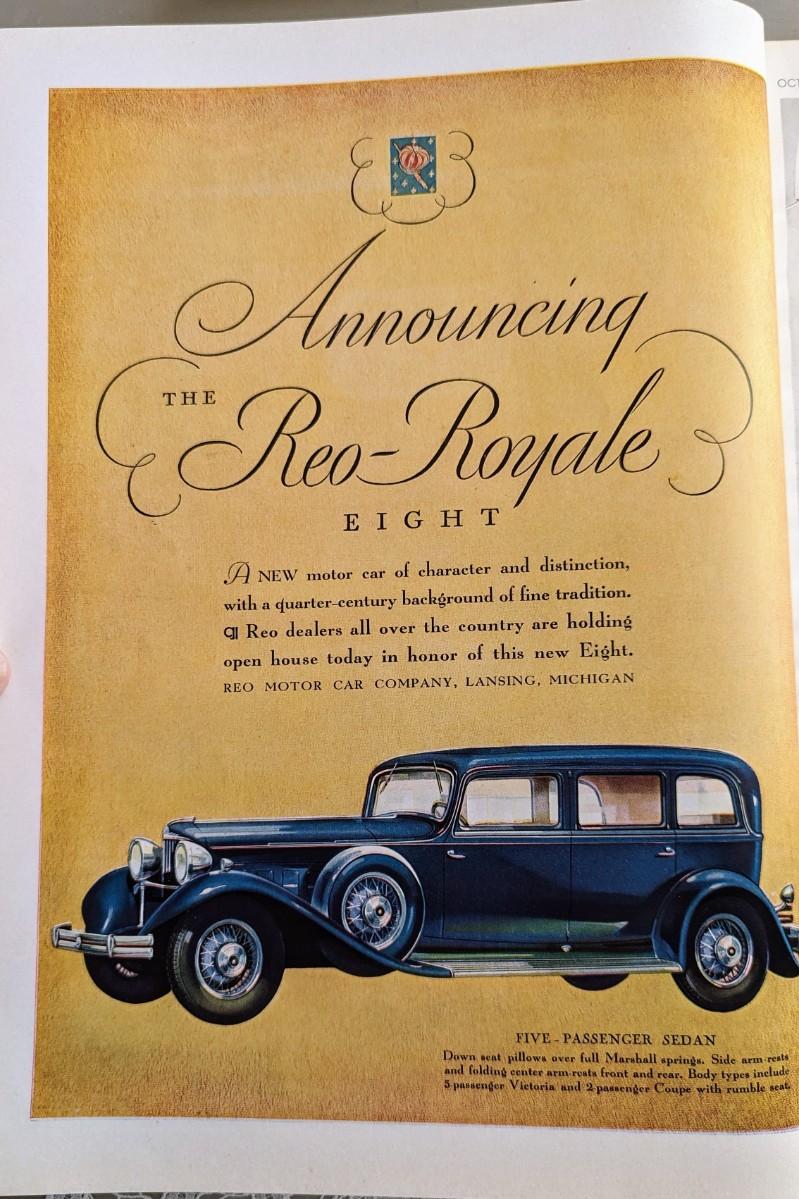 Car ads for General Motors-Body by Fisher, Pierce Arrow and Reo Royale Eight.