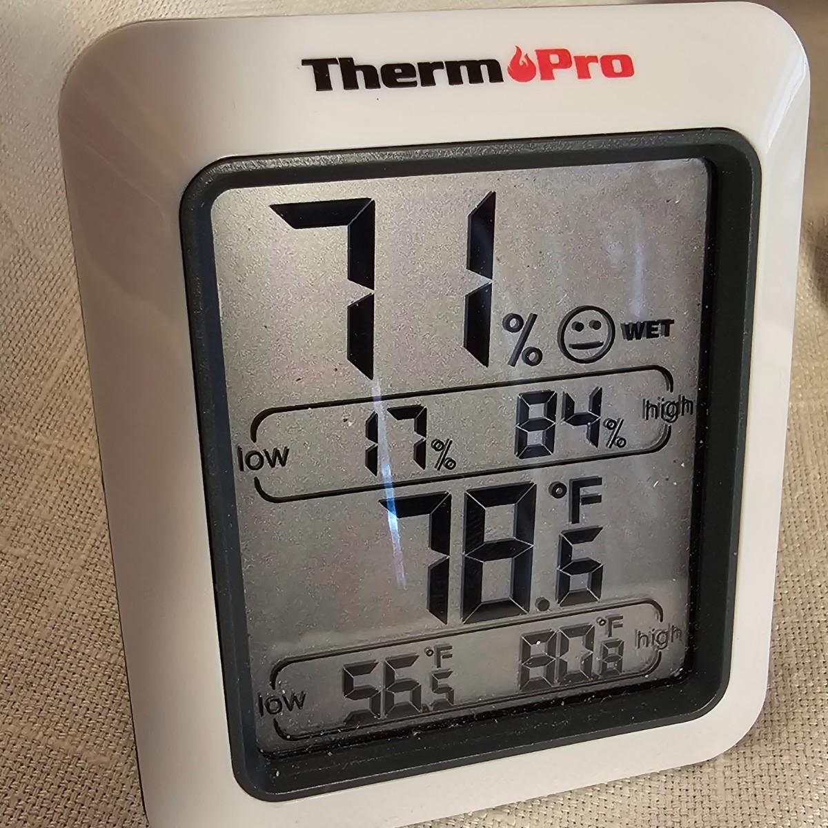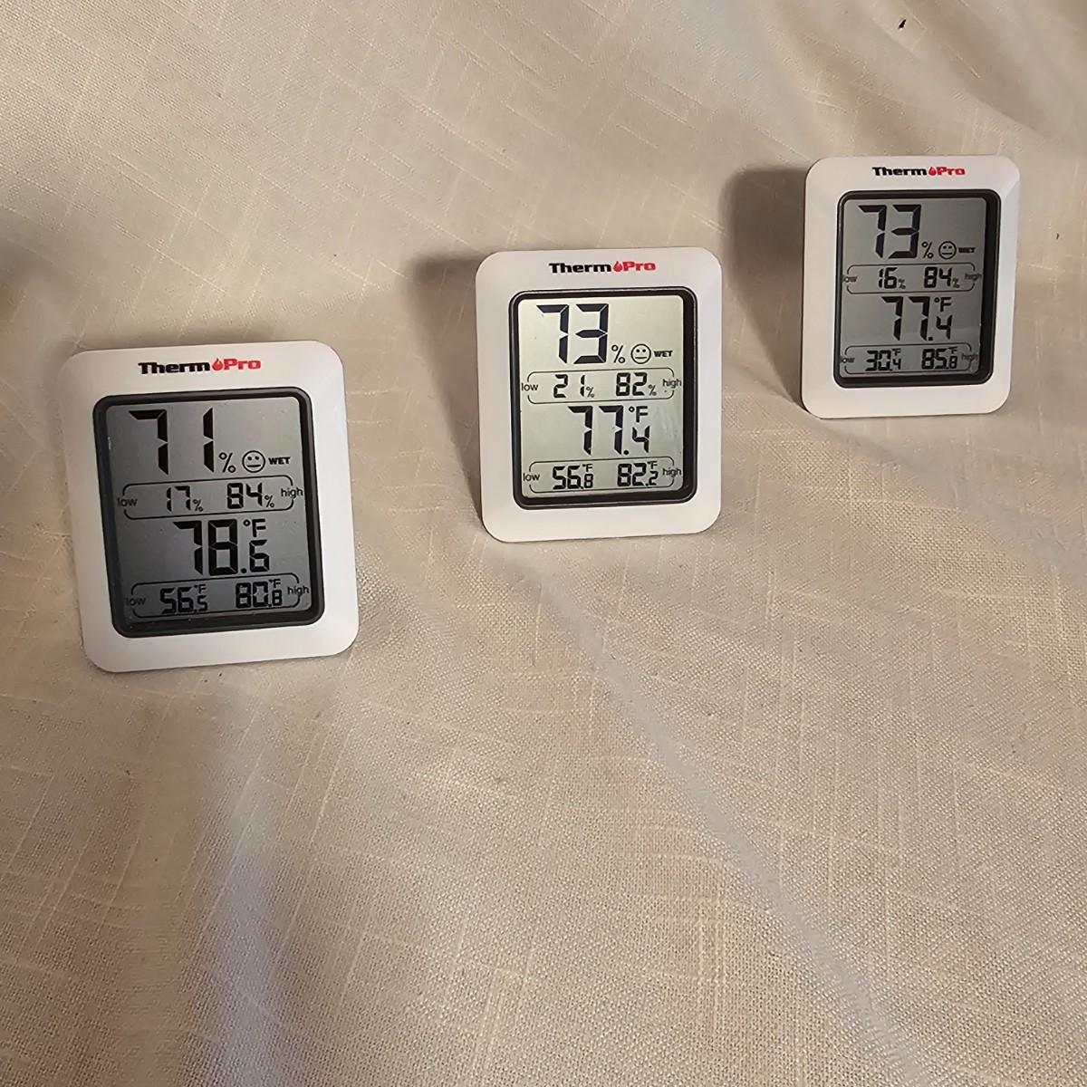 Combination click and thermometer by Acu-Rite. Runs on one AA battery, tested working. Measures 18" Dia x 2.5" Deep. Three smaller items by Therm Pro are combo thermometer and humidity readouts, with high and low range indicators. 2.5" x 1.5" x 3"H, runs on single AAA battery. See photos for details. Shipping available.