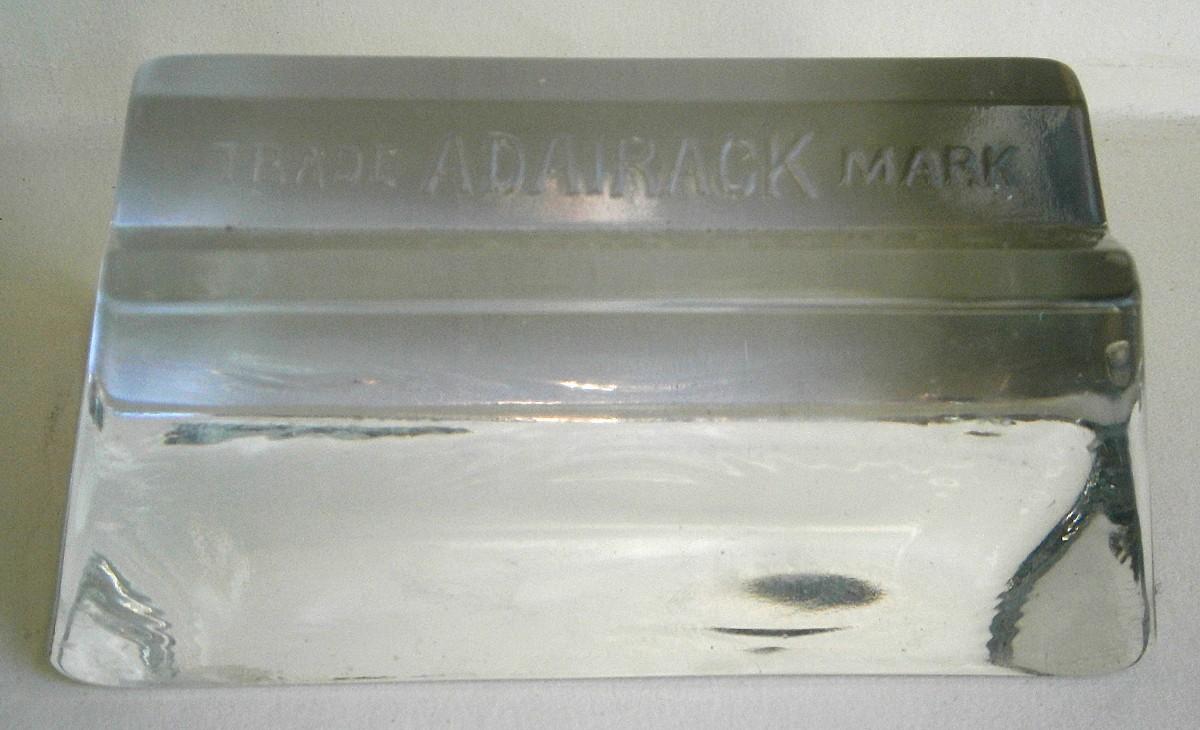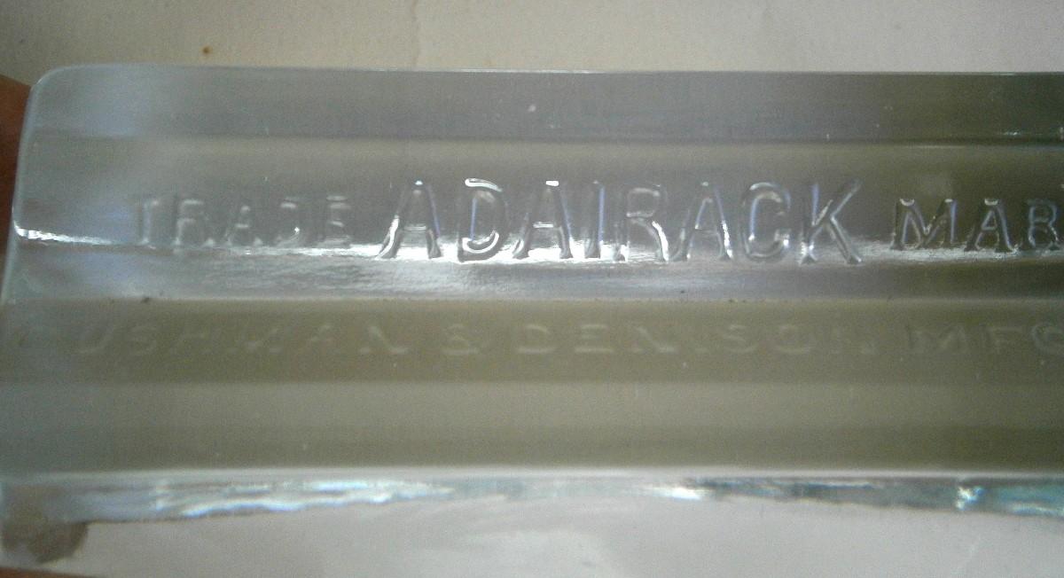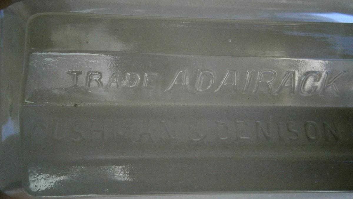 "ADAIRACK" Advertising Glass Paperweight from Cushman & Denison Mfg. Co., 4 1/2 in. long.