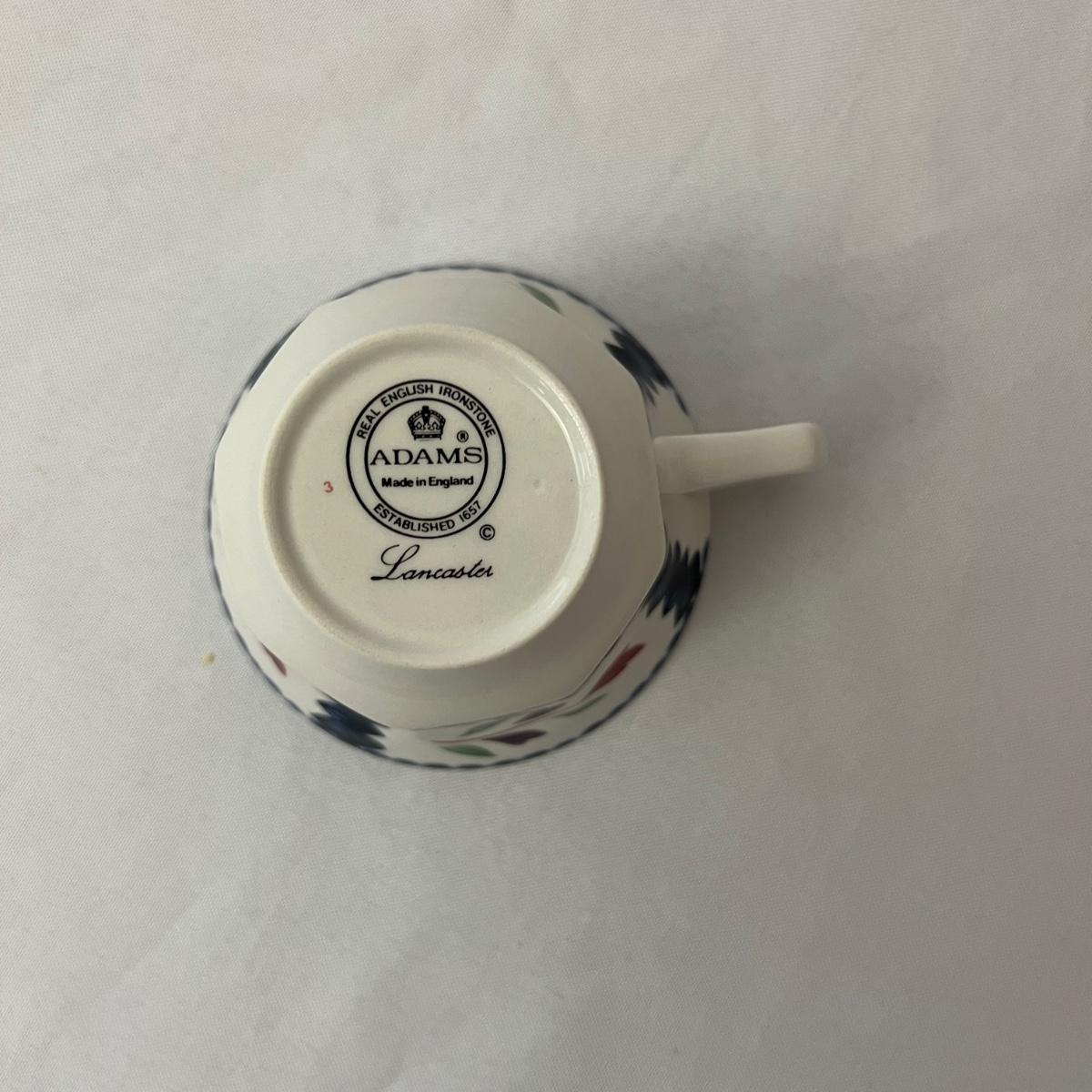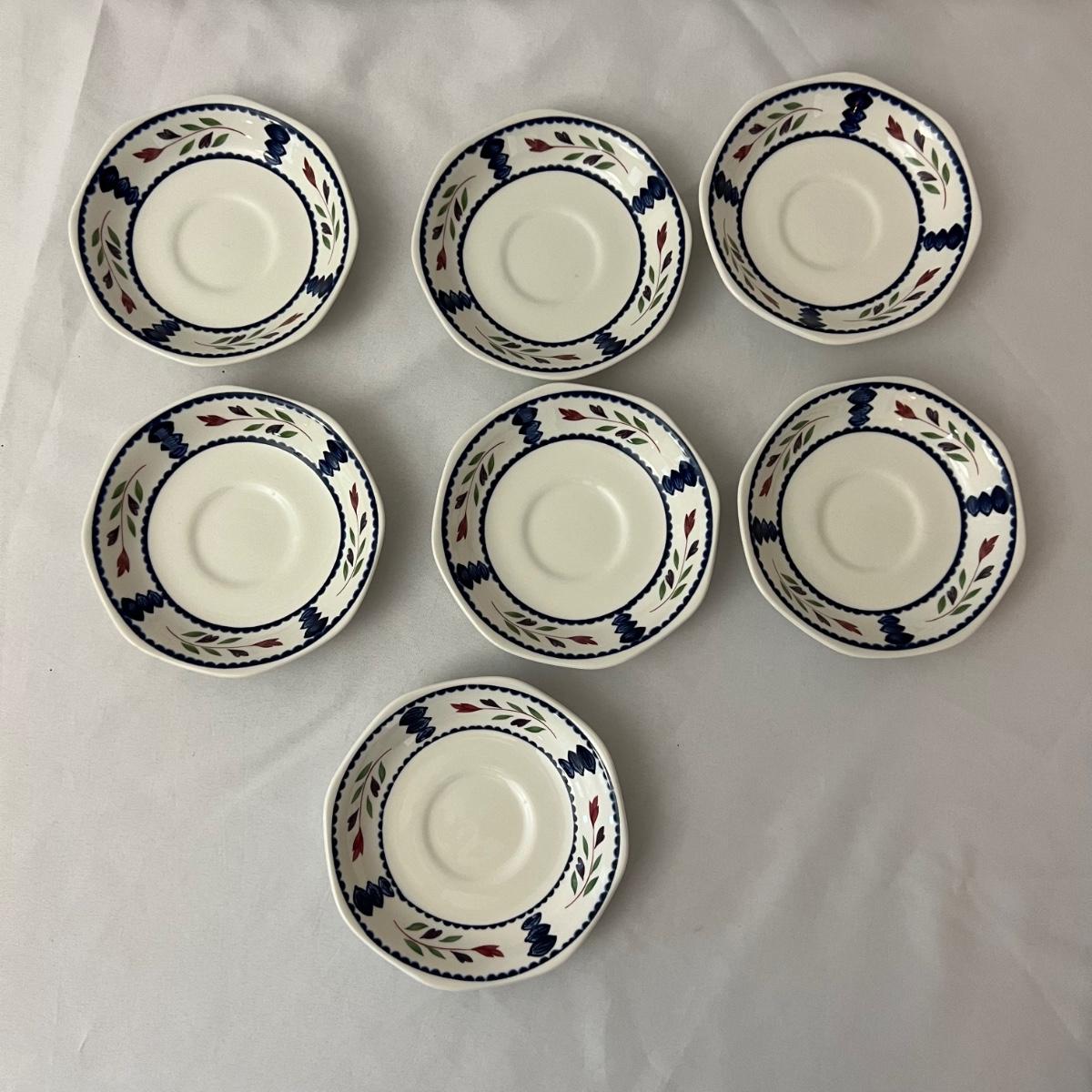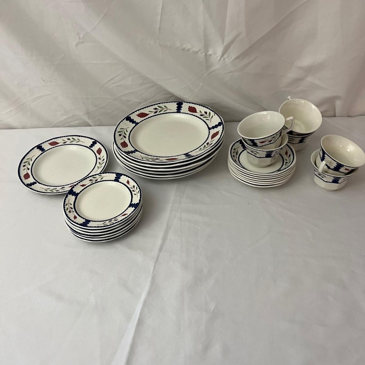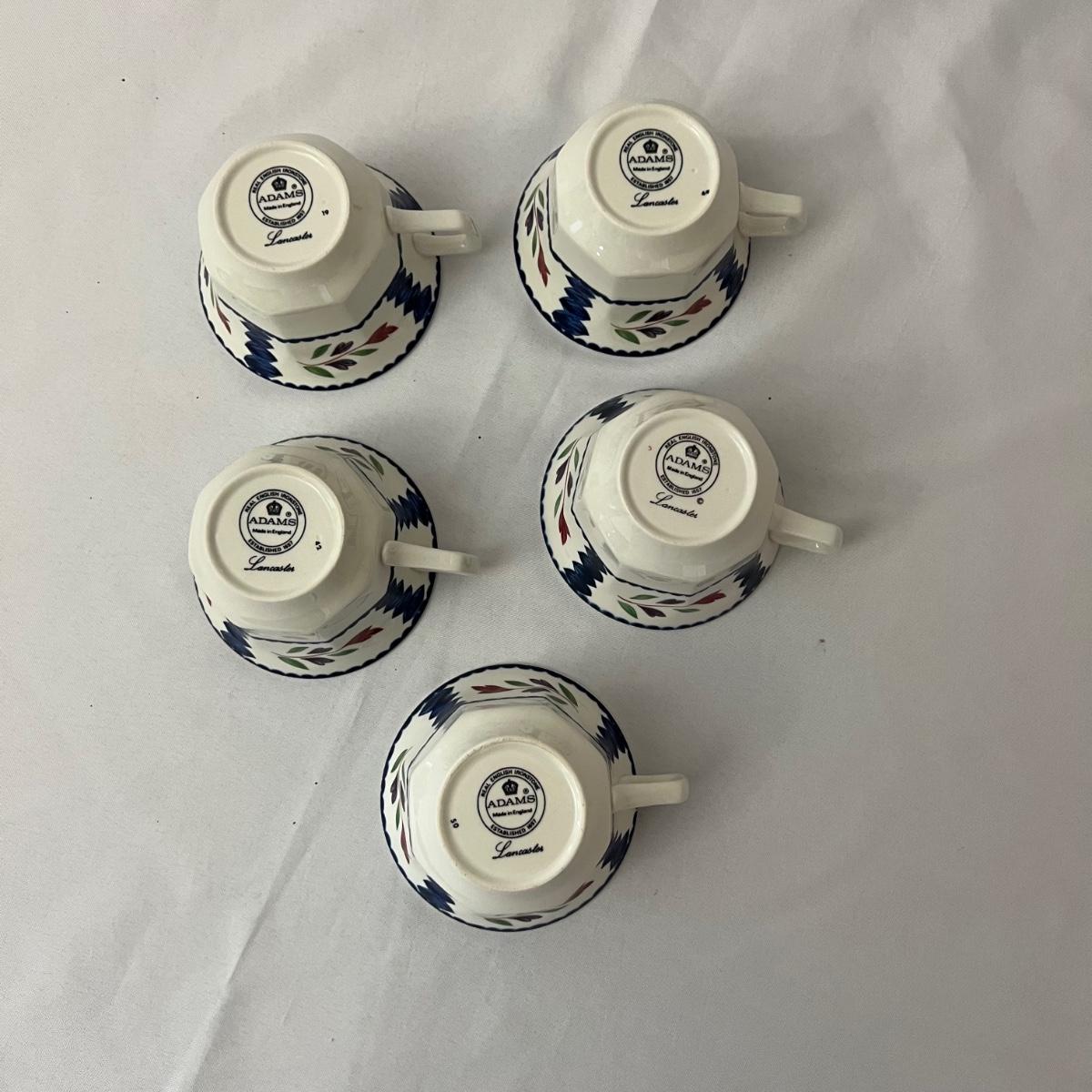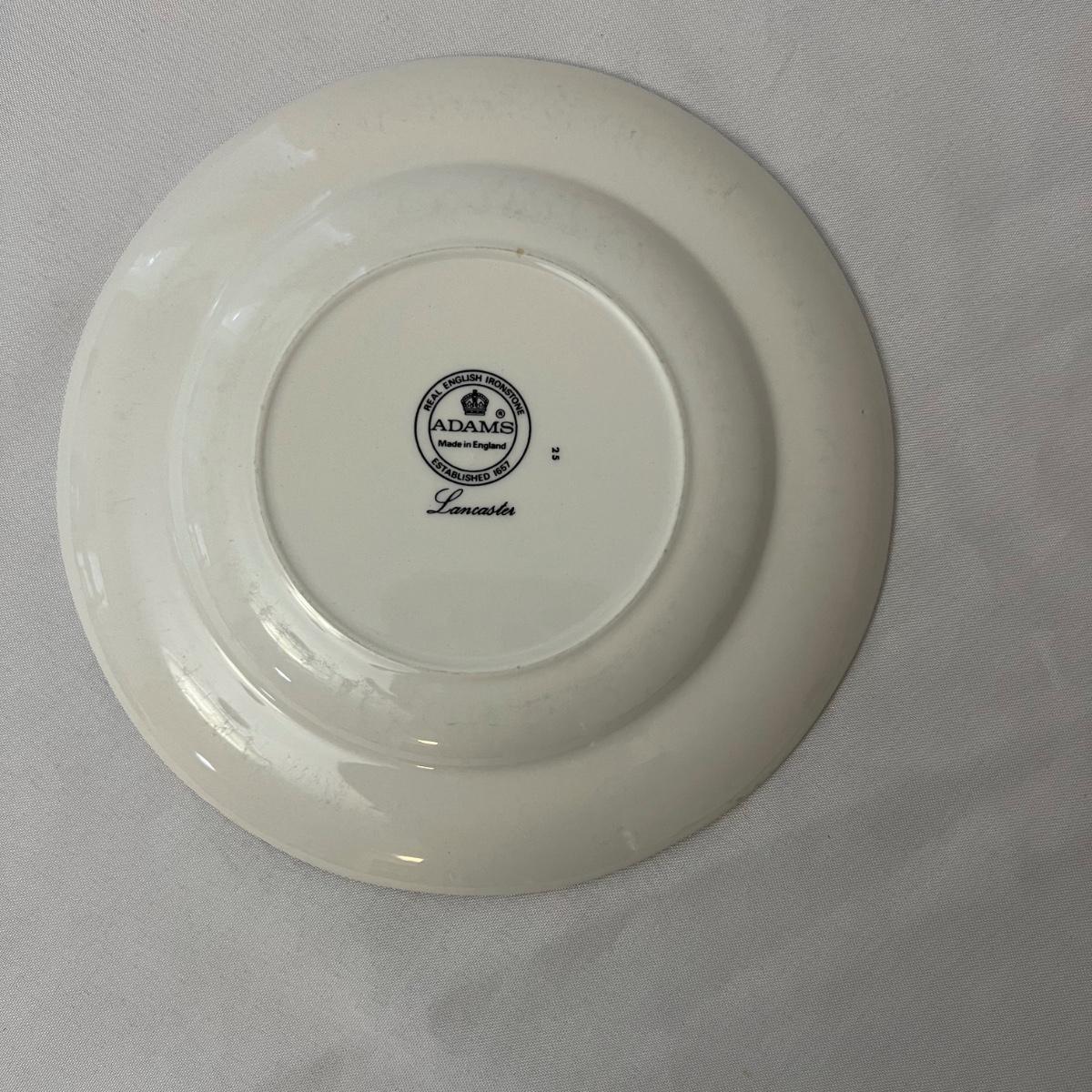 Adams ironstone china in the Lancaster pattern. Seven saucers 6”D, six coffee cups 3.75”D x 2.5”H, six small plates 6”D, one plate 8”D and six dinner plates 10”D.