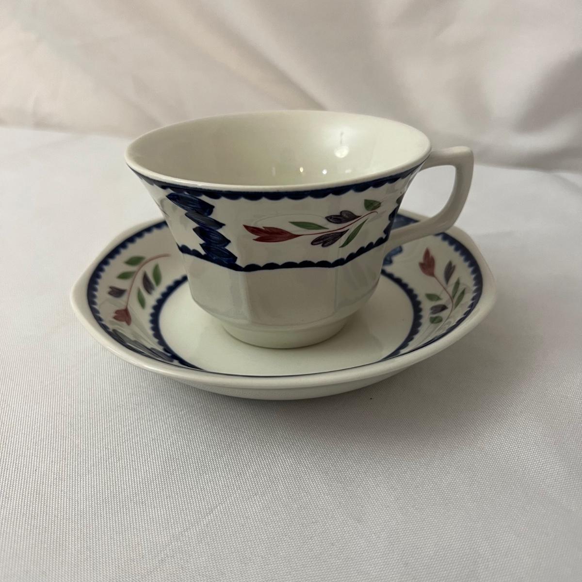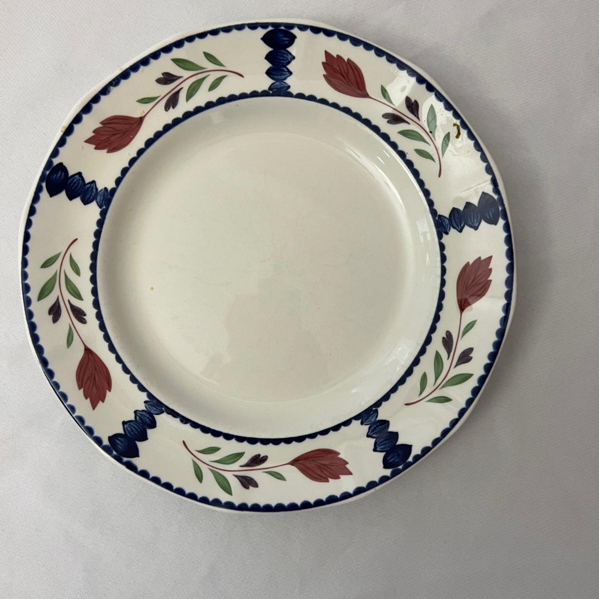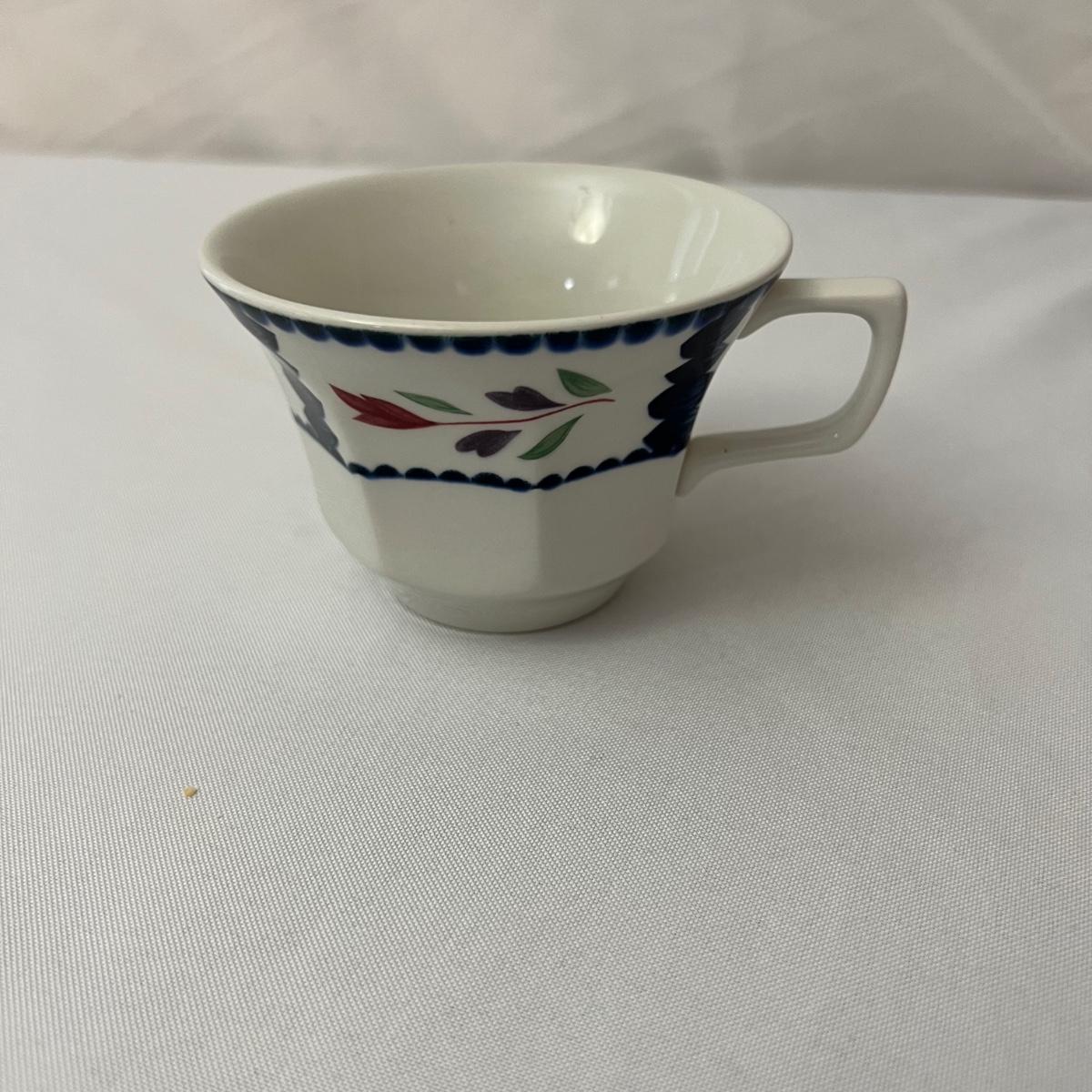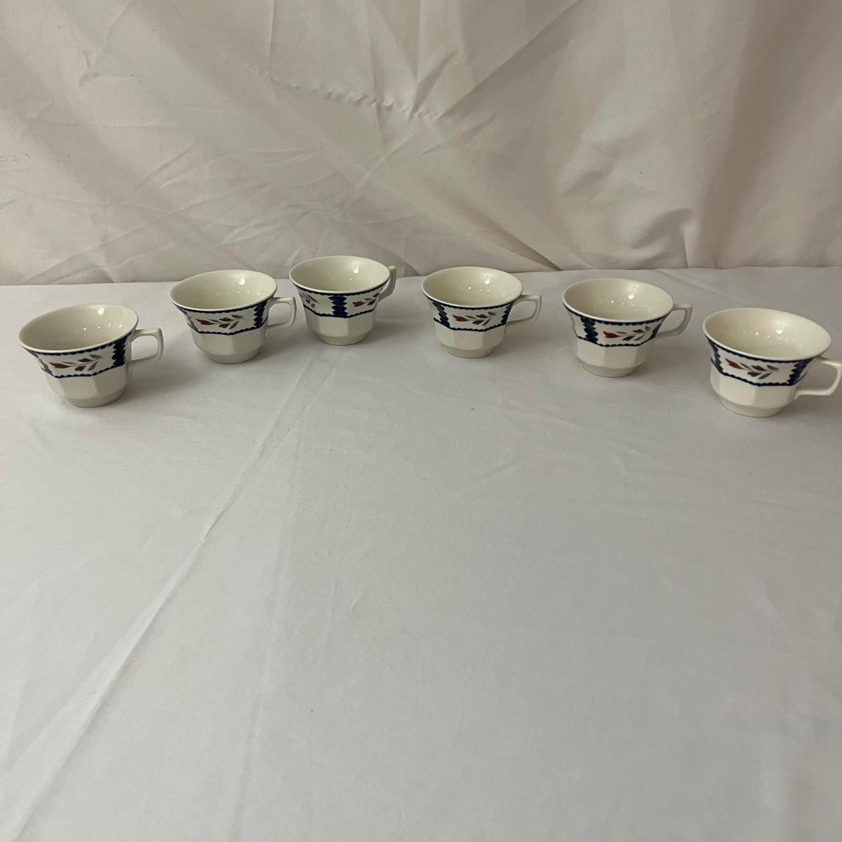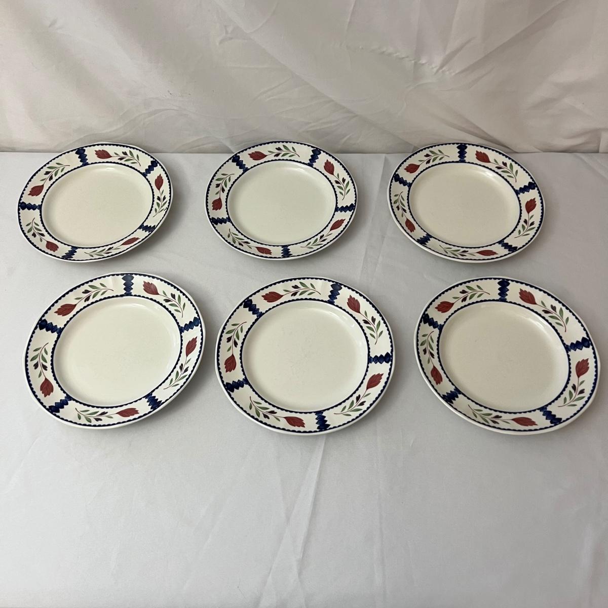 Adams ironstone china in the Lancaster pattern. Seven saucers 6”D, six coffee cups 3.75”D x 2.5”H, six small plates 6”D, one plate 8”D and six dinner plates 10”D.