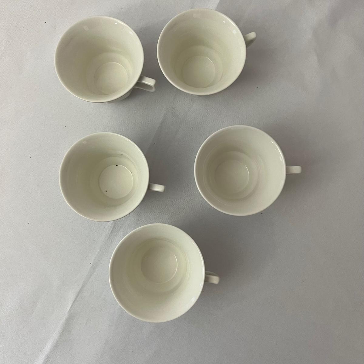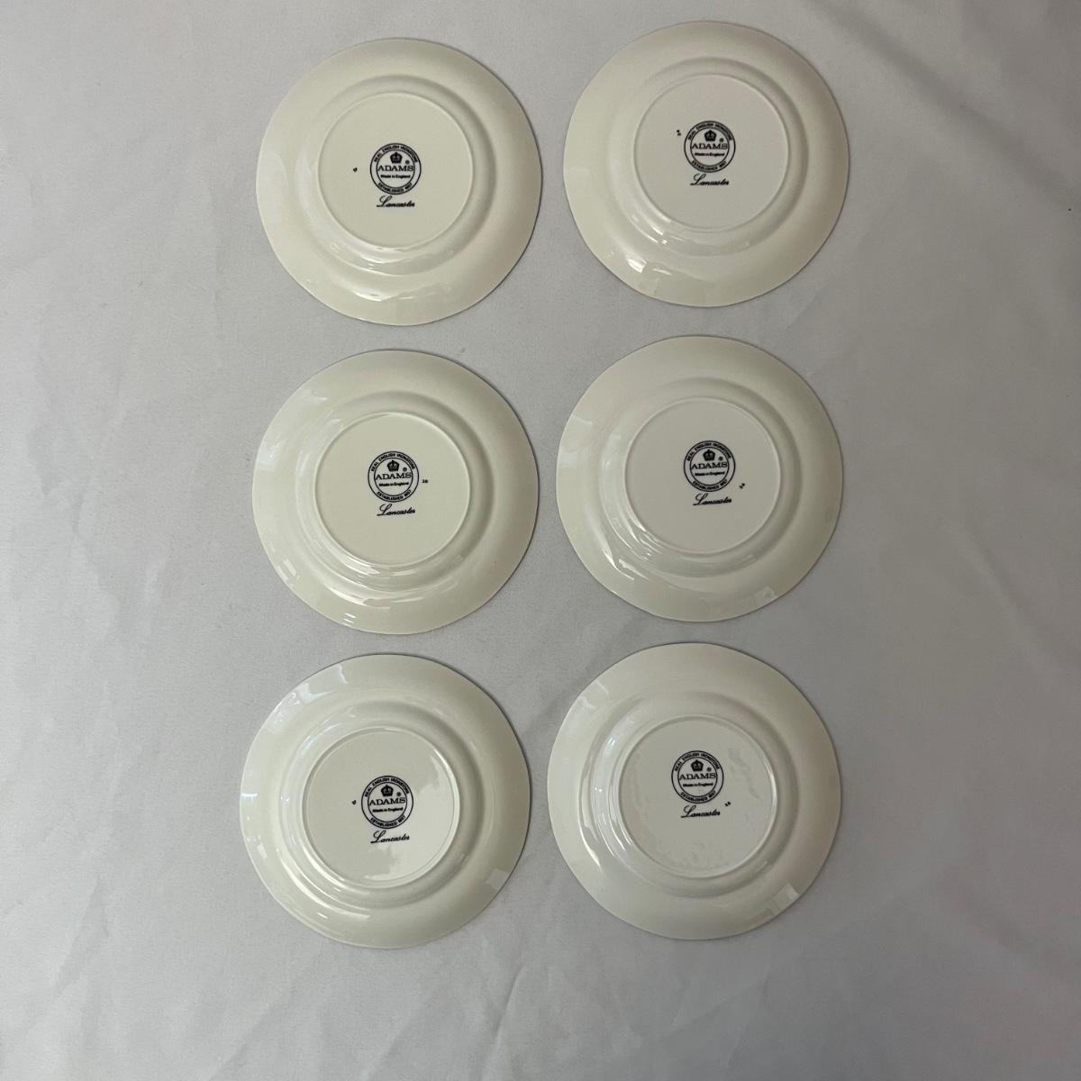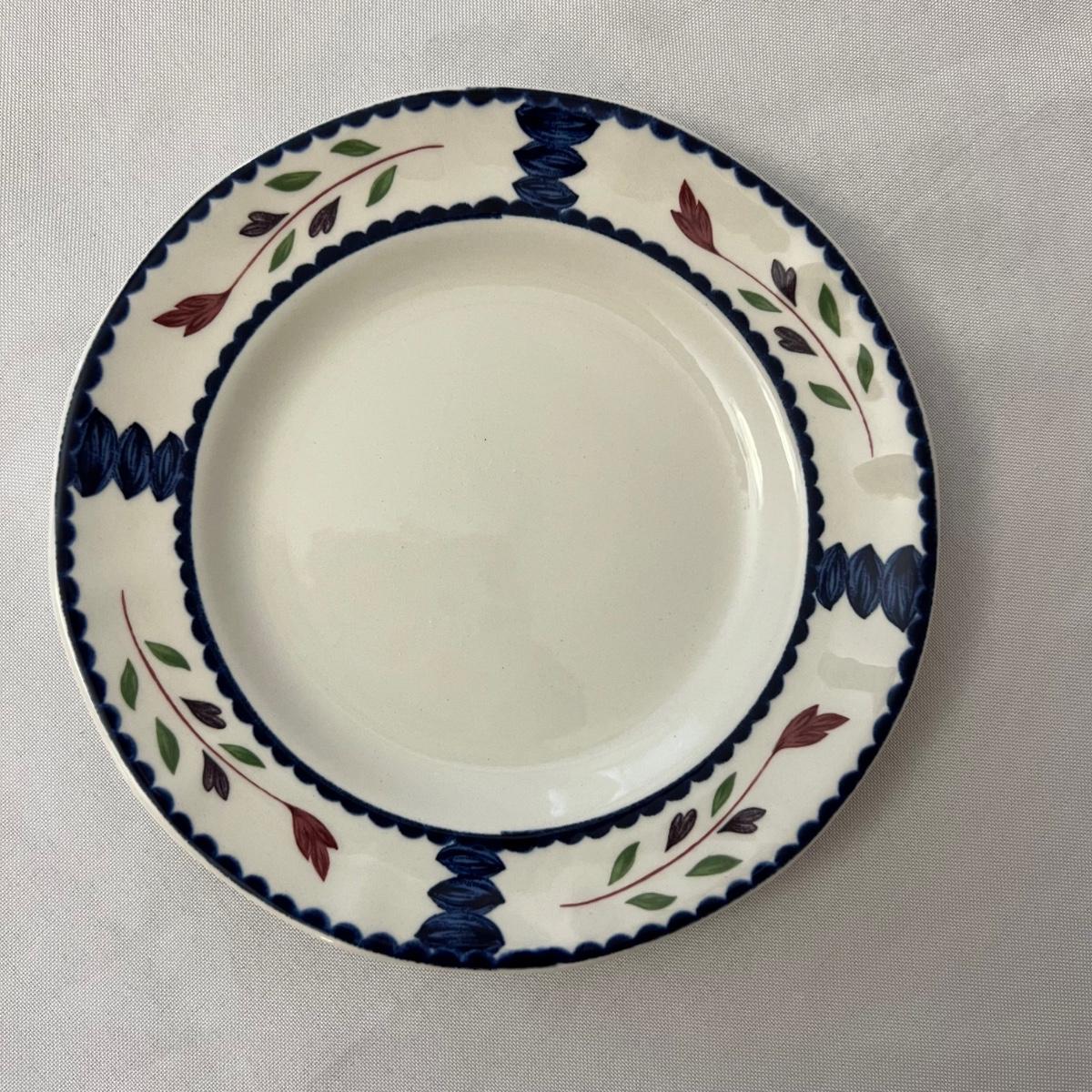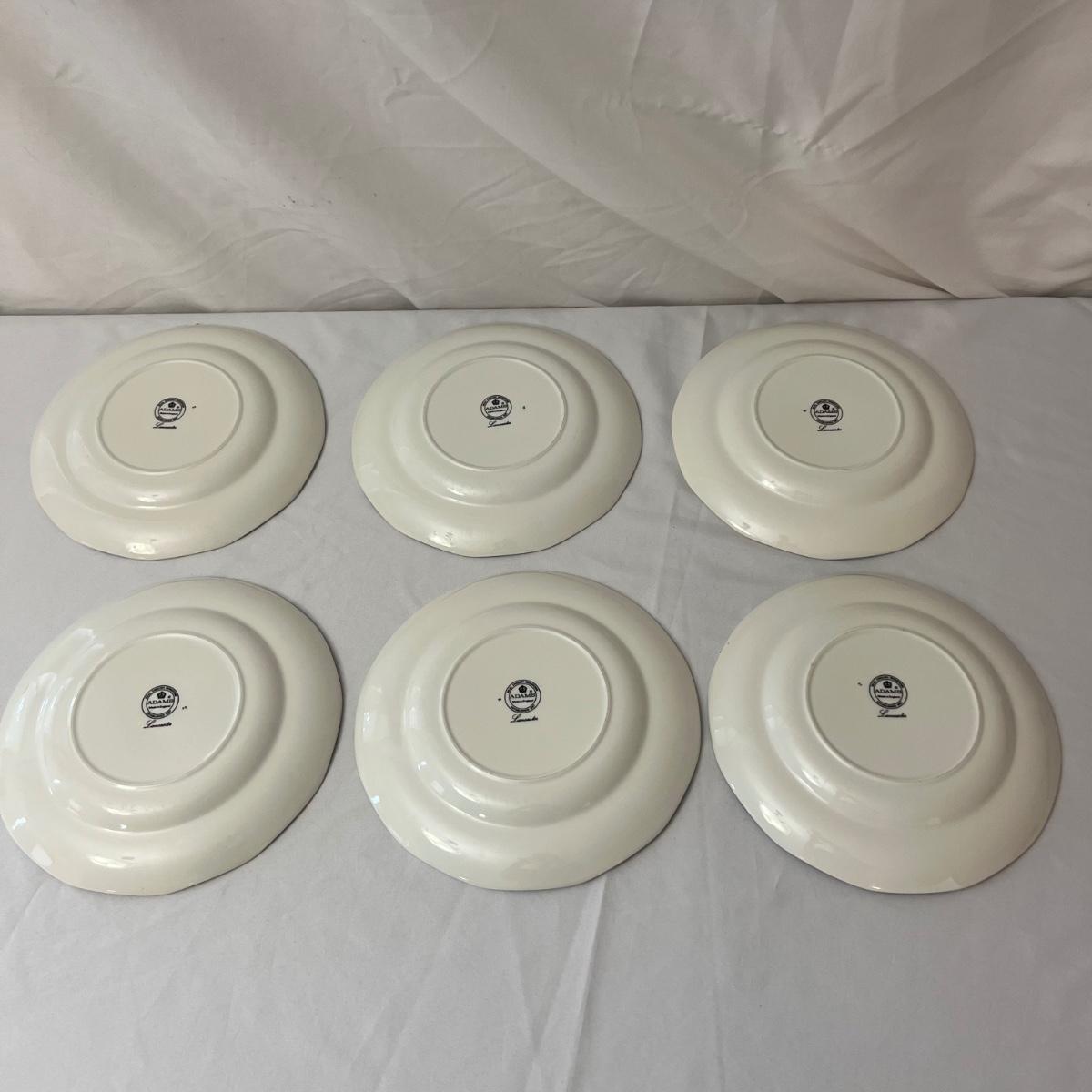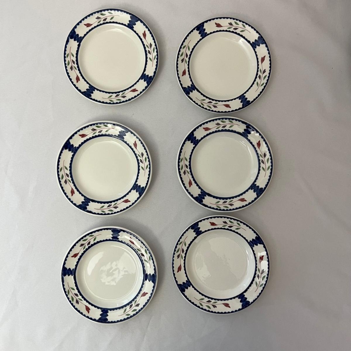 Adams ironstone china in the Lancaster pattern. Seven saucers 6”D, six coffee cups 3.75”D x 2.5”H, six small plates 6”D, one plate 8”D and six dinner plates 10”D.
