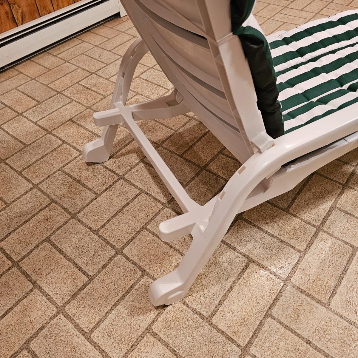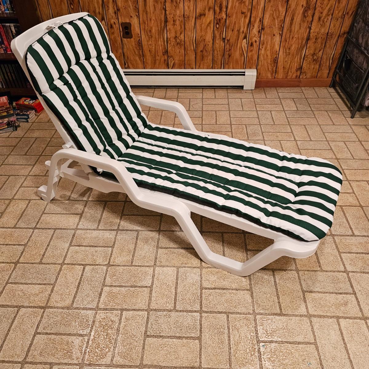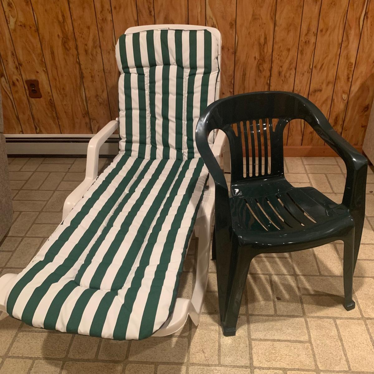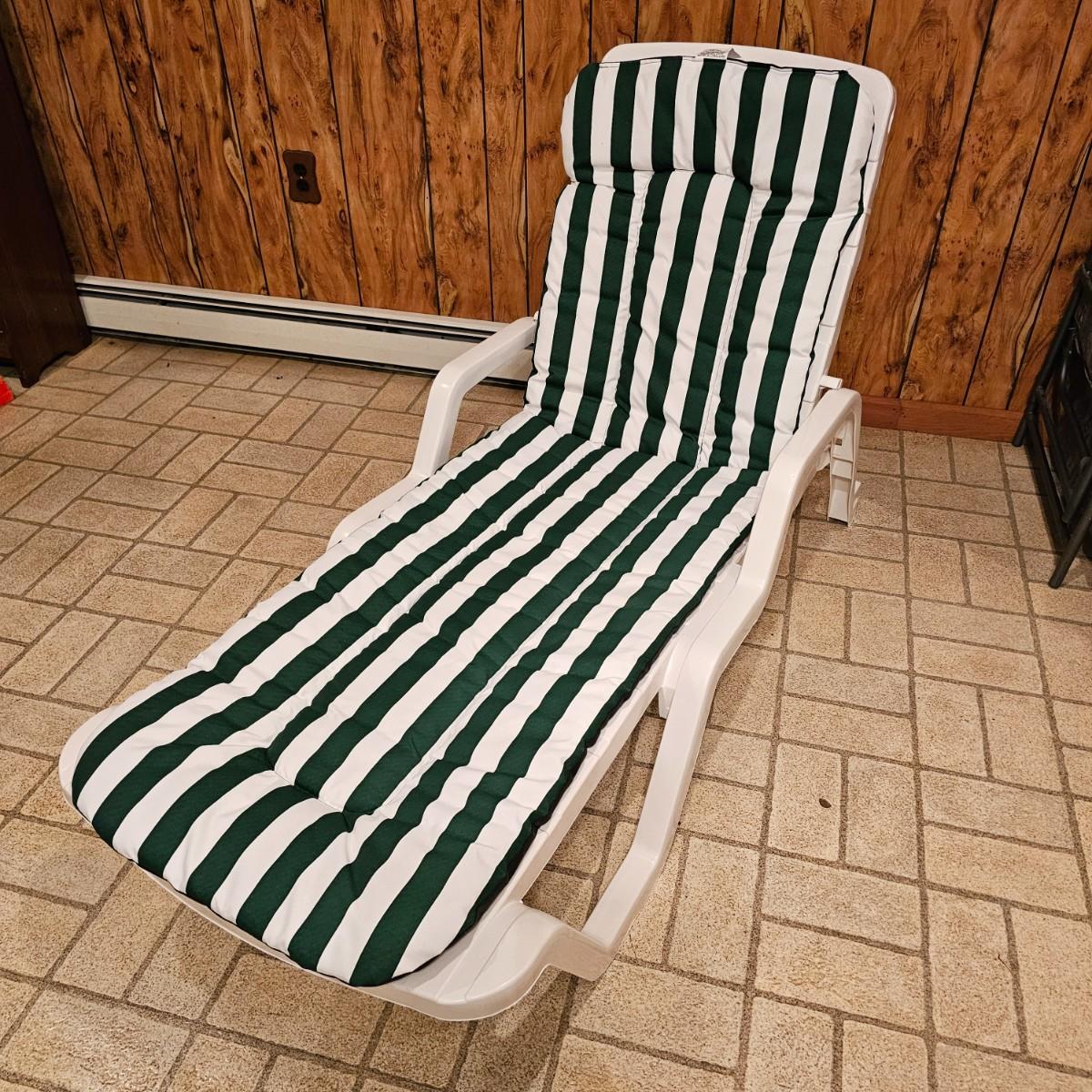 Hard plastic chaise lounge by Adams comes with green/white striped full cushion. Chair has three manual recline positions for back. Measures 27" x 62" x 36"H with 14" seat height. Green plastic patio chair included as well. See photos for details. Local pickup only.