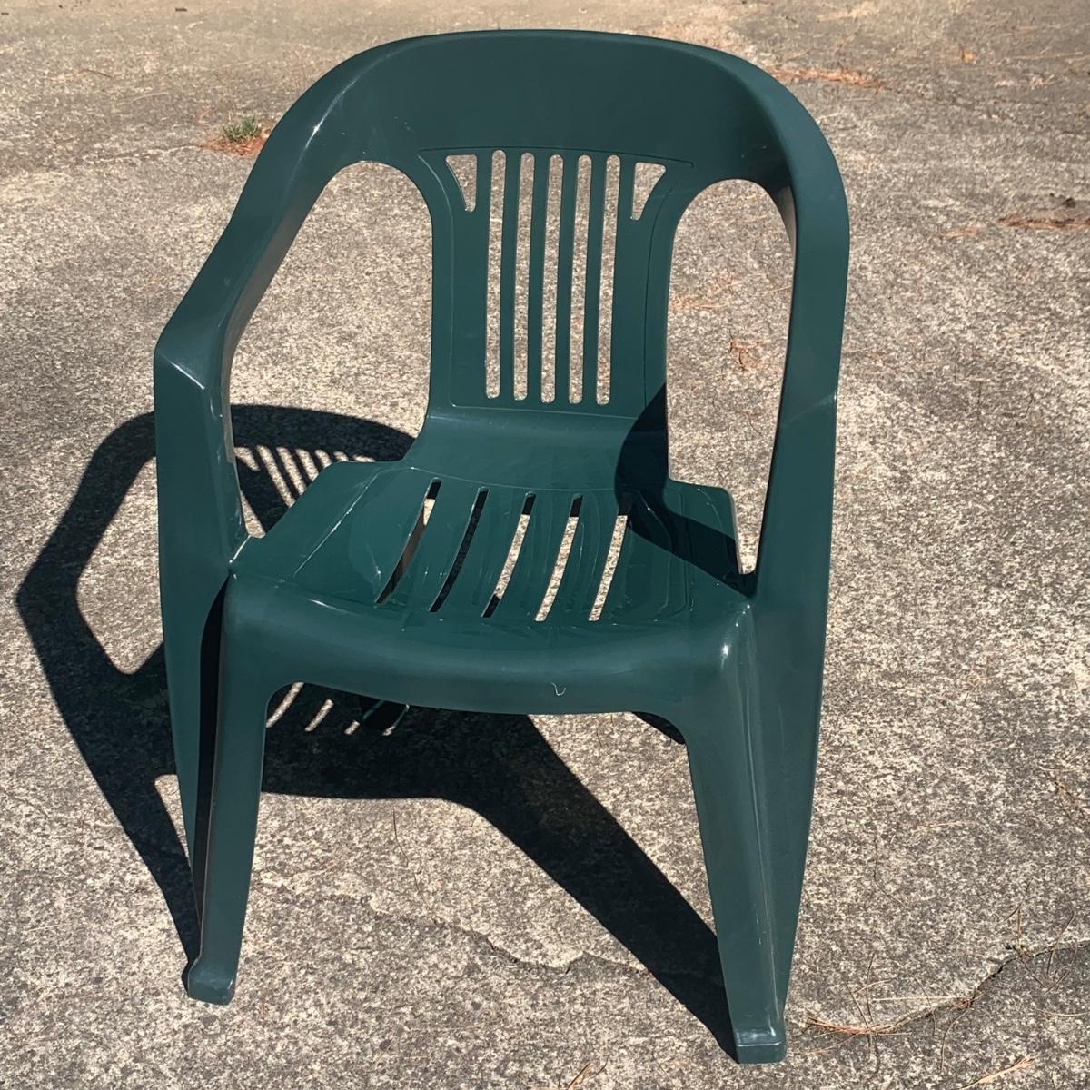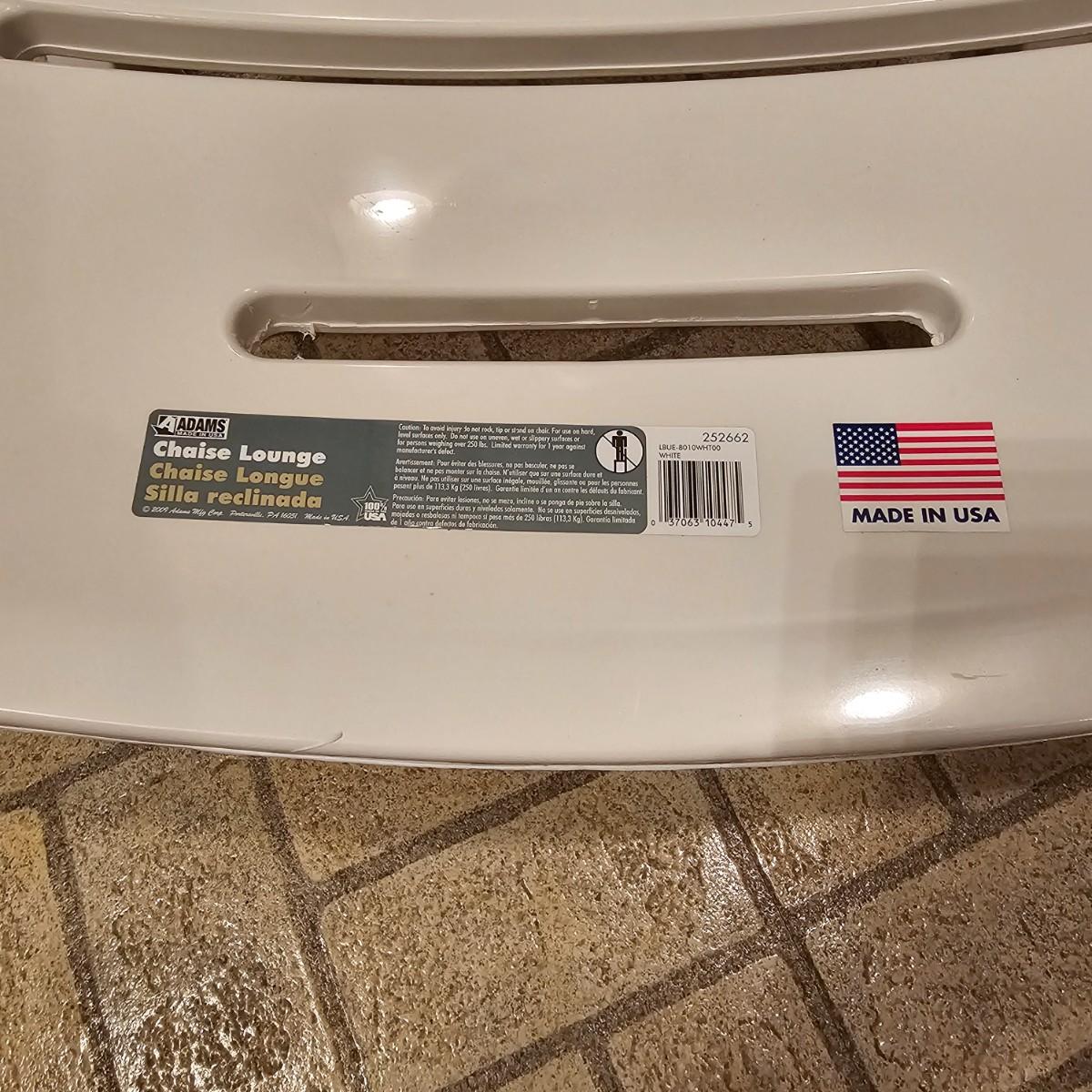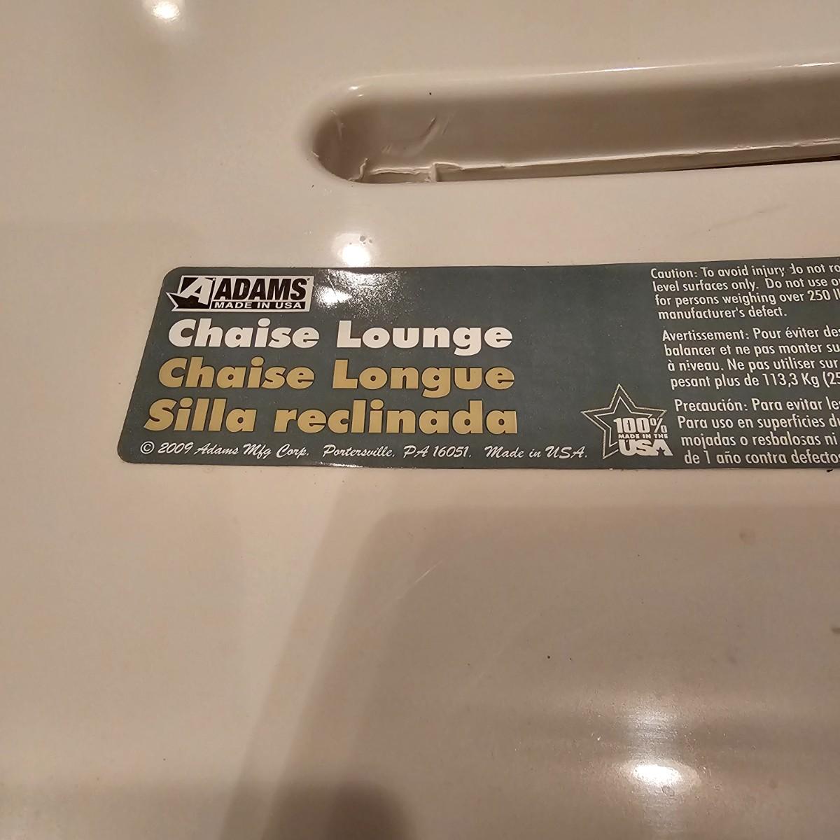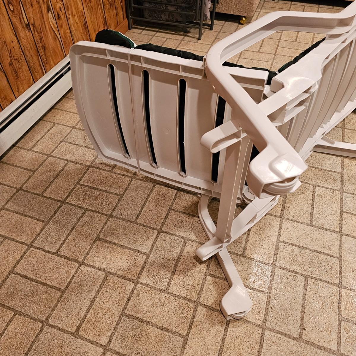 Hard plastic chaise lounge by Adams comes with green/white striped full cushion. Chair has three manual recline positions for back. Measures 27" x 62" x 36"H with 14" seat height. Green plastic patio chair included as well. See photos for details. Local pickup only.