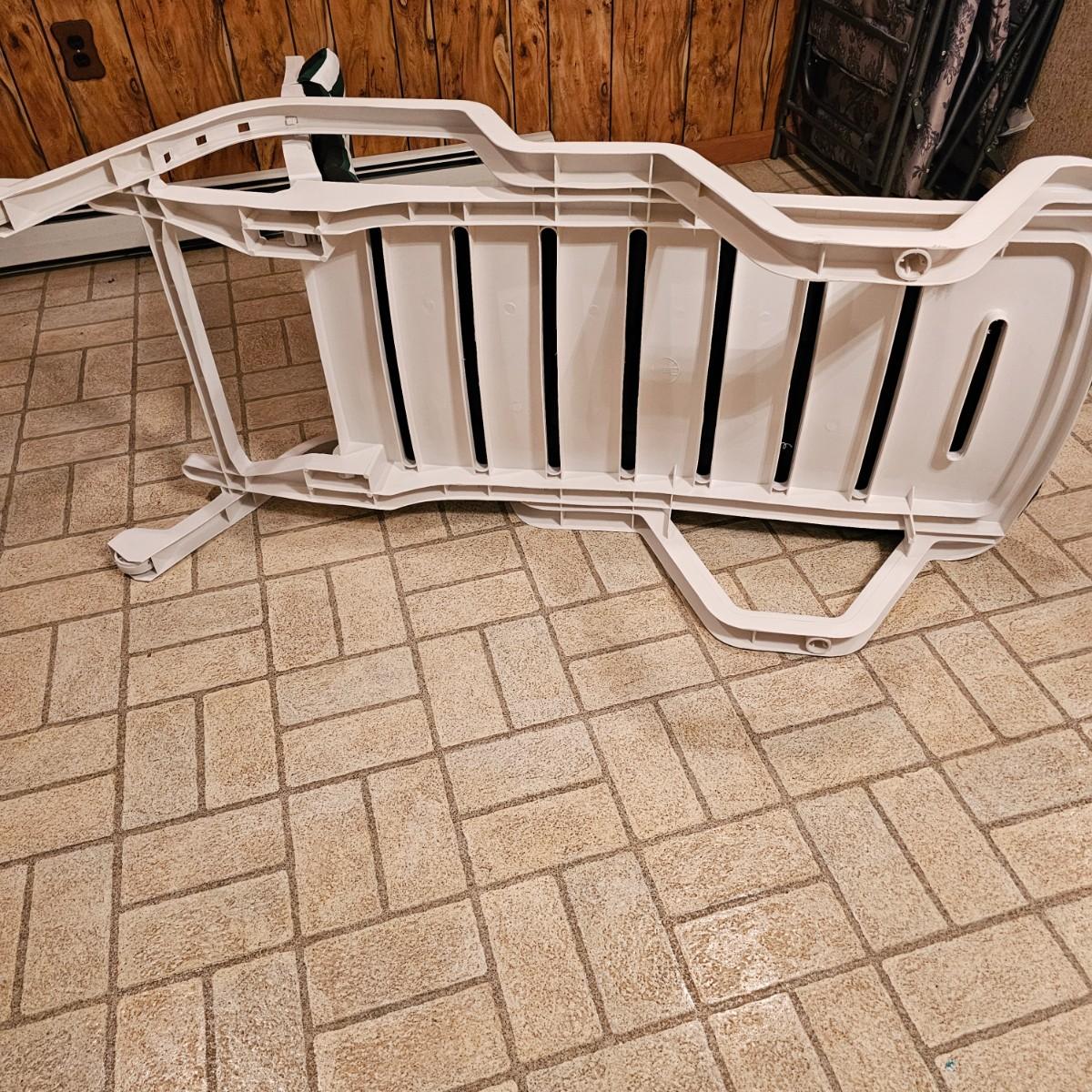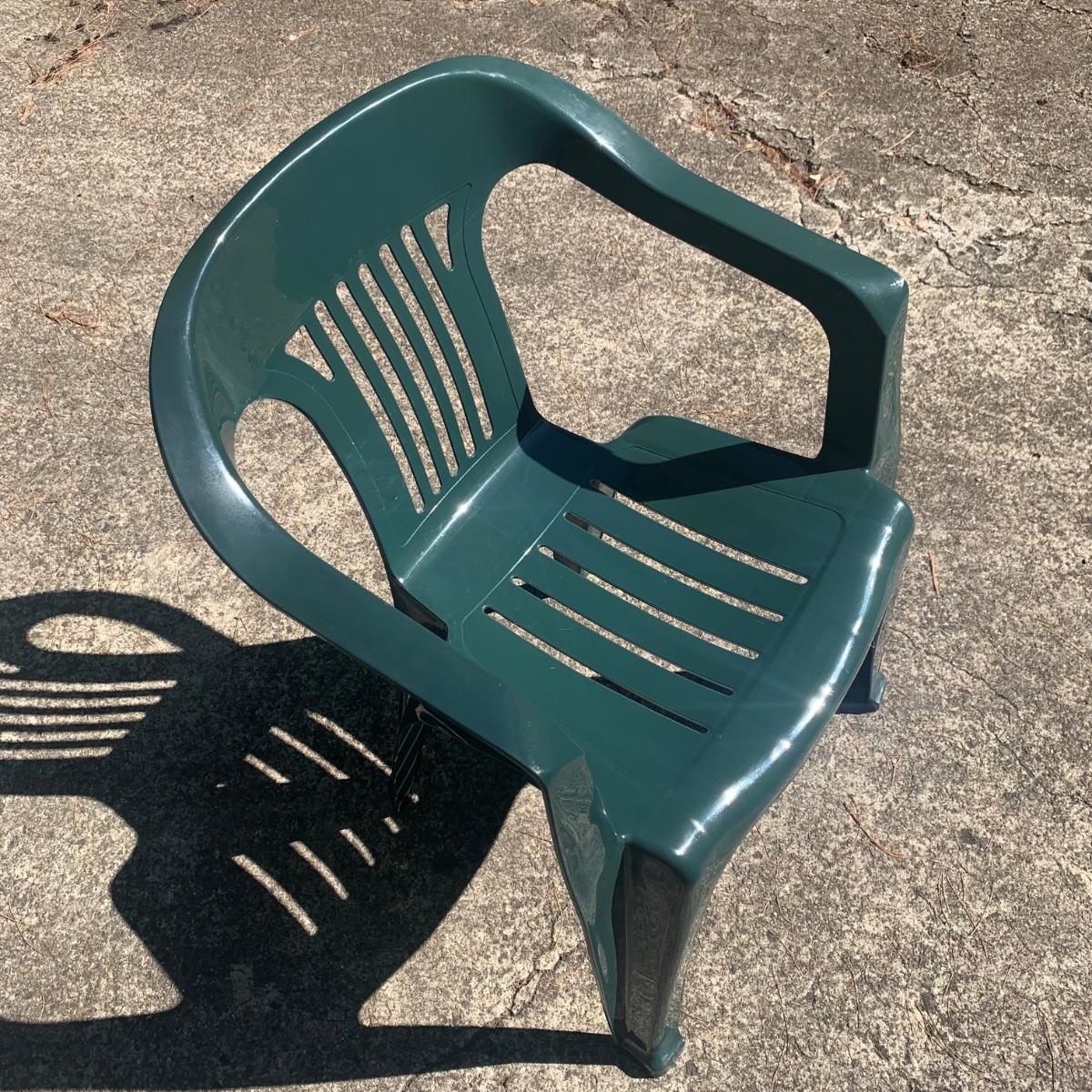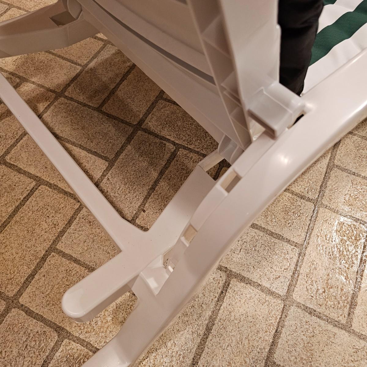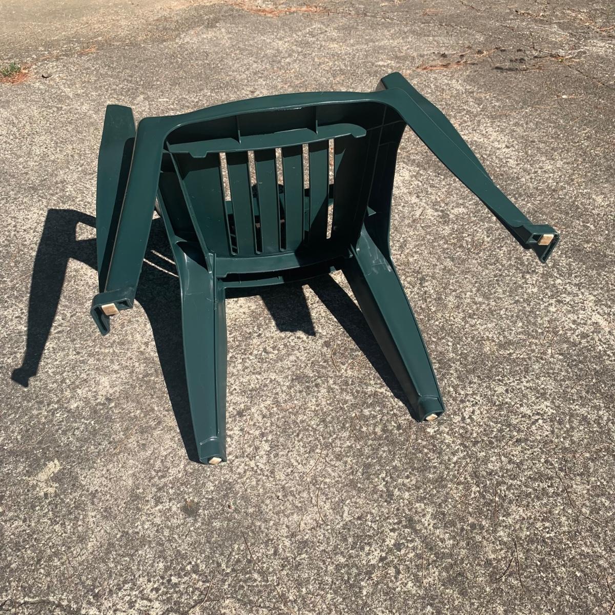 Hard plastic chaise lounge by Adams comes with green/white striped full cushion. Chair has three manual recline positions for back. Measures 27" x 62" x 36"H with 14" seat height. Green plastic patio chair included as well. See photos for details. Local pickup only.