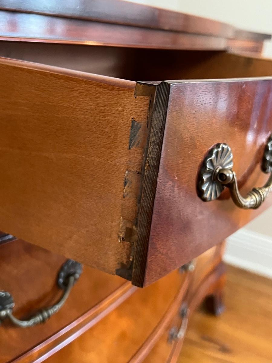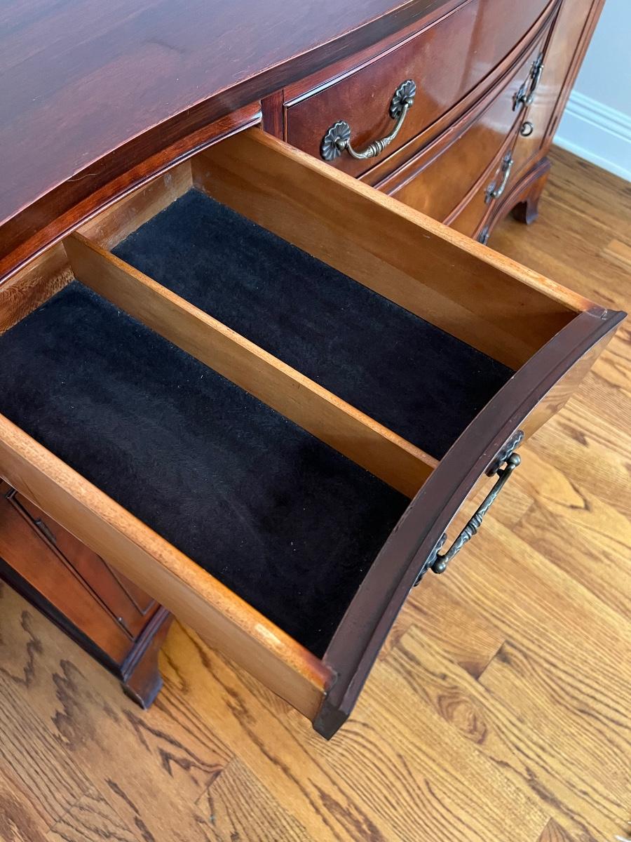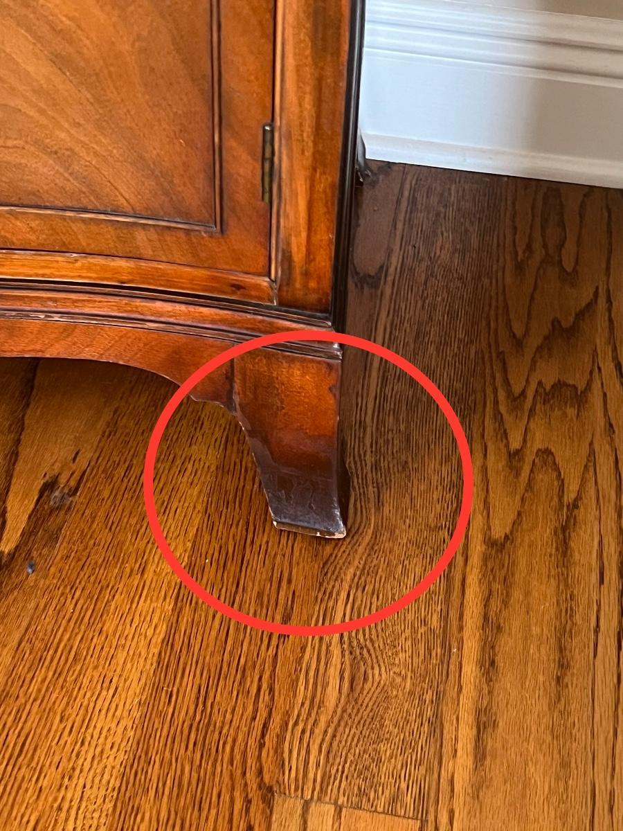 Drawers open & close easily ~ It is a bottom piece to a china cabinet, we do have the lighted cabinet if you want it, see photos ~ The top cabinet has your choice of glass or wood shelving ~ No name brand found ~ Legs have approx 2" of minor water damage from Katrina, see photo, No major damage ~ 33” H x 54” W x 18” D