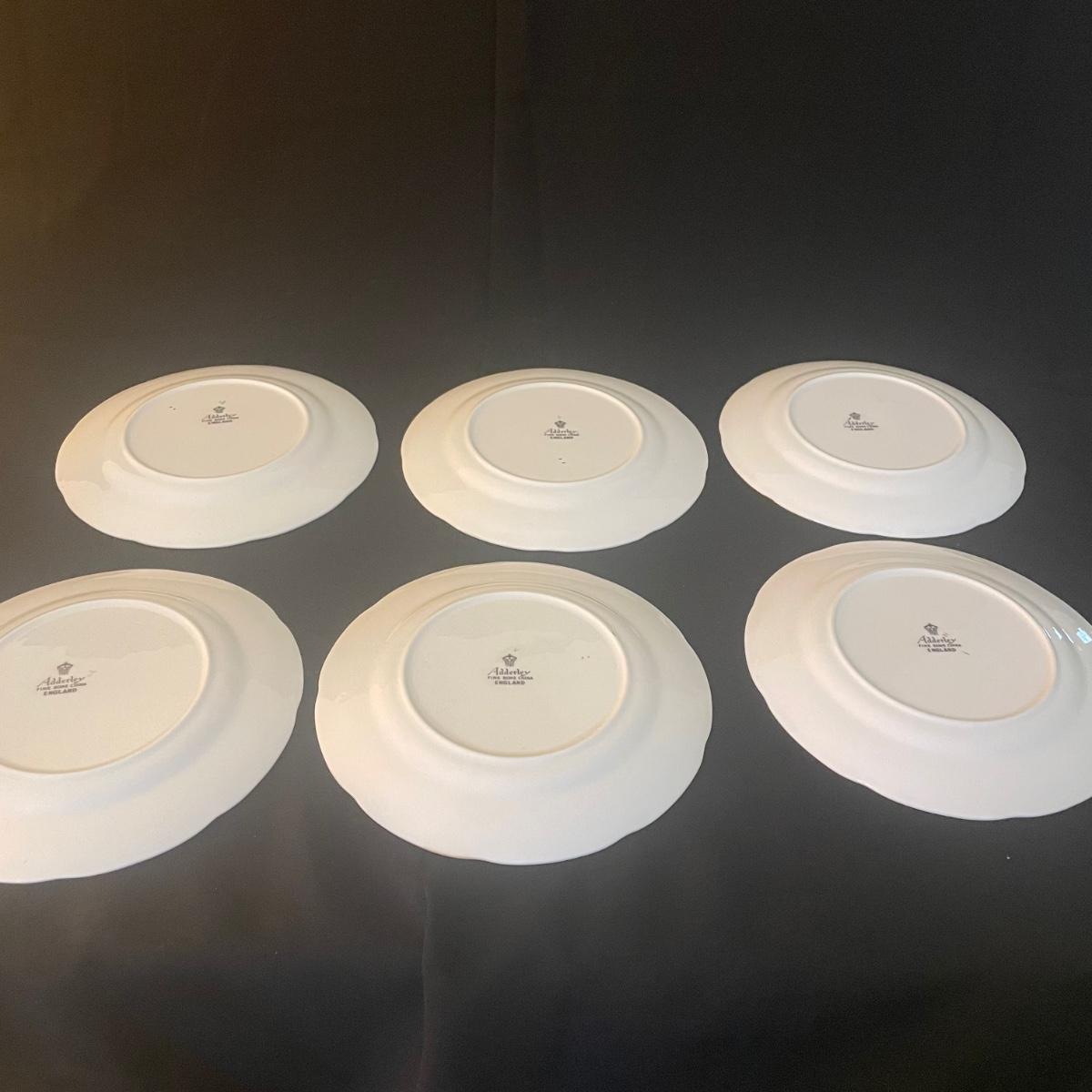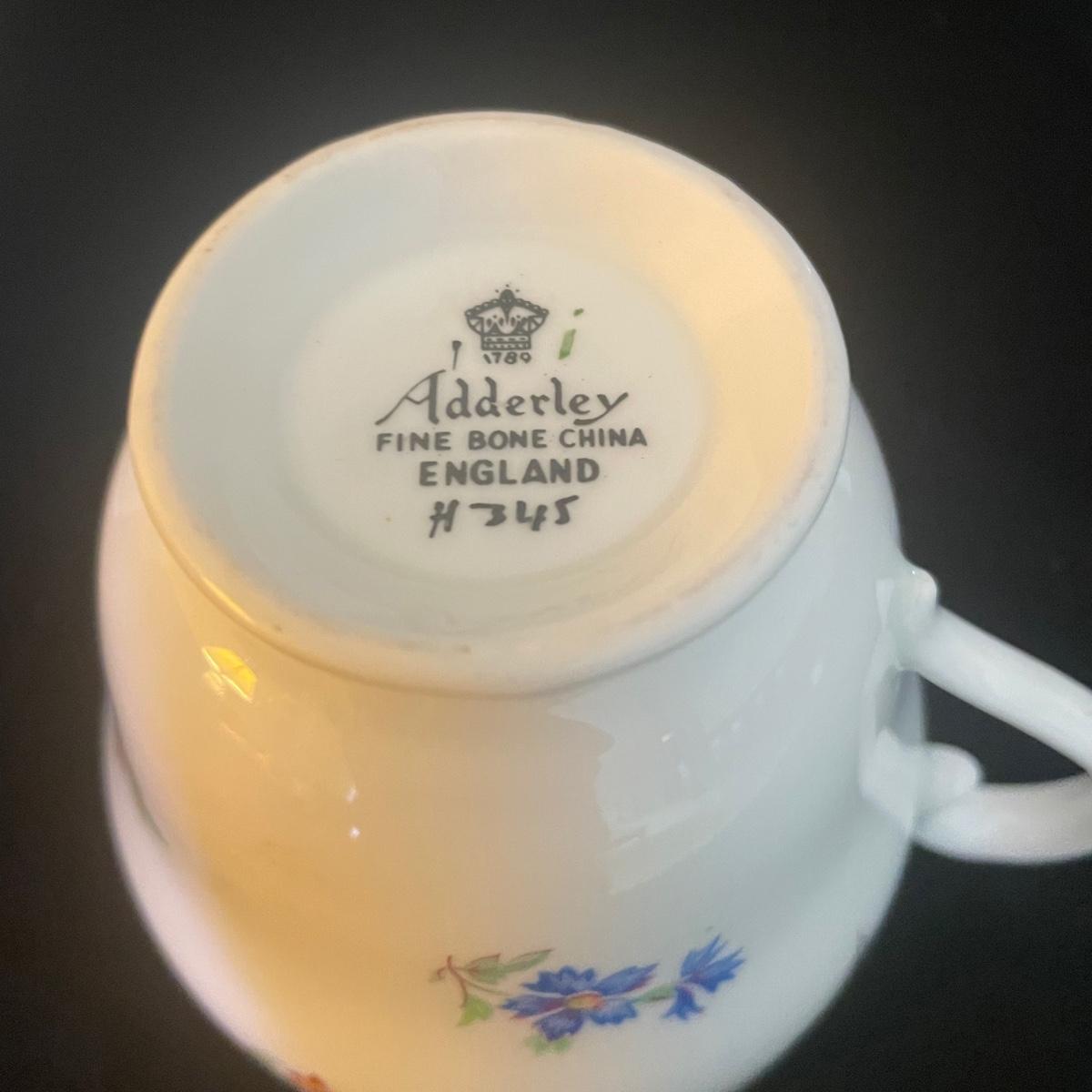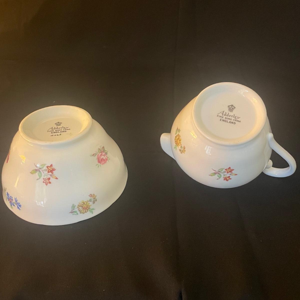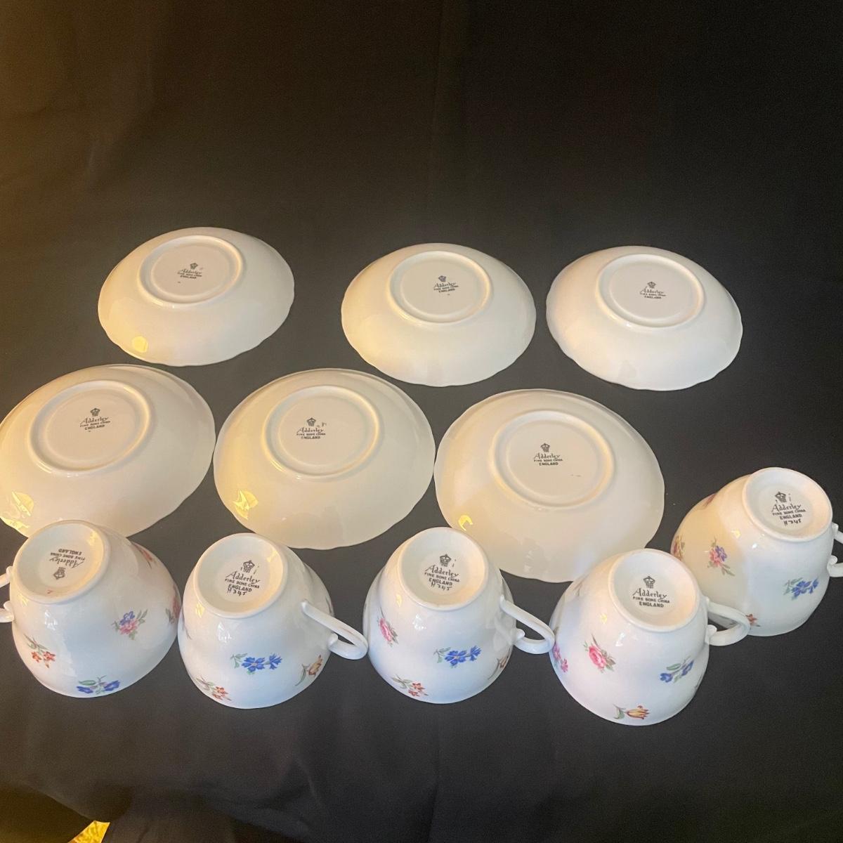 One large plate (9” d), 6 side plates (6” d), 6 saucers, 5 tea cups, a creamer and a sugar bowl make up this Adderley fine bone China set from England. Pretty floral pattern on white background with gold rims, this set is in great condition. Cups only are numbered #345.