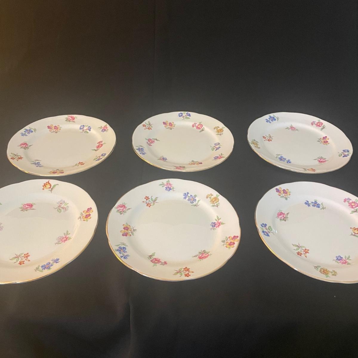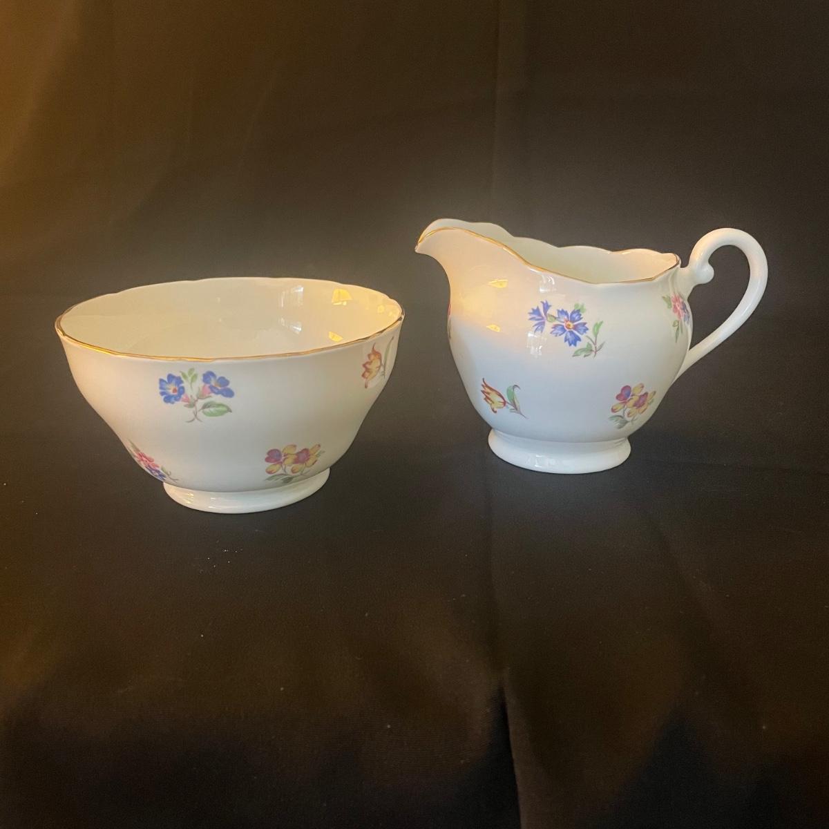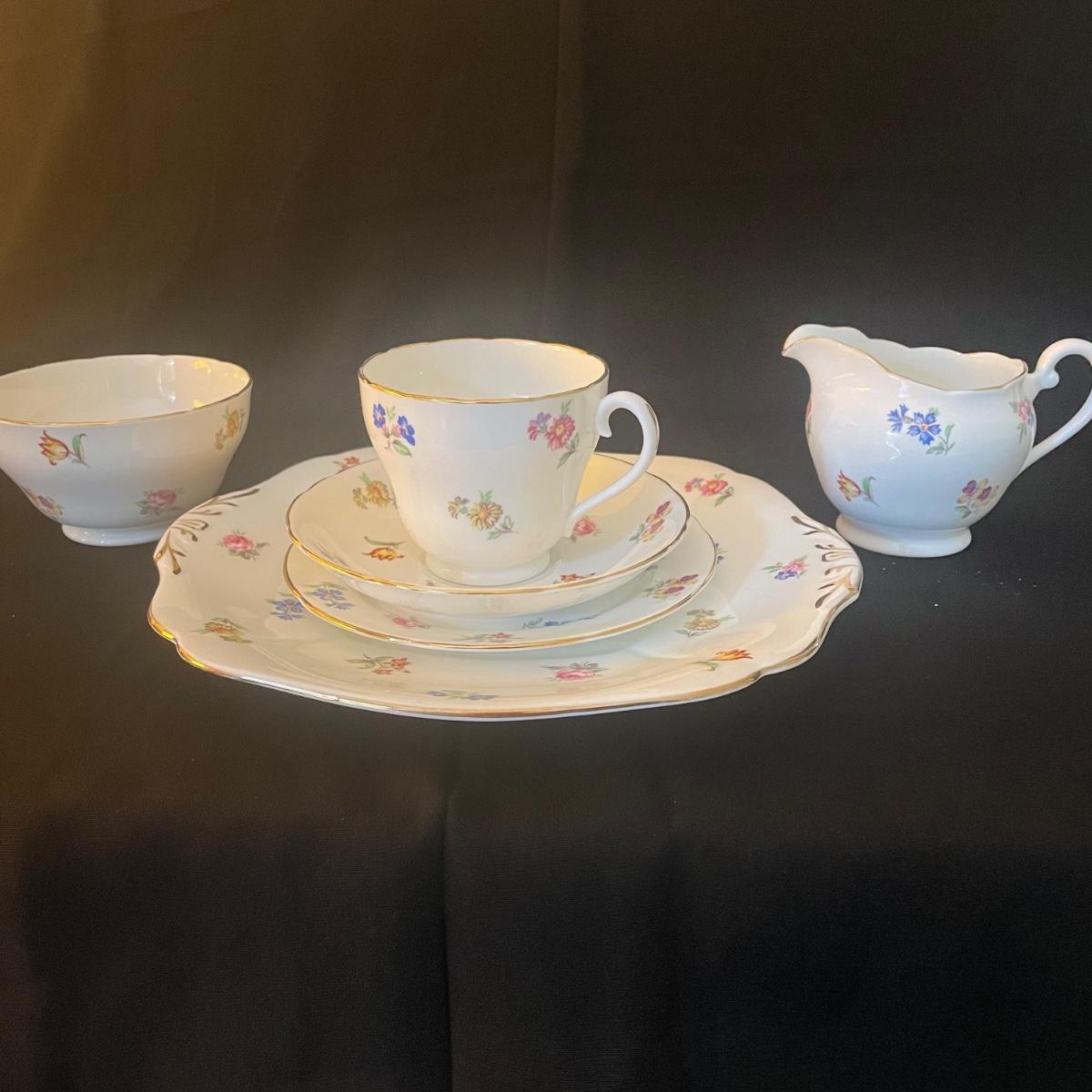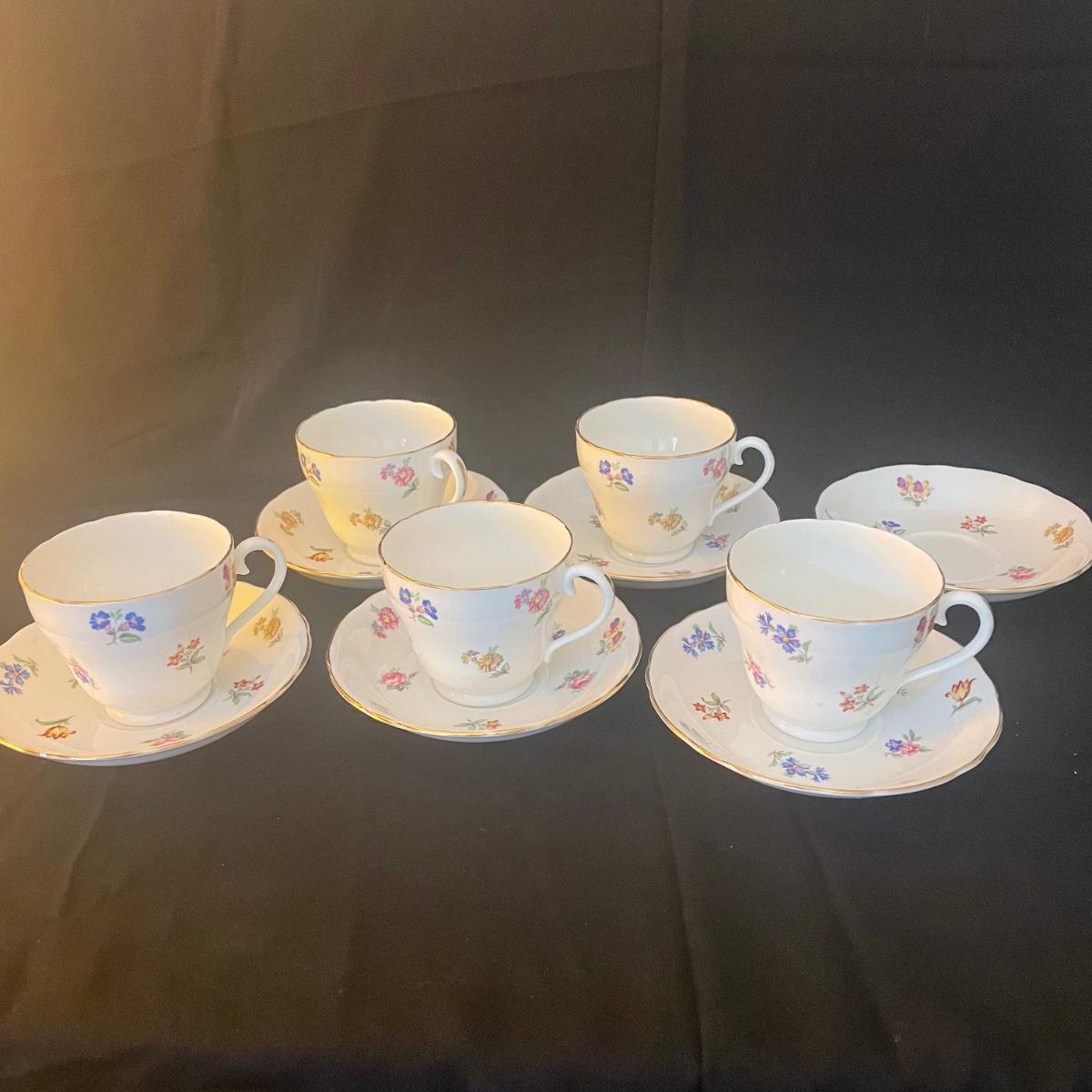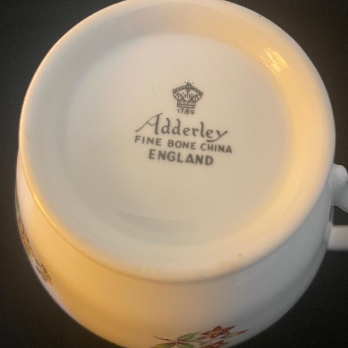 One large plate (9” d), 6 side plates (6” d), 6 saucers, 5 tea cups, a creamer and a sugar bowl make up this Adderley fine bone China set from England. Pretty floral pattern on white background with gold rims, this set is in great condition. Cups only are numbered #345.