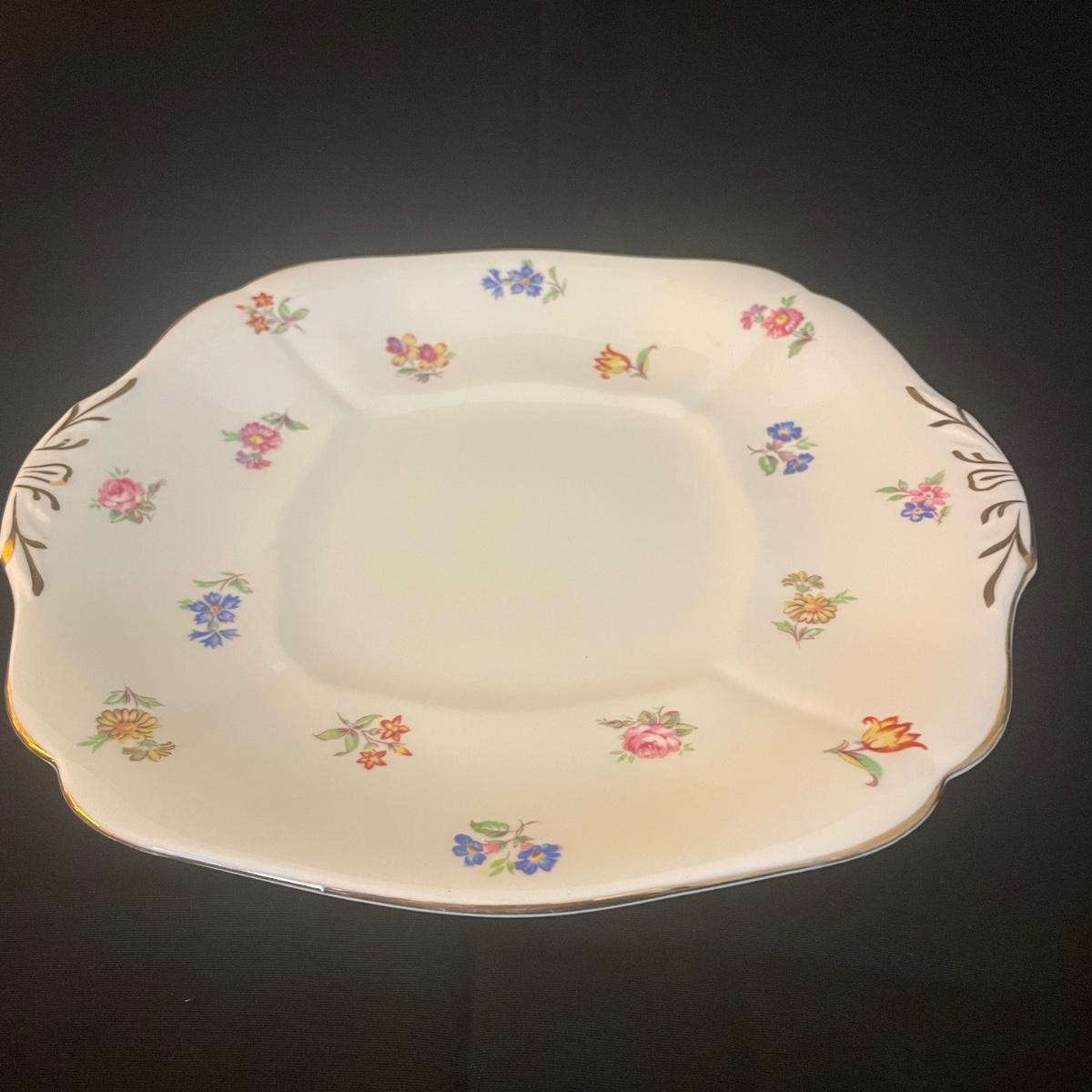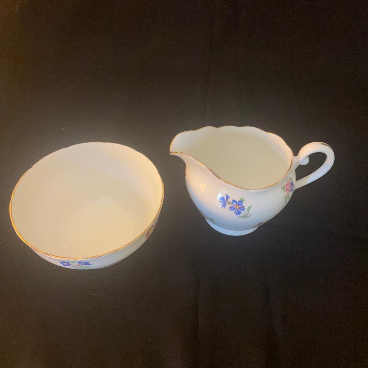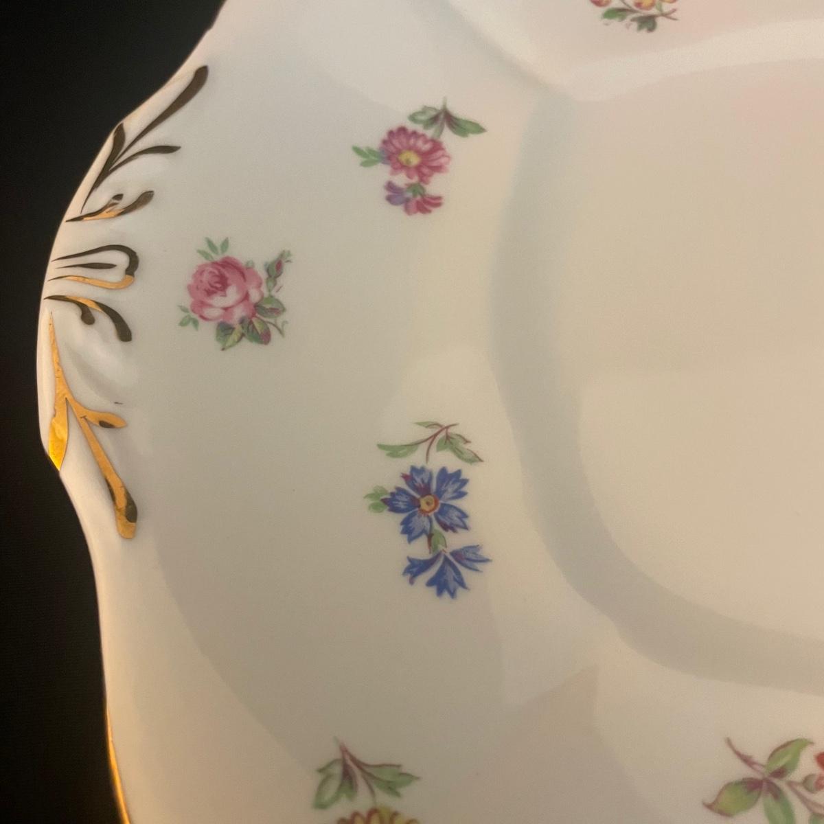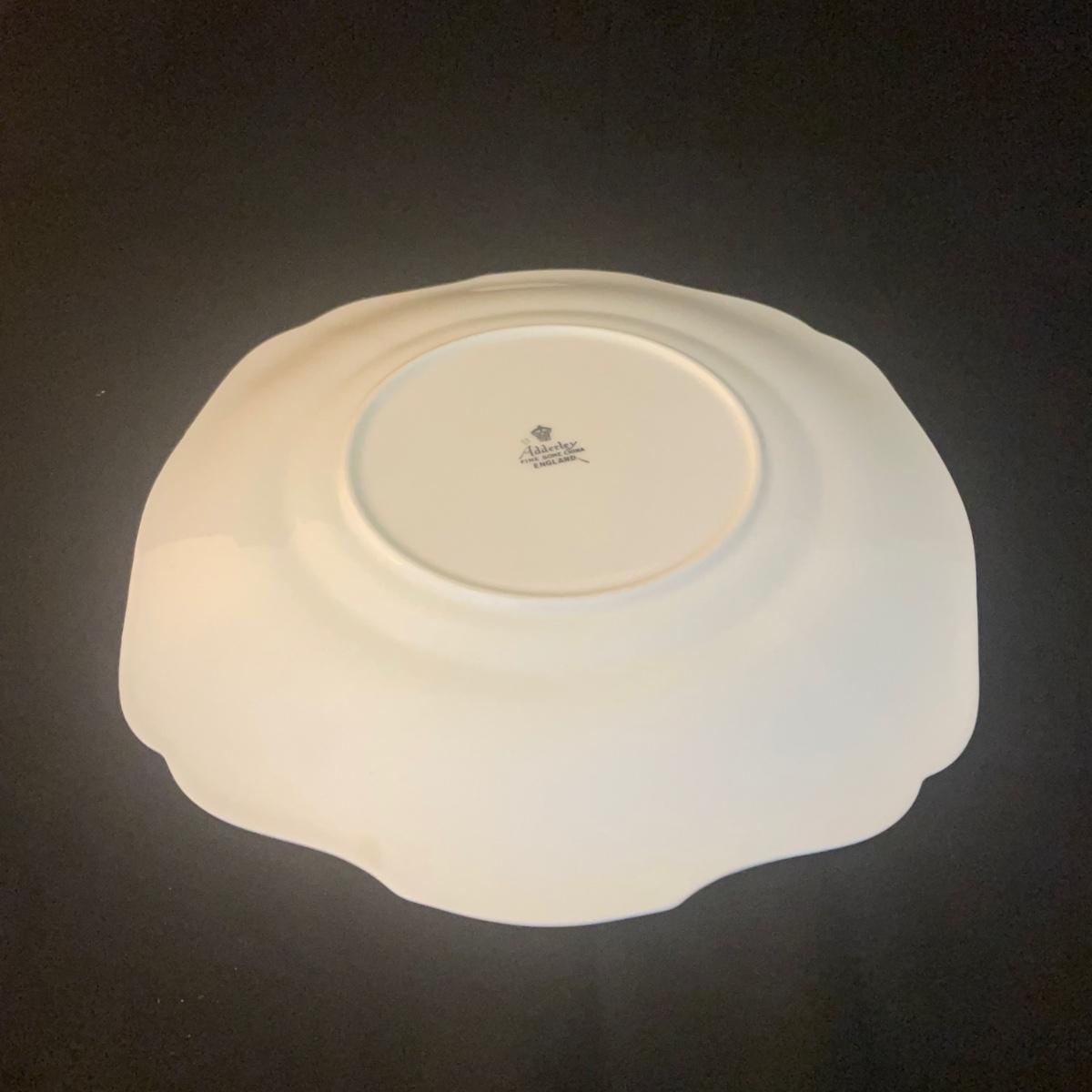 One large plate (9” d), 6 side plates (6” d), 6 saucers, 5 tea cups, a creamer and a sugar bowl make up this Adderley fine bone China set from England. Pretty floral pattern on white background with gold rims, this set is in great condition. Cups only are numbered #345.