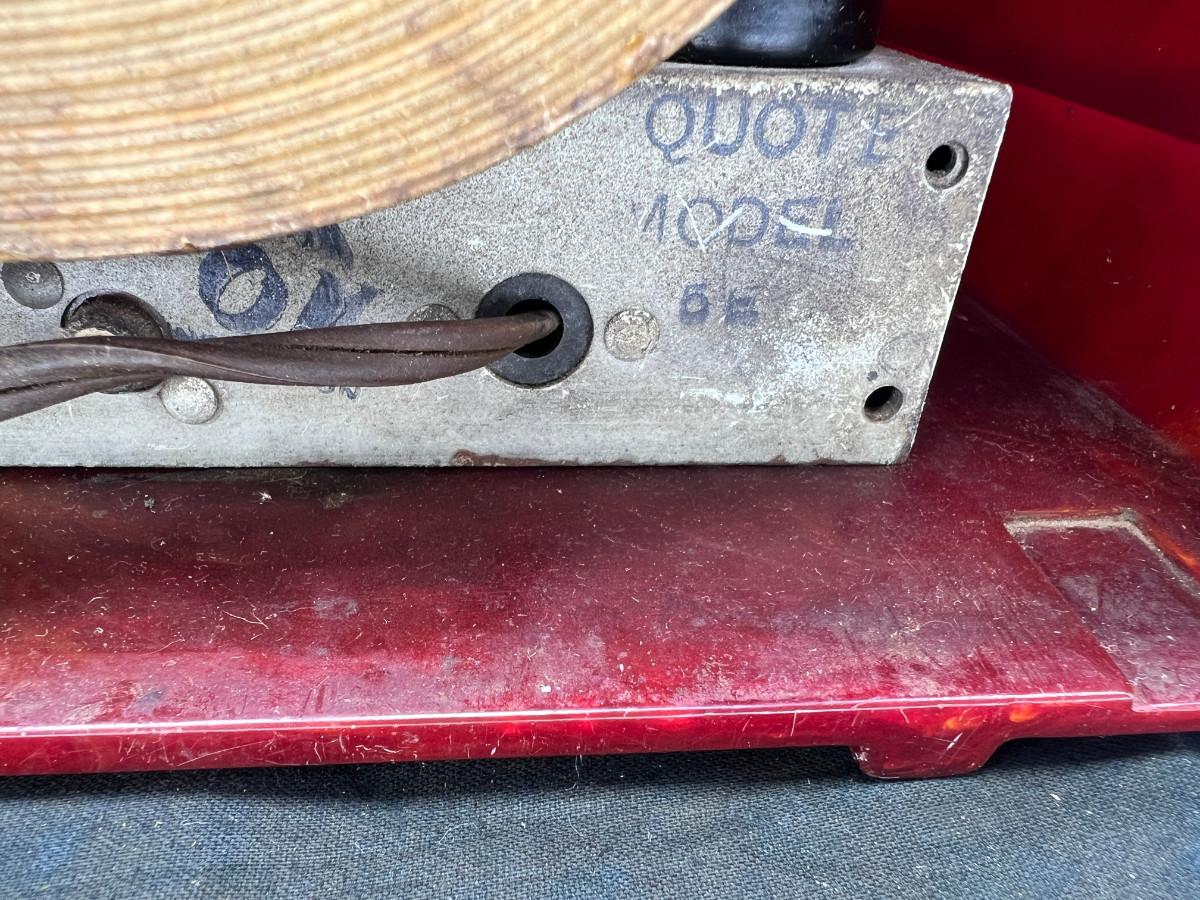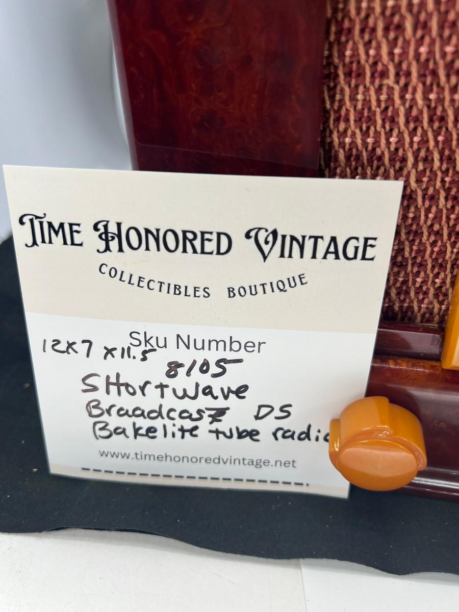 This Art Deco styled vintage tube radio was made by the Addison Industries Ltd. of Canada in approximately 1939. This is Addison's Model 5D, otherwise known as the 'Courthouse" model to collectors, and is done in a deep red and butterscotch marbled Catalin This heavily marbled case is accented with butterscotch Catalin grill posts and knobs and a black dial with cream Art Deco styled numbers. The case is in very good period condition showing no cracks, chips or hairlines and the knobs work and the tuner knob works. That said, this radio is being sold untested and 'As Found' with respect to the works of the radio itself, Unit is being sold as a "non-working" vintage electronic device that should be gone over by a qualified technician prior to use.
