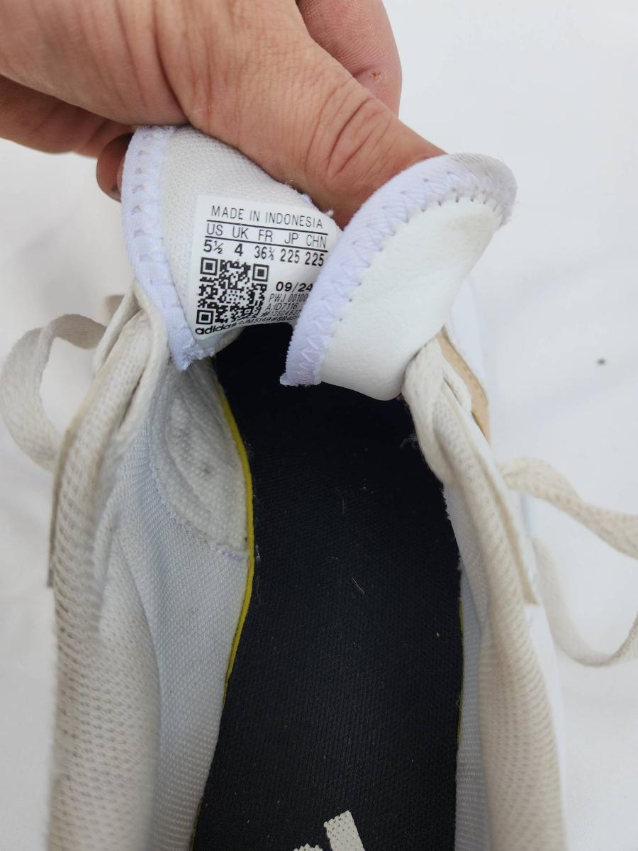 Adidas women's athletic sneakers in white with gold accents. Made in Indonesia, these shoes are labeled as size 5.5 US (EU 36, UK 4, JP 225). Features include a lace-up closure, synthetic materials, and a padded insole for comfort. Good pre-owned condition with minor signs of wear.