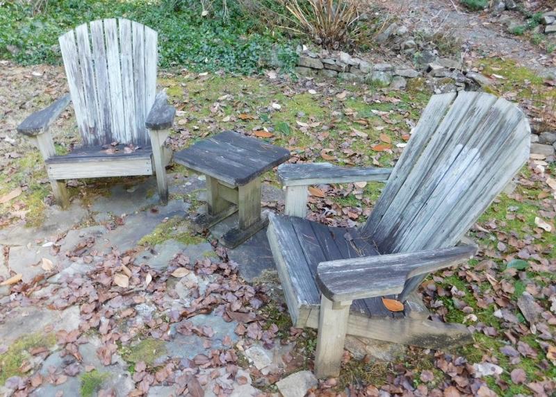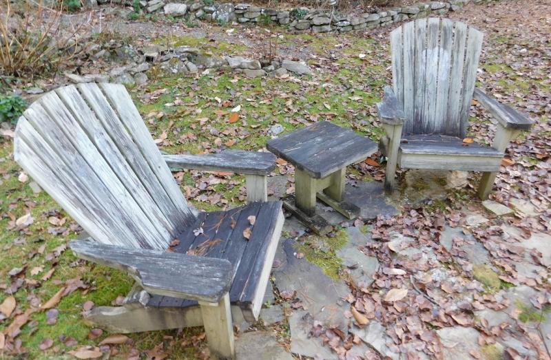 Adirondack Chair and Side Table Set needs cleaning. Has some wear and wood aging and split. Appears to still be in solid condition. Not tested.