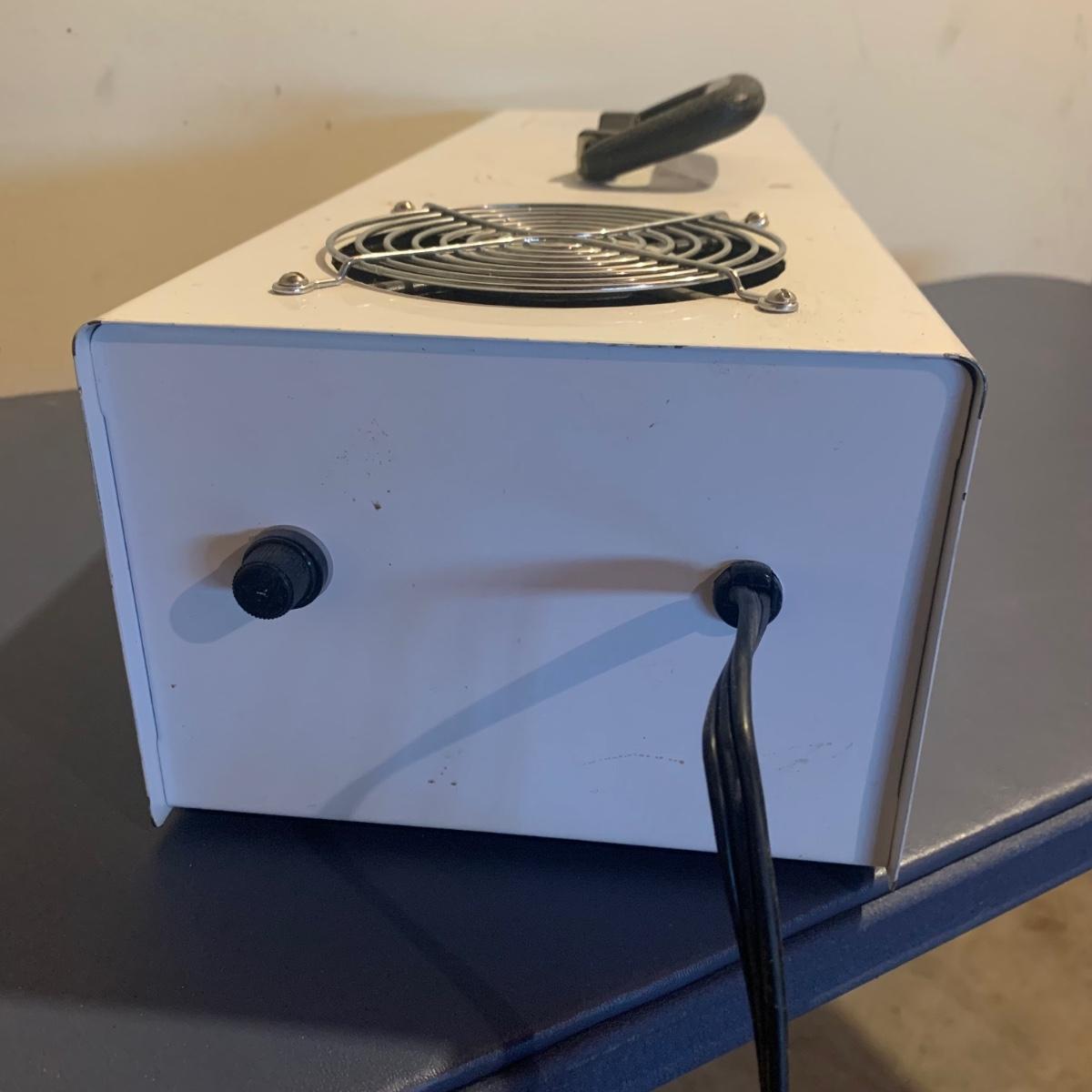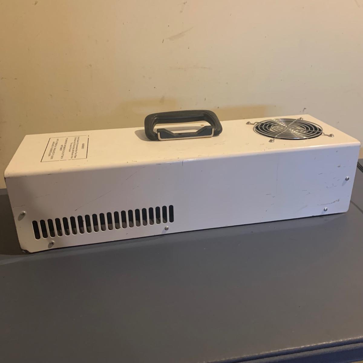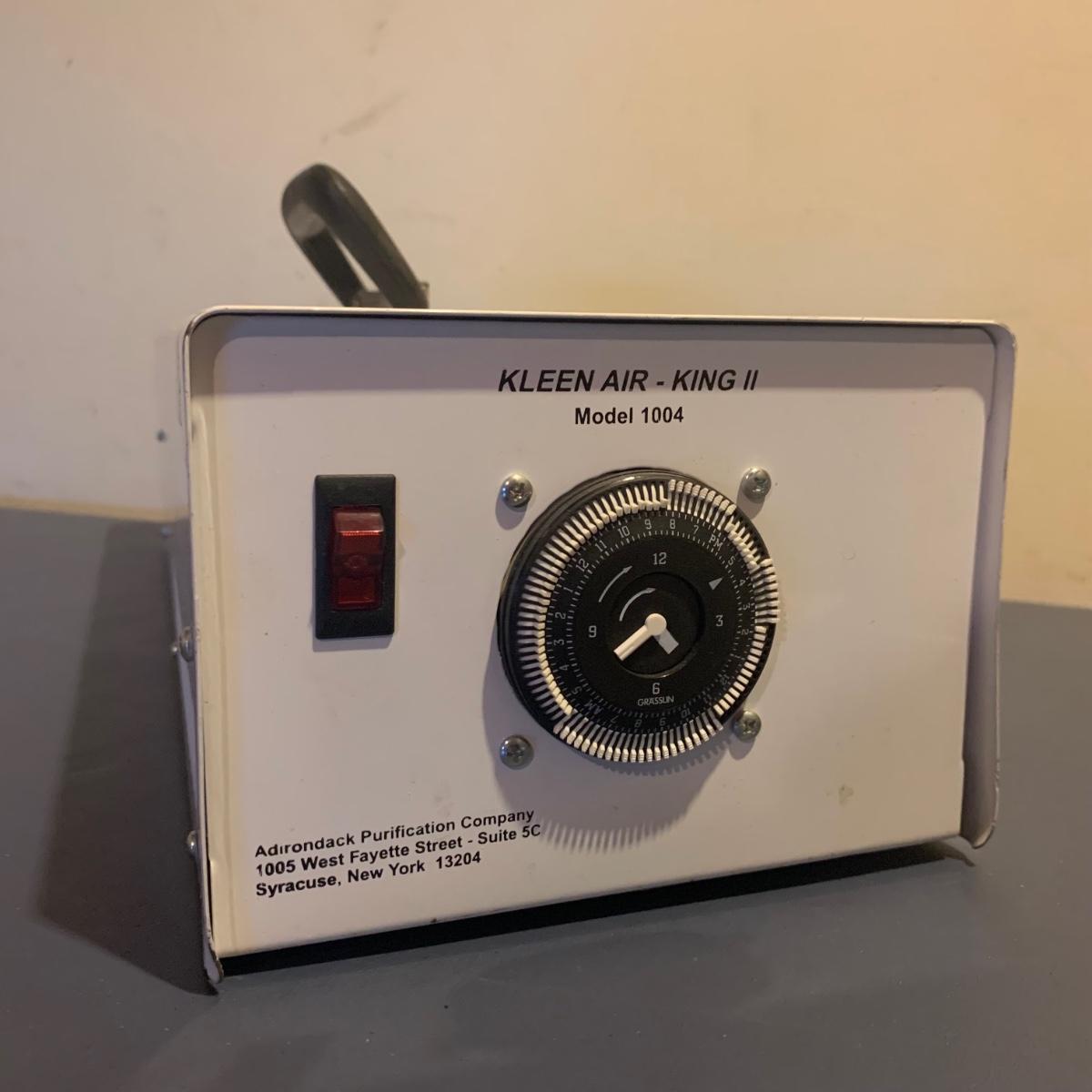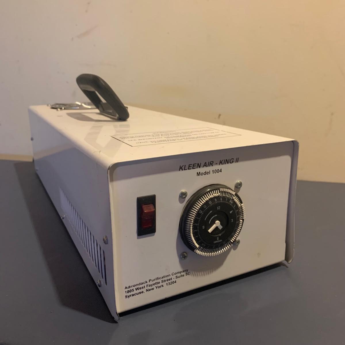 Kleen Air King II, Model 1004 by Adirondack Purification Company. Air purifier and ozone generator. Item shell is made of metal. It has slight bends in the metal on the front corners and some surface scratches. Item measures approximately 7” x 21” x 5”H. It powered on when plugged in.
