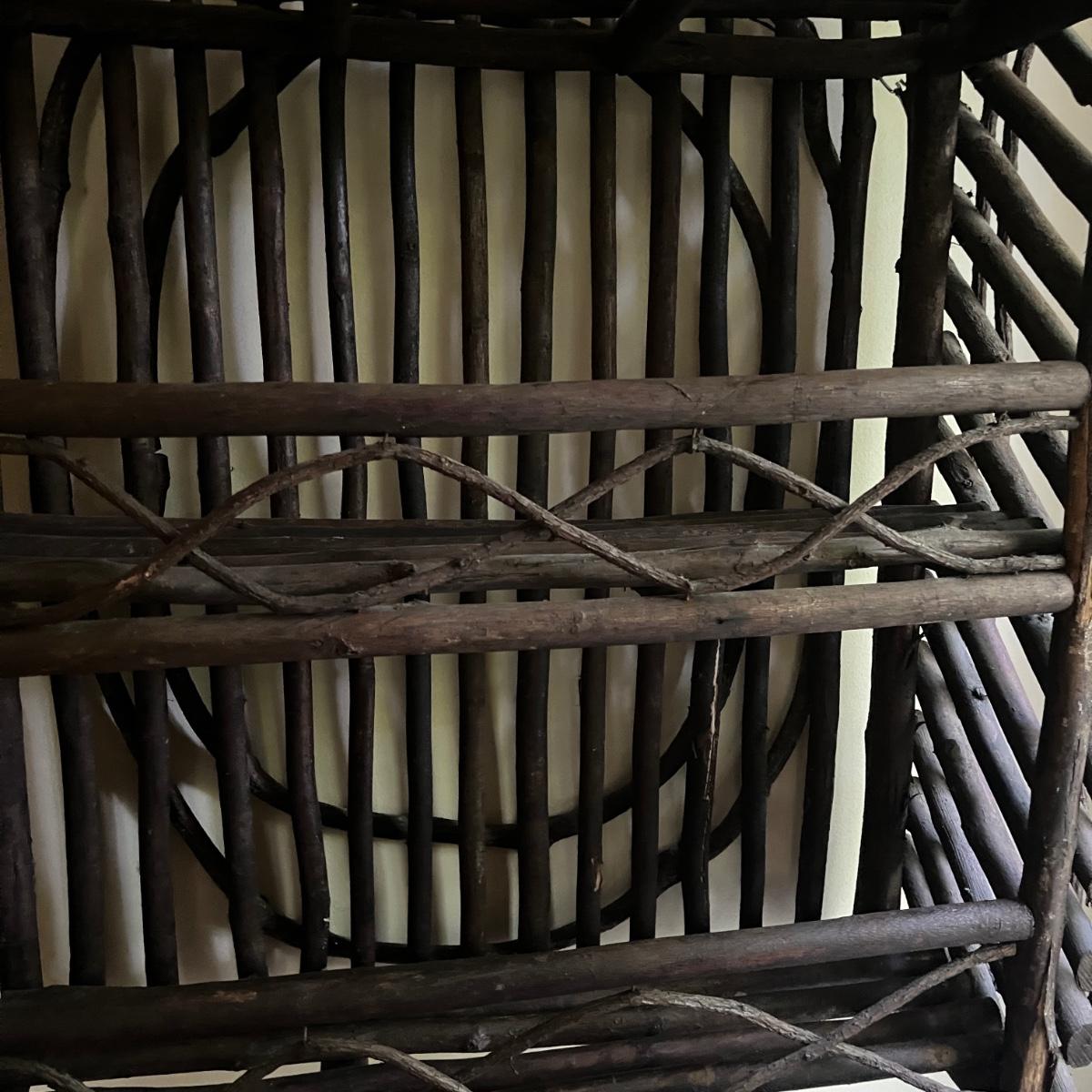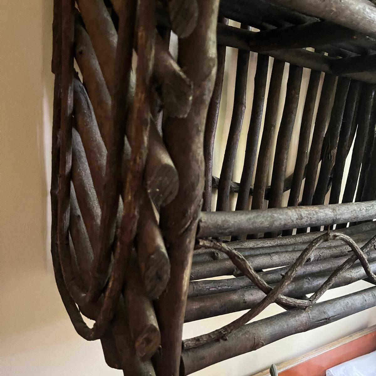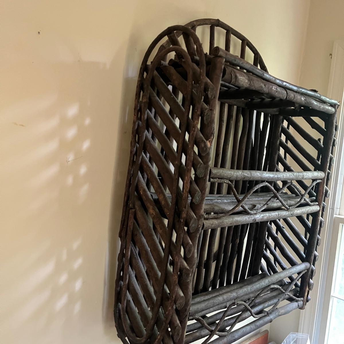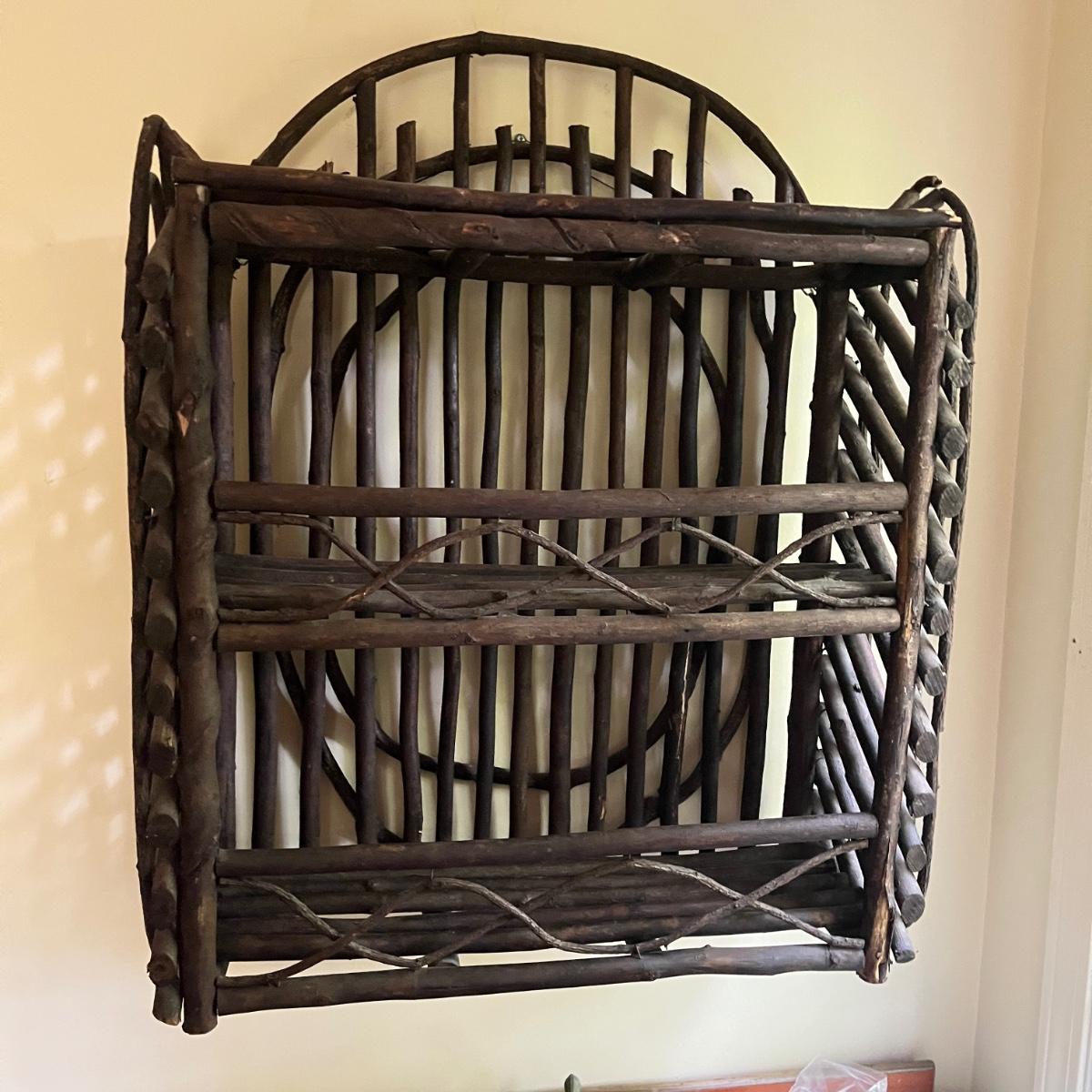 This unique item is a willow branch wall mount shelving unit that measures 29.5” x 11” x 35.5”H. Unit appears to be made from small branches and has a wire for wall mounting.