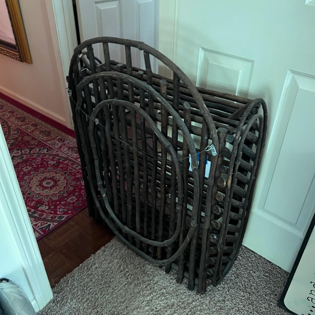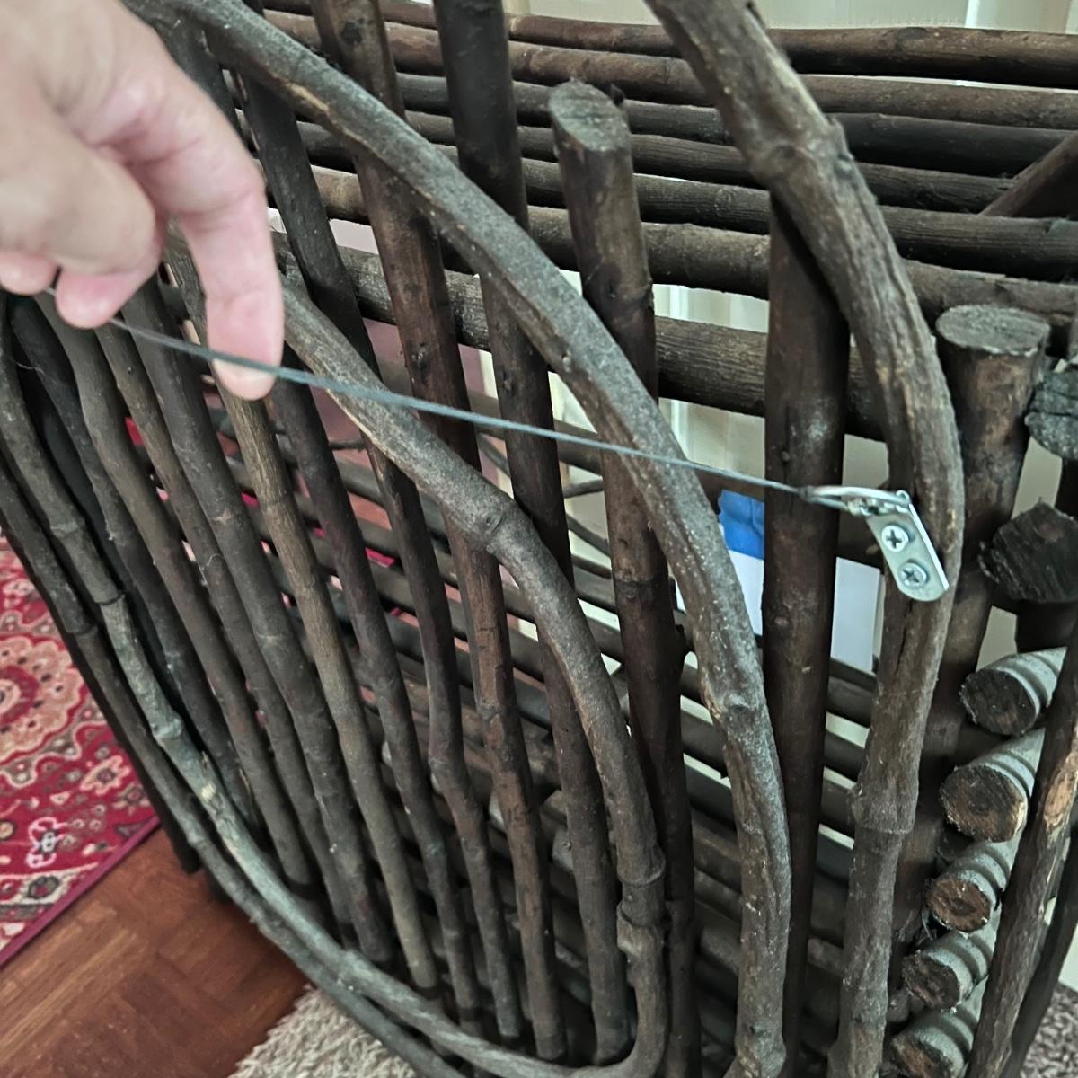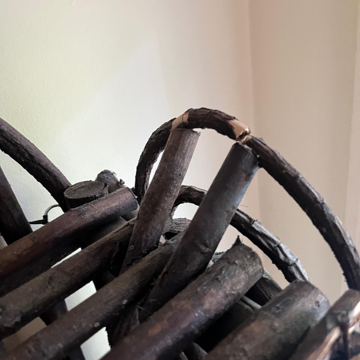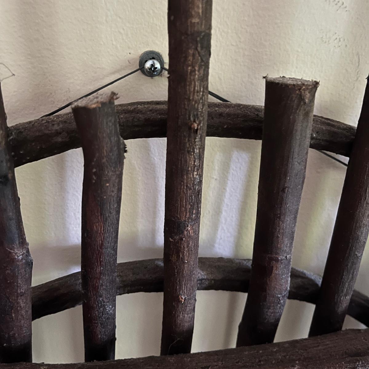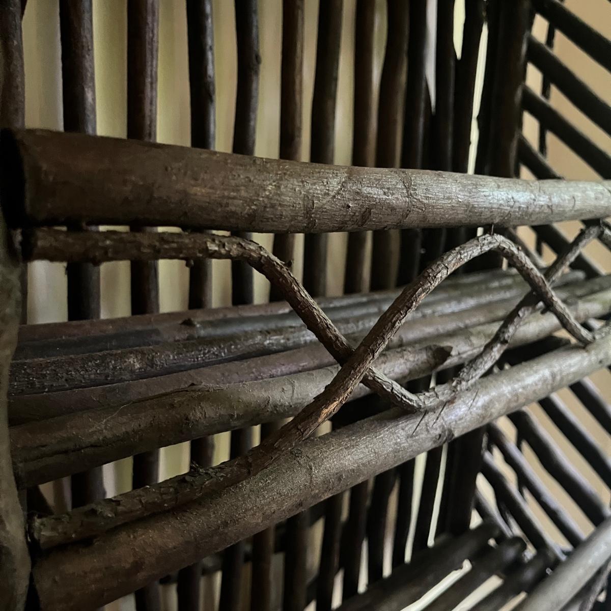 This unique item is a willow branch wall mount shelving unit that measures 29.5” x 11” x 35.5”H. Unit appears to be made from small branches and has a wire for wall mounting.