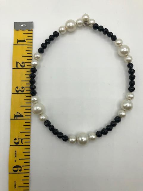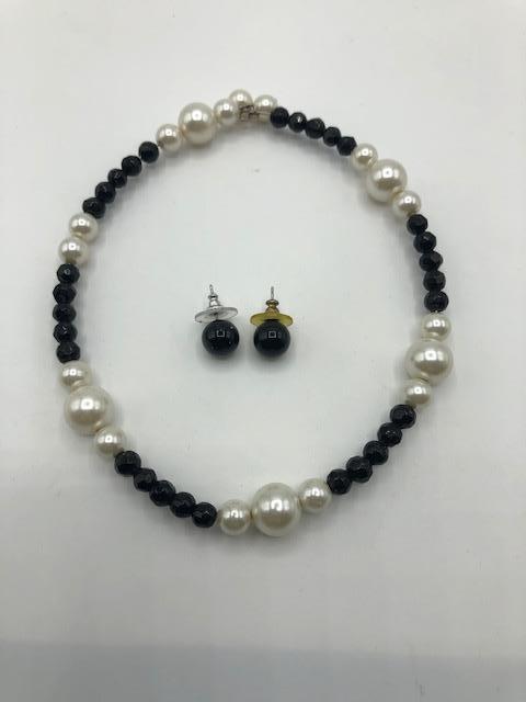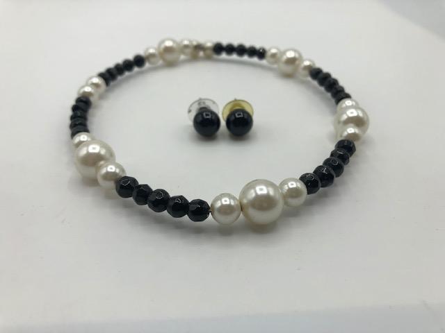 Bead choker & earrings. Choker is adjustable as it is wire wrap style. Black prism beads and faux pearls. Earrings are simple black ball studs.