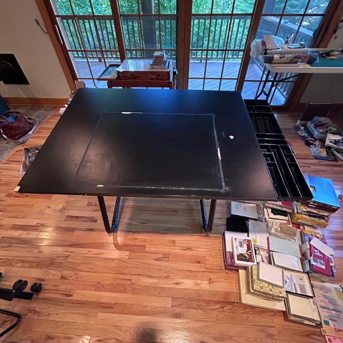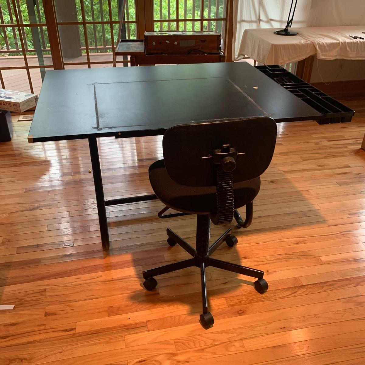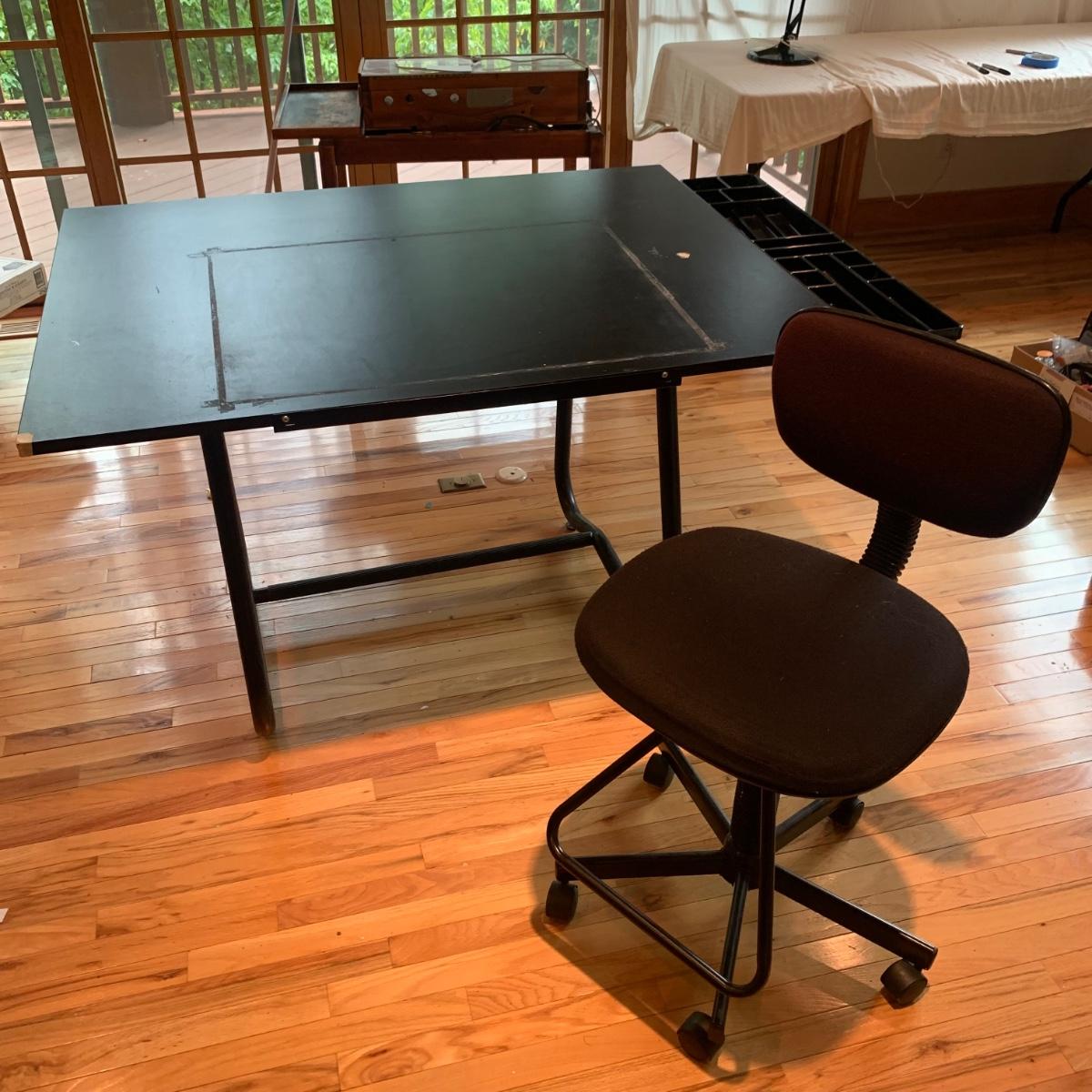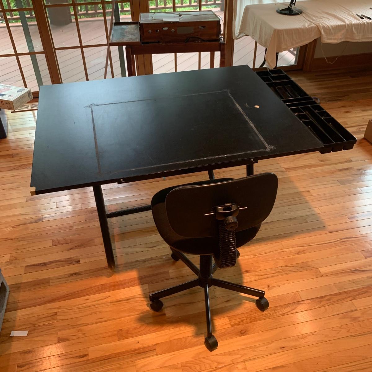 This duo project ensemble is great for all your art projects. The swivel height adjusting chair with foot rest and two other adjustment knobs works great for the drafting style table. The chair at its lowest level measures 22” x 24” x 36.5”H with a 23” seat height. Table has adjustable front and back heights and a guard for angle work. The white marks are tape from past projects. There is tape on one corner that may be damaged. The work tray to the right is plastic but mounted to the table. Measurements are at the lowest settings for transport: 55” x 36” x 32”H. Without the plastic tray the table is 48” wide.