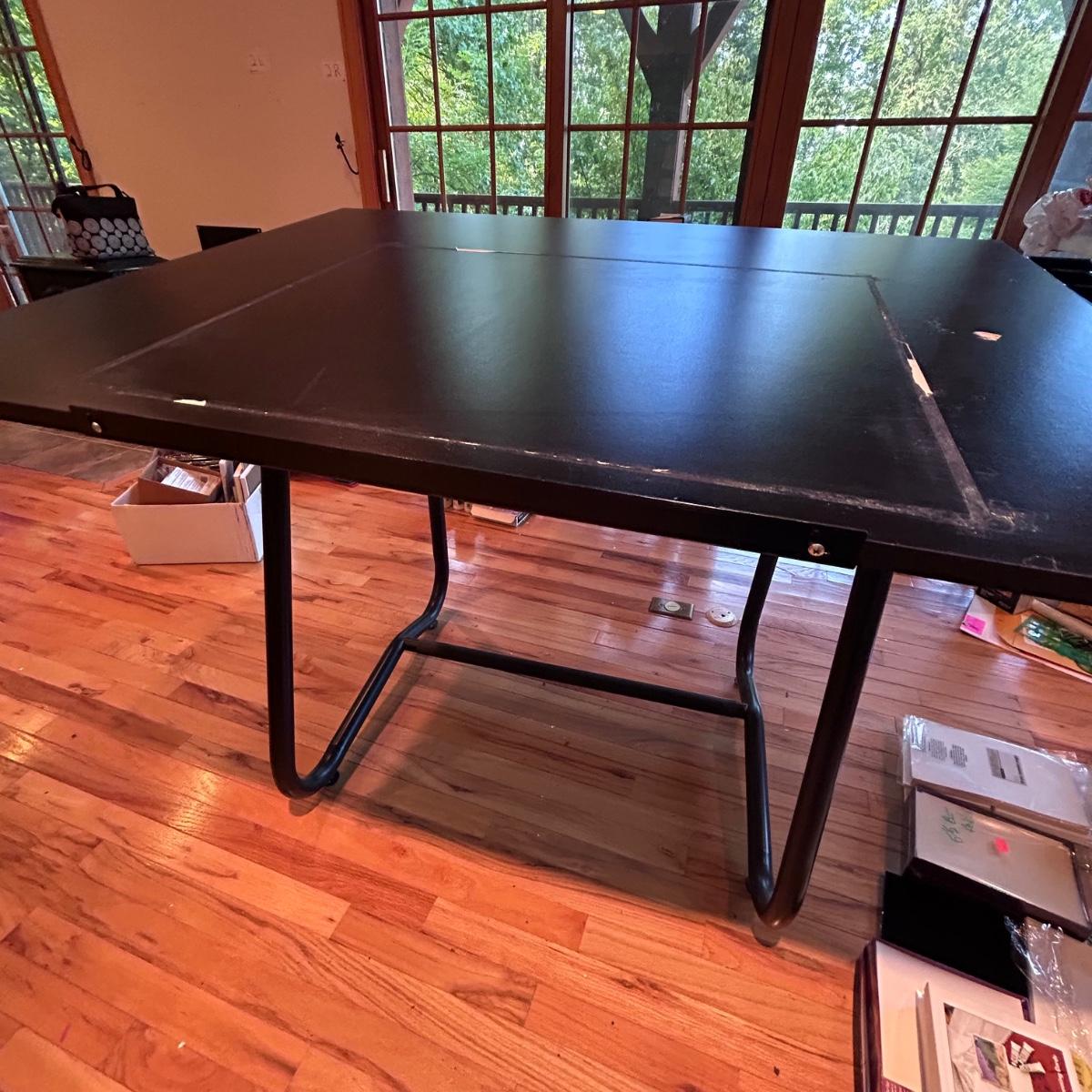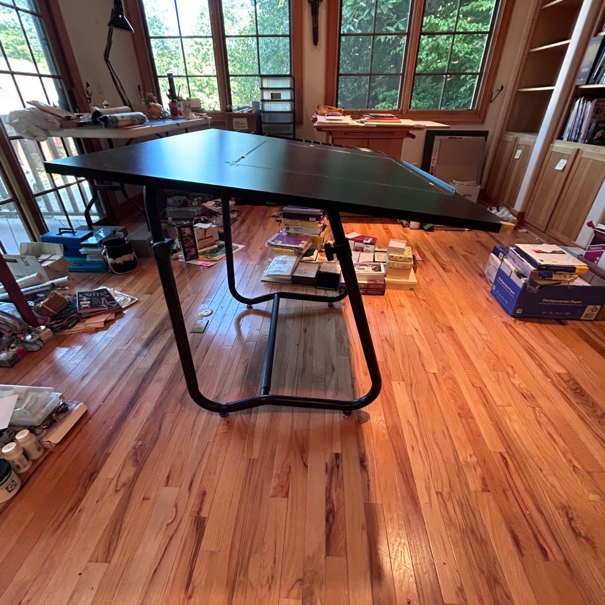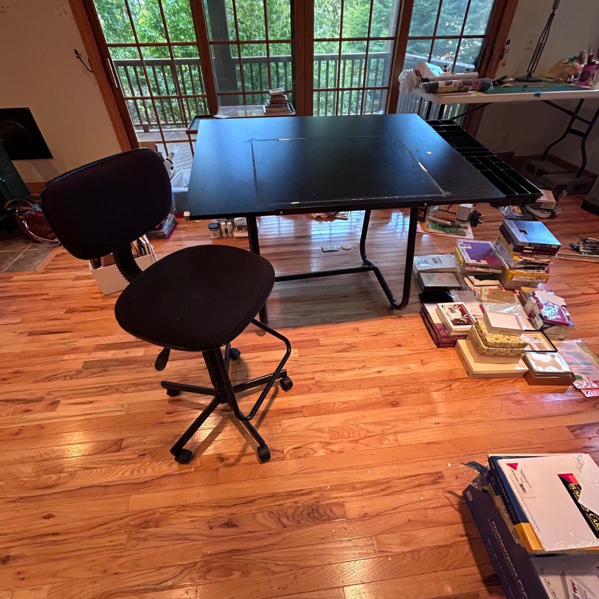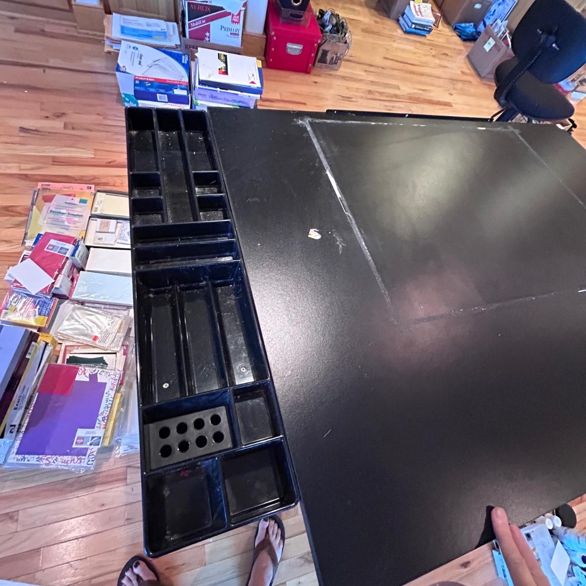 This duo project ensemble is great for all your art projects. The swivel height adjusting chair with foot rest and two other adjustment knobs works great for the drafting style table. The chair at its lowest level measures 22” x 24” x 36.5”H with a 23” seat height. Table has adjustable front and back heights and a guard for angle work. The white marks are tape from past projects. There is tape on one corner that may be damaged. The work tray to the right is plastic but mounted to the table. Measurements are at the lowest settings for transport: 55” x 36” x 32”H. Without the plastic tray the table is 48” wide.