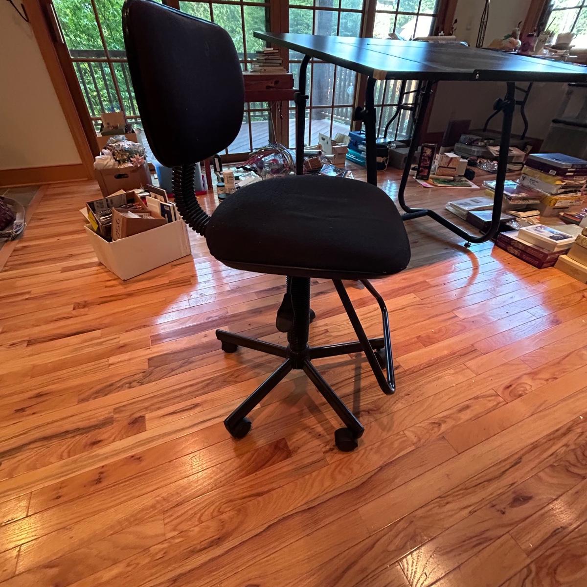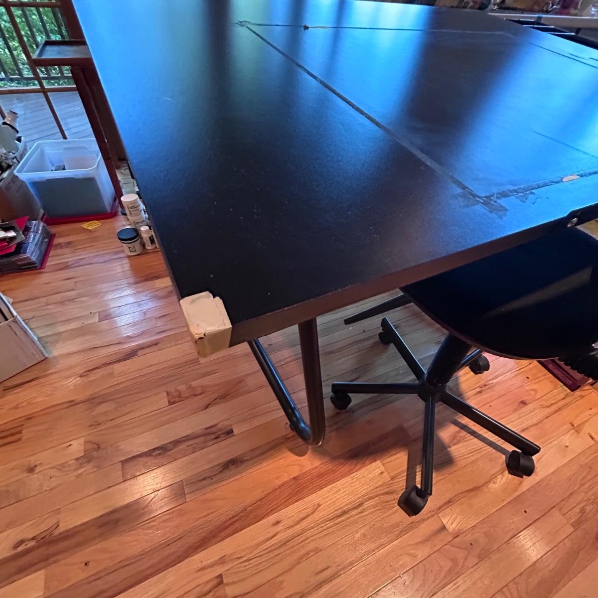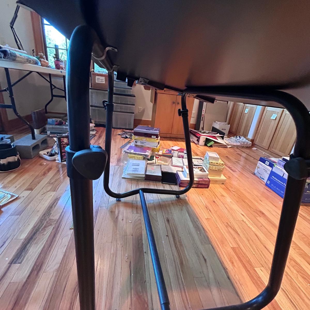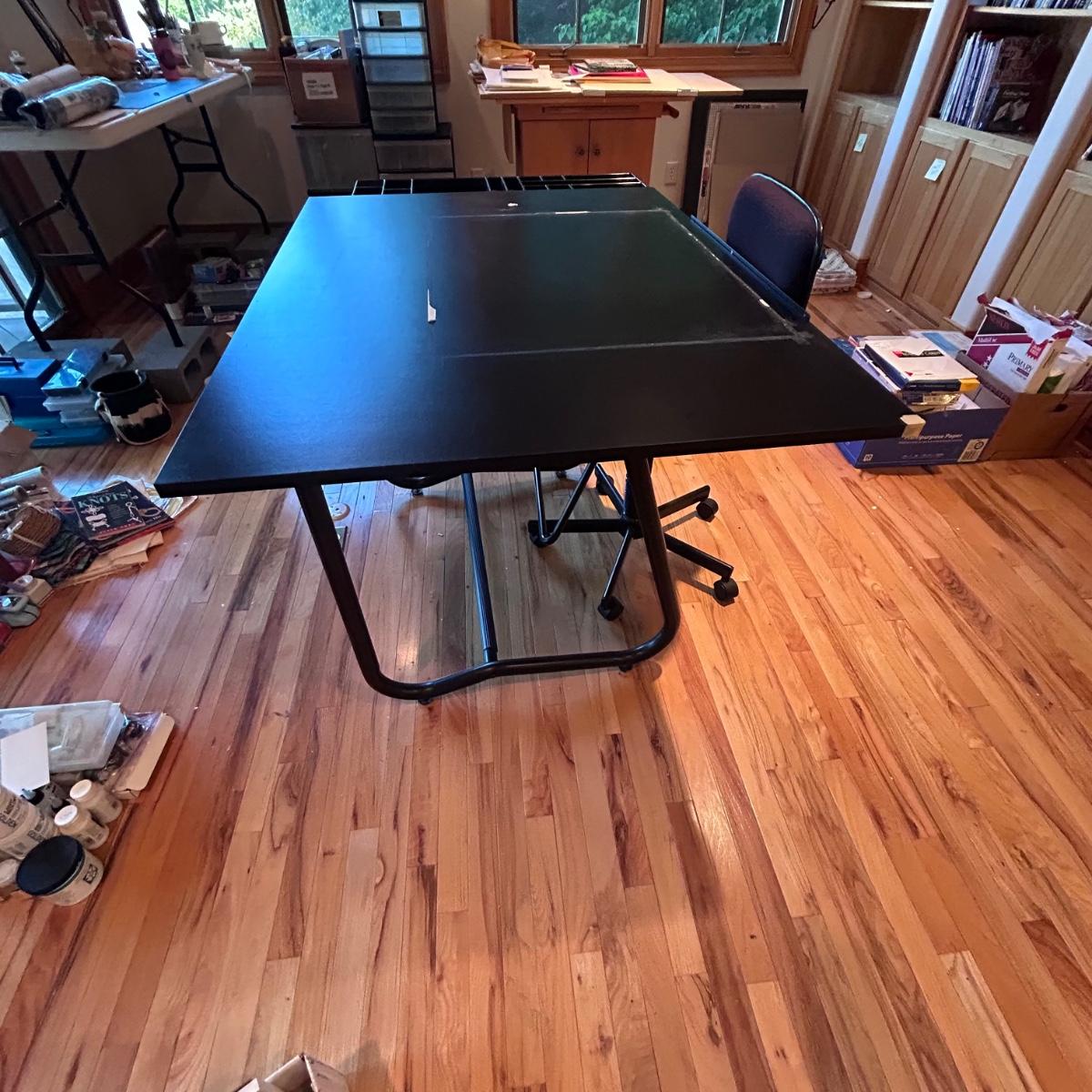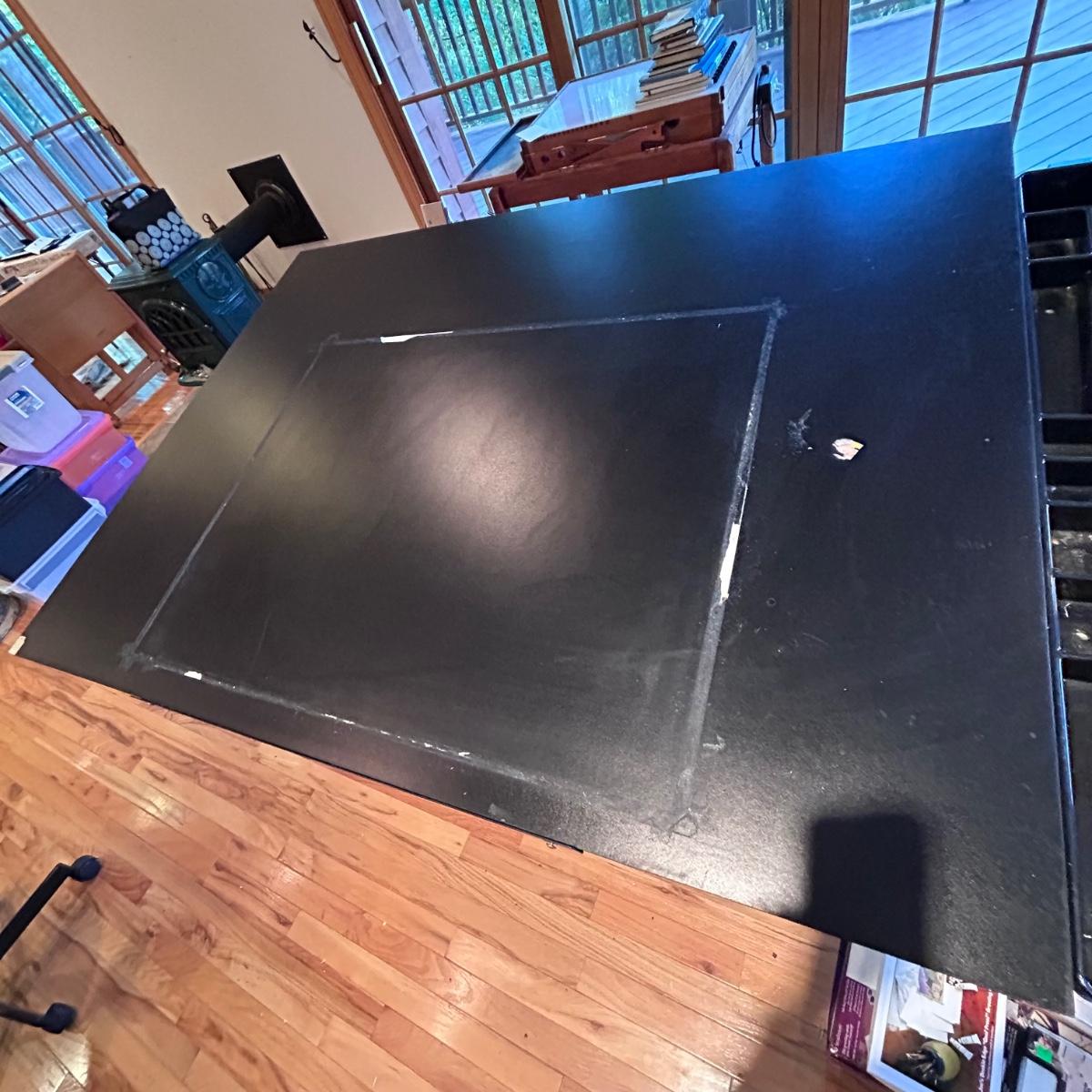 This duo project ensemble is great for all your art projects. The swivel height adjusting chair with foot rest and two other adjustment knobs works great for the drafting style table. The chair at its lowest level measures 22” x 24” x 36.5”H with a 23” seat height. Table has adjustable front and back heights and a guard for angle work. The white marks are tape from past projects. There is tape on one corner that may be damaged. The work tray to the right is plastic but mounted to the table. Measurements are at the lowest settings for transport: 55” x 36” x 32”H. Without the plastic tray the table is 48” wide.