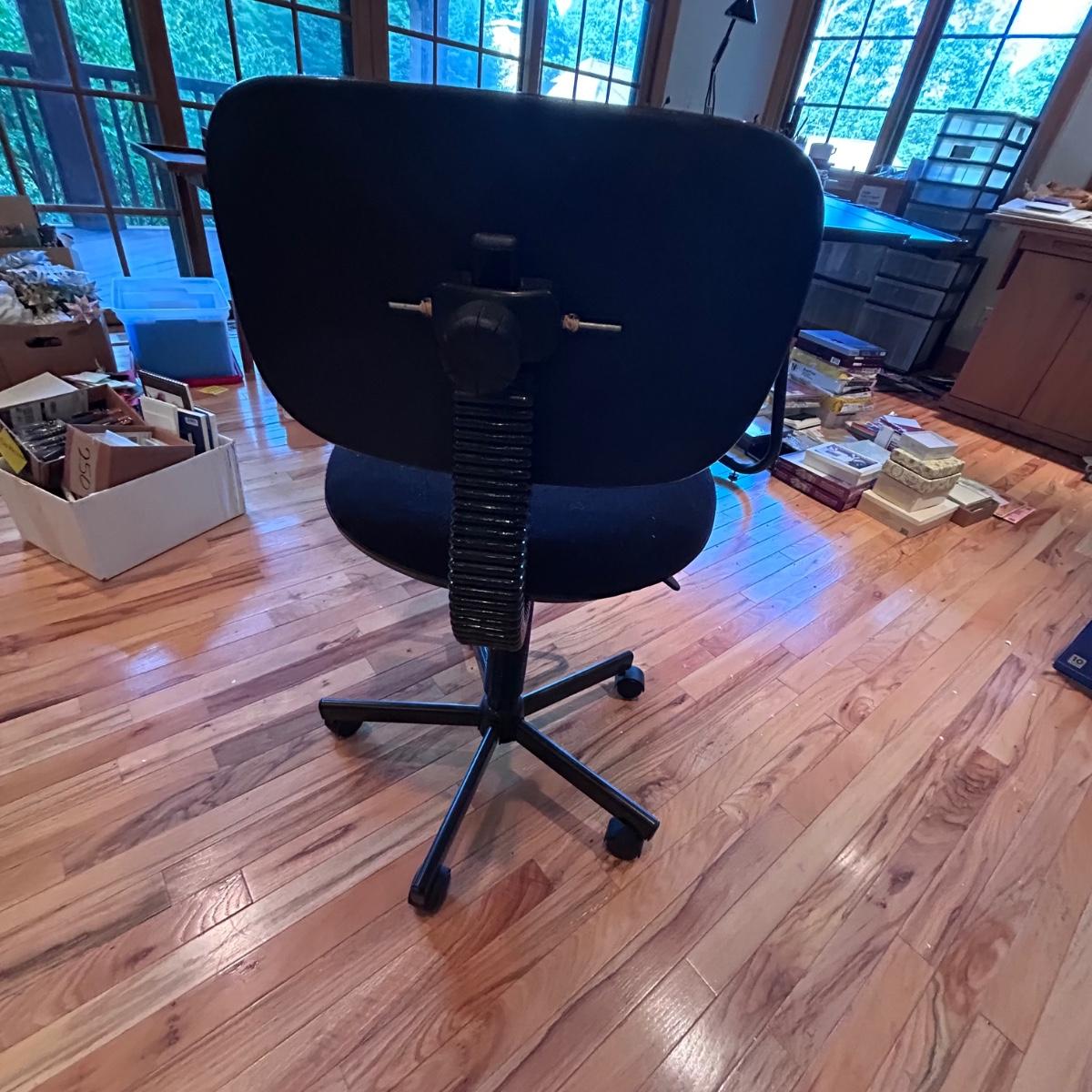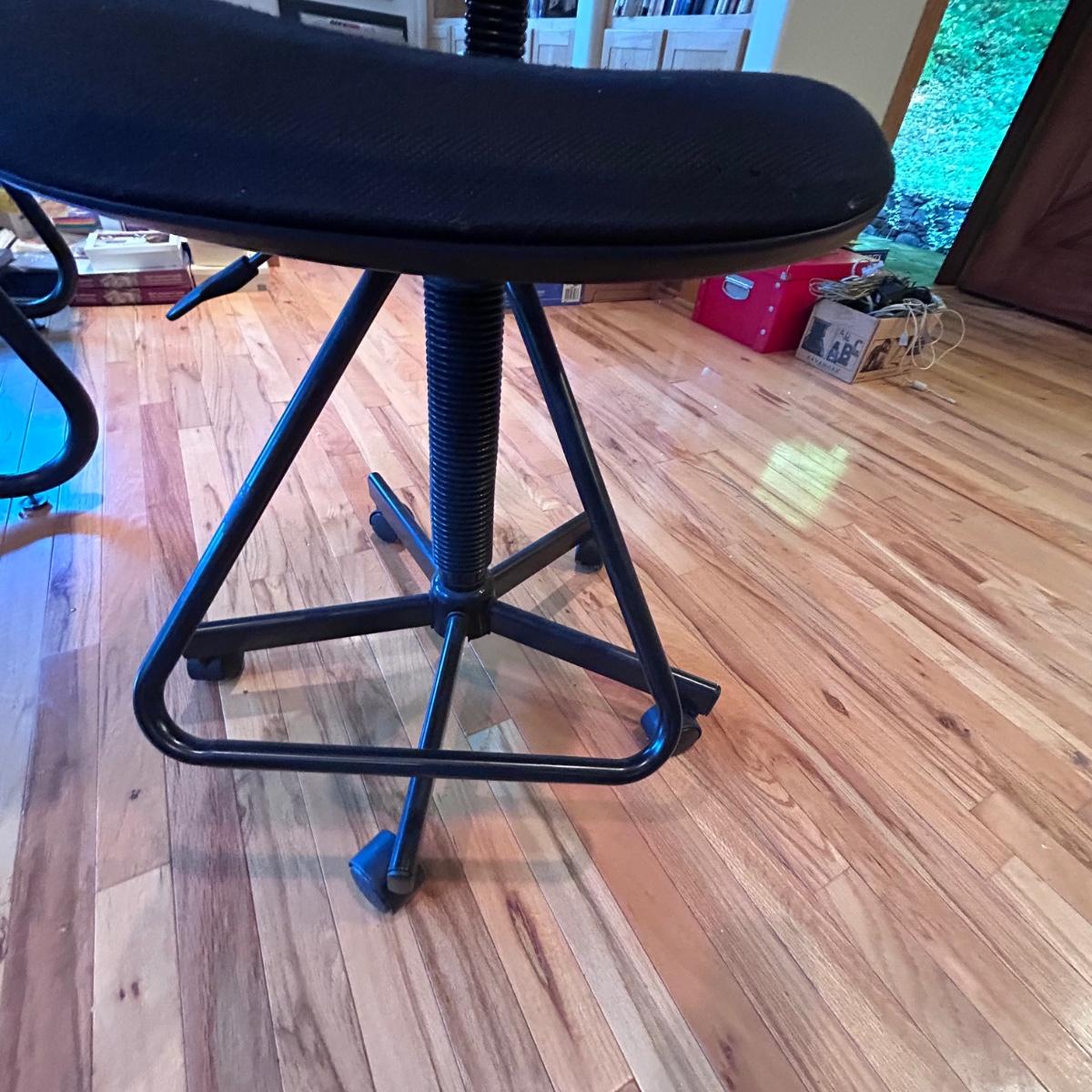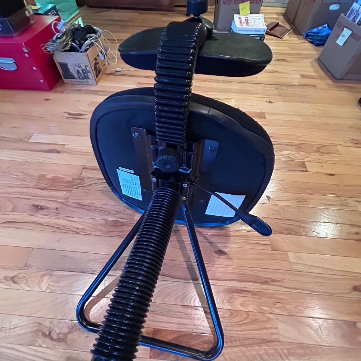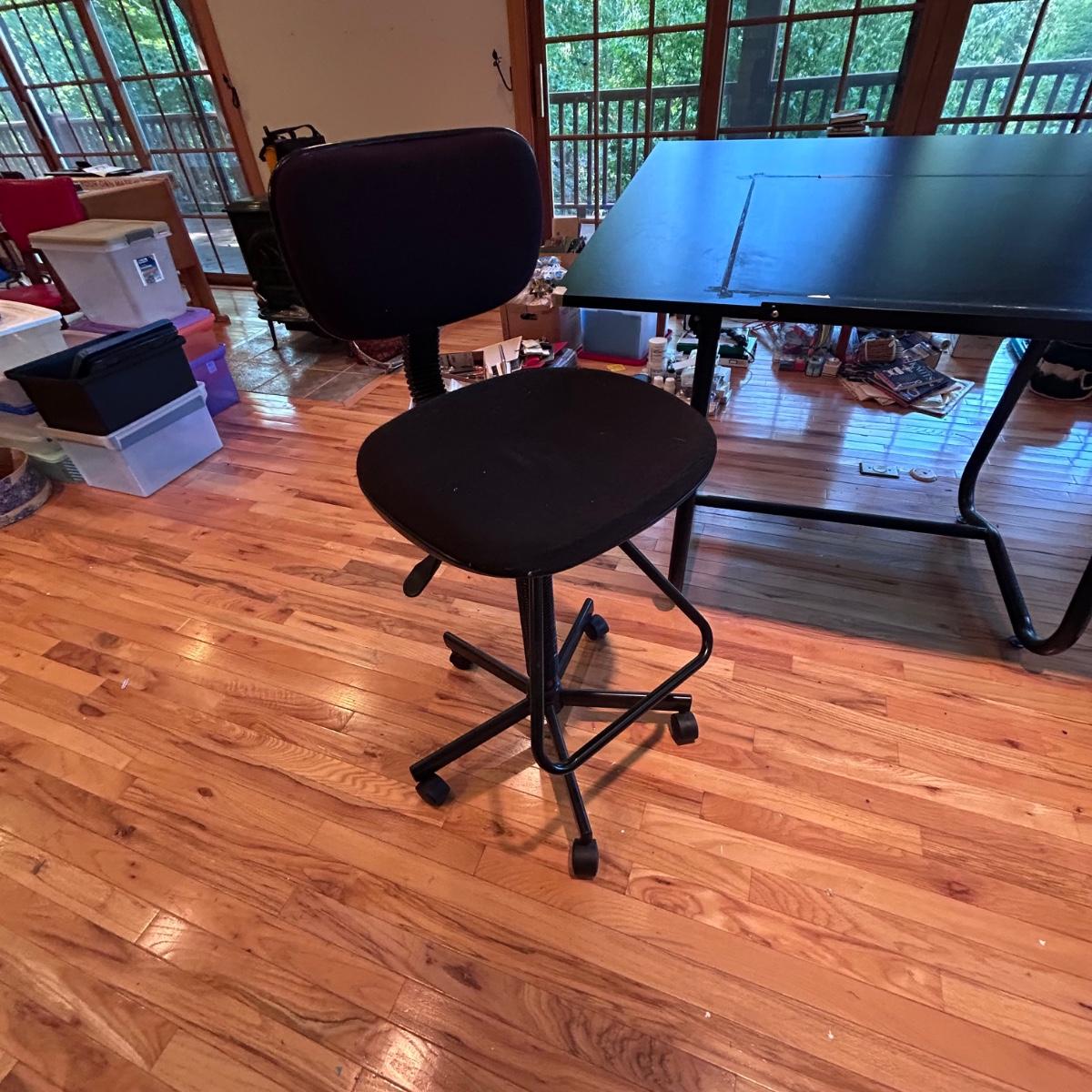 This duo project ensemble is great for all your art projects. The swivel height adjusting chair with foot rest and two other adjustment knobs works great for the drafting style table. The chair at its lowest level measures 22” x 24” x 36.5”H with a 23” seat height. Table has adjustable front and back heights and a guard for angle work. The white marks are tape from past projects. There is tape on one corner that may be damaged. The work tray to the right is plastic but mounted to the table. Measurements are at the lowest settings for transport: 55” x 36” x 32”H. Without the plastic tray the table is 48” wide.