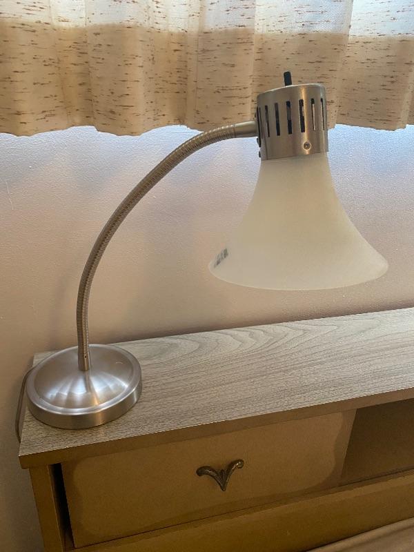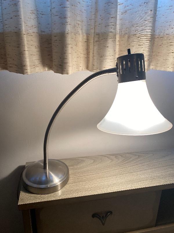 Adjustable desk lamp. Works. Silvertone metal with plastic shade.