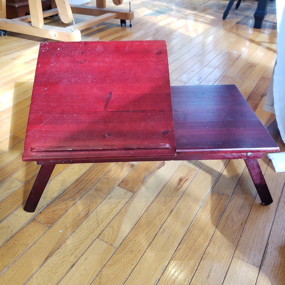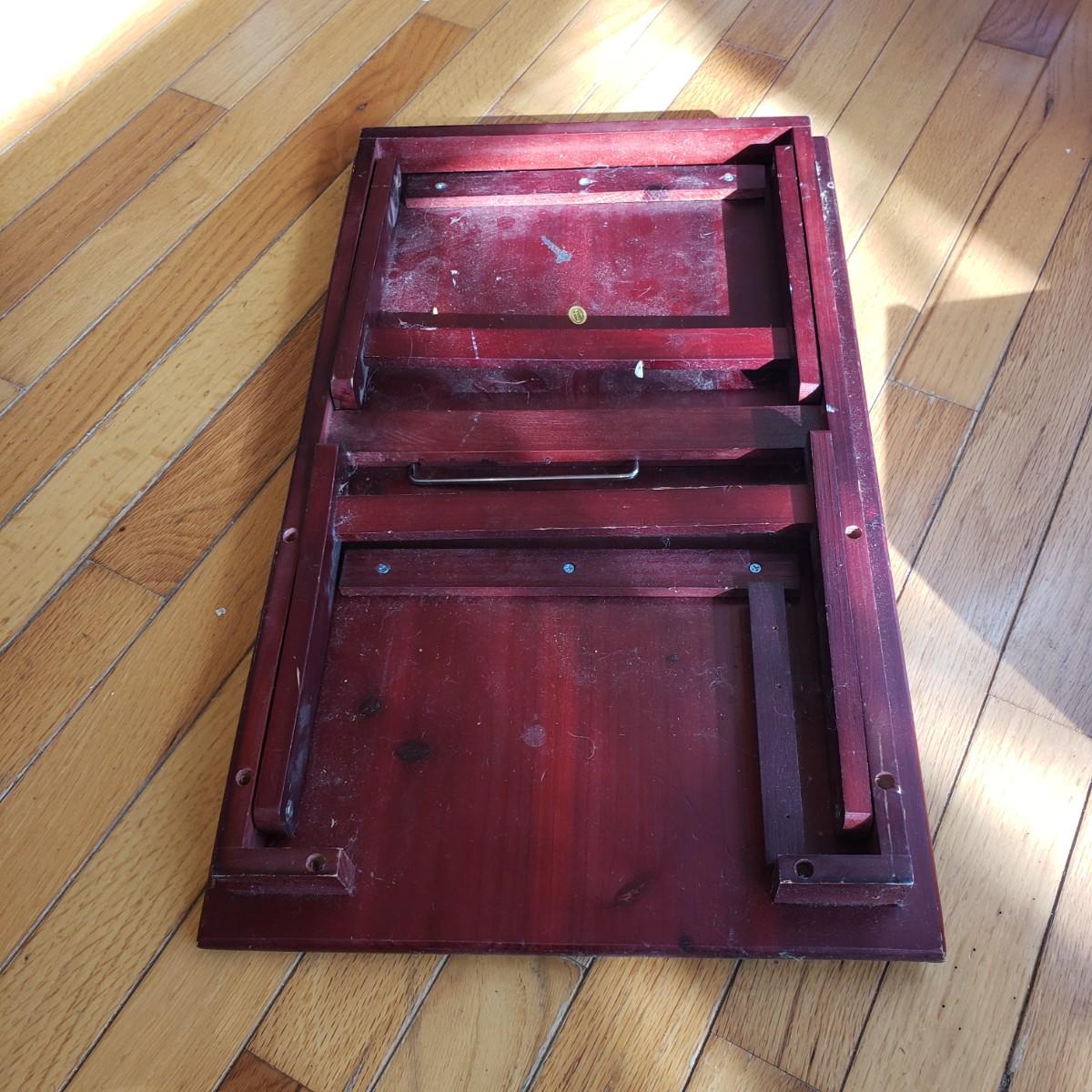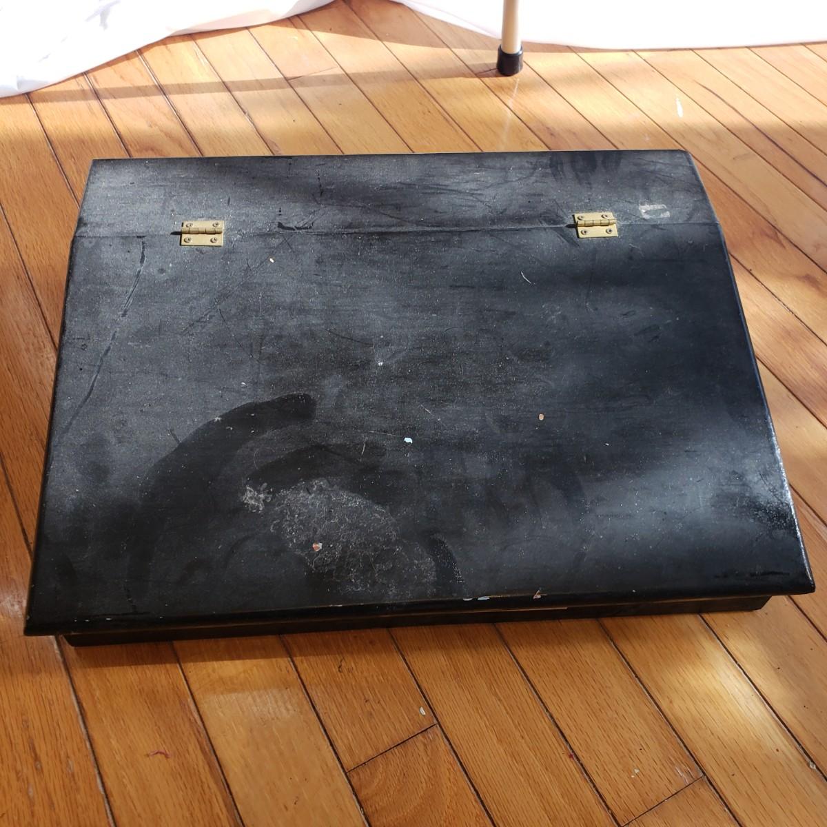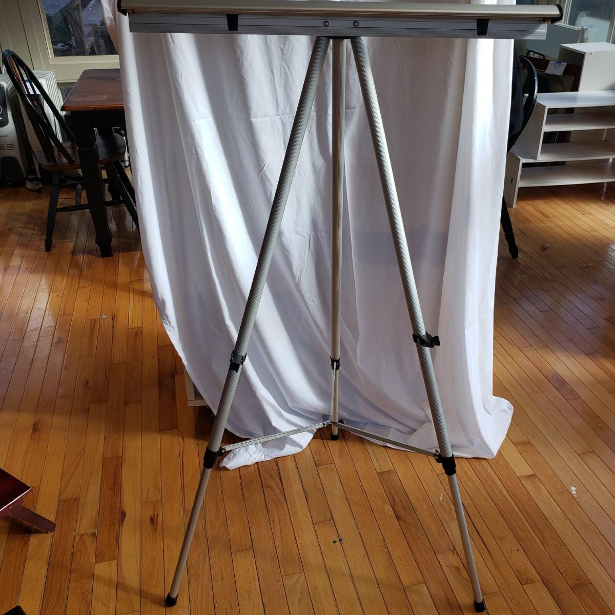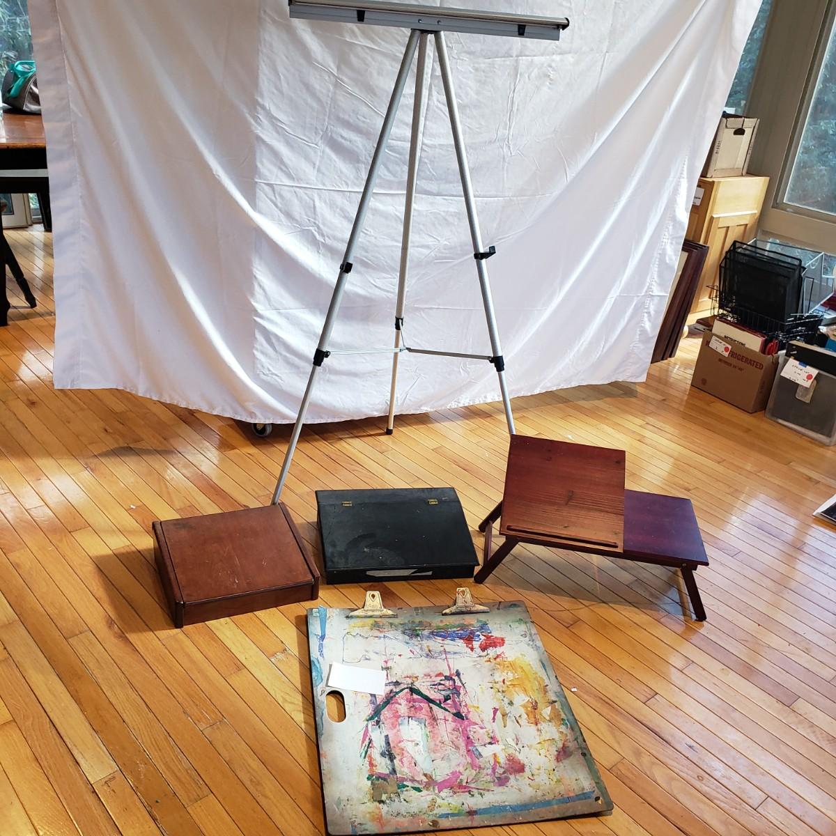 This lot features an adjustable easel, two angled flip top writing/drawing desks, an adjustable TV tray ,and a two-clip tote board. The easel has adjustable legs, two clips that fold down to hold the bottom of a canvas/paper, and two adjustable clips at the top. The two flip top desks each measure approximately 14" x 13" x 4"H. The TV tray has a lip on the bottom of one section and has adjustable height tray. All of it folds down for easy storage. The two clip tote board measures 23" x 26". The board already has inspirational paint on it!