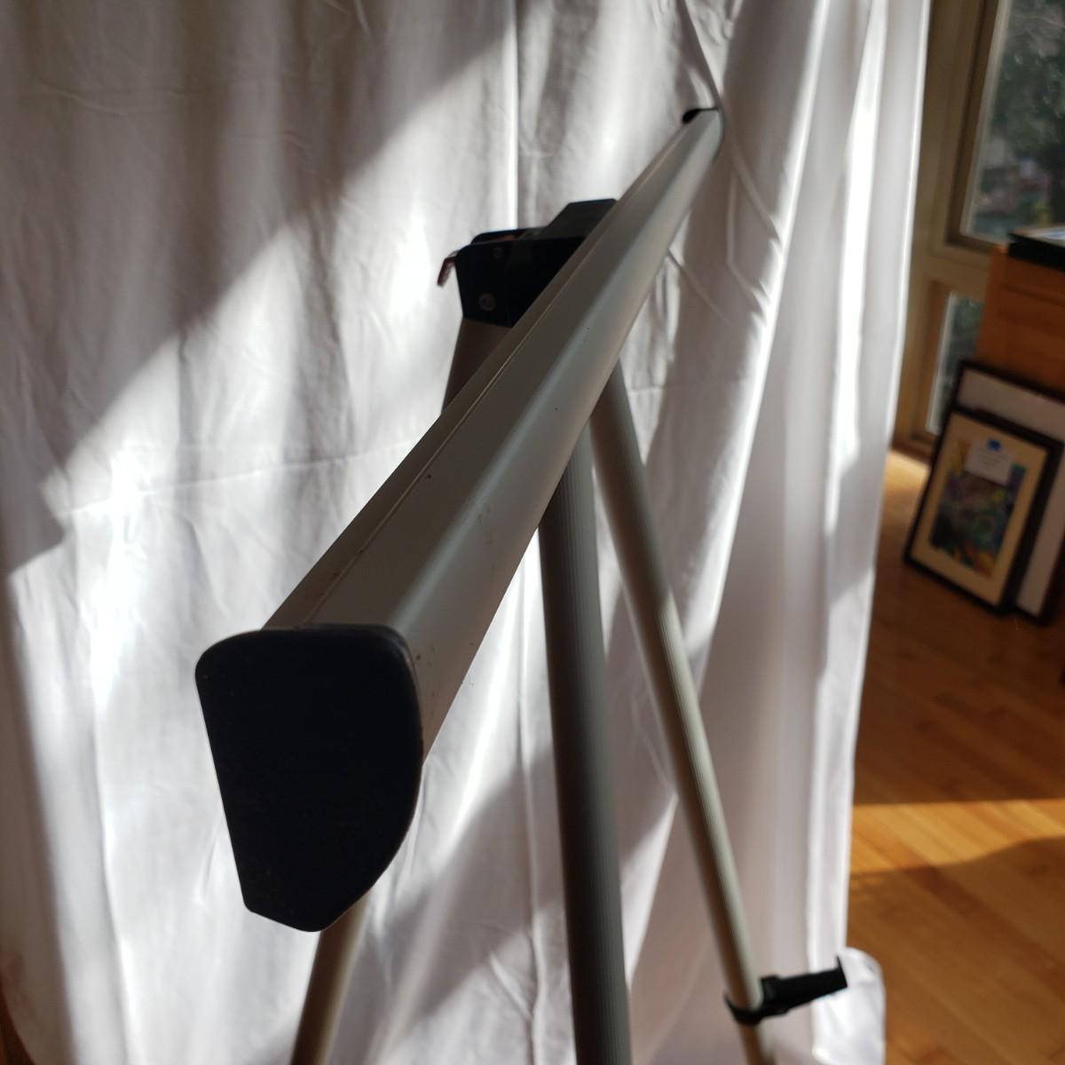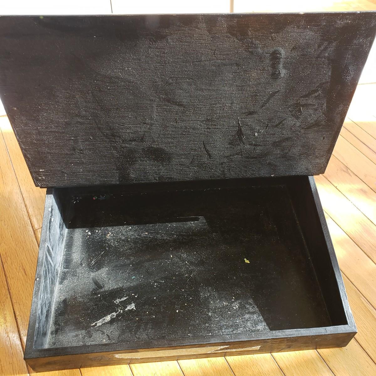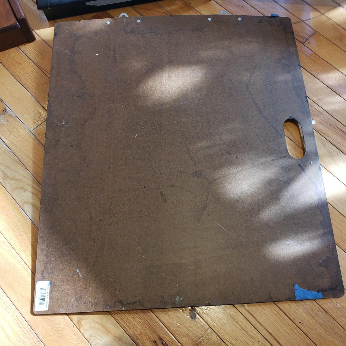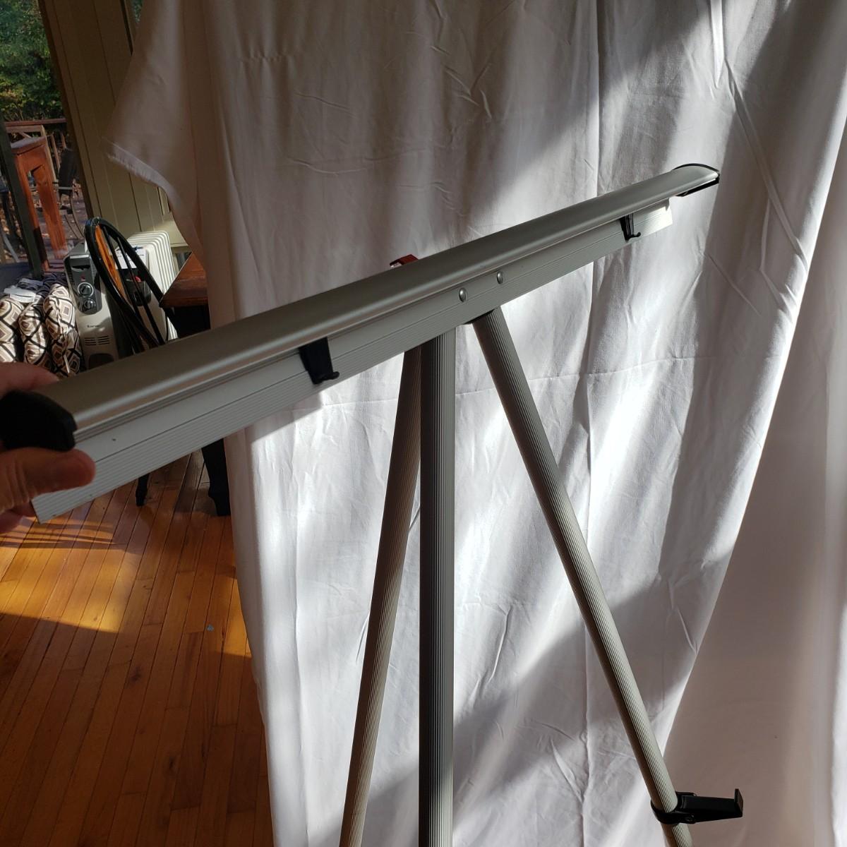 This lot features an adjustable easel, two angled flip top writing/drawing desks, an adjustable TV tray ,and a two-clip tote board. The easel has adjustable legs, two clips that fold down to hold the bottom of a canvas/paper, and two adjustable clips at the top. The two flip top desks each measure approximately 14" x 13" x 4"H. The TV tray has a lip on the bottom of one section and has adjustable height tray. All of it folds down for easy storage. The two clip tote board measures 23" x 26". The board already has inspirational paint on it!
