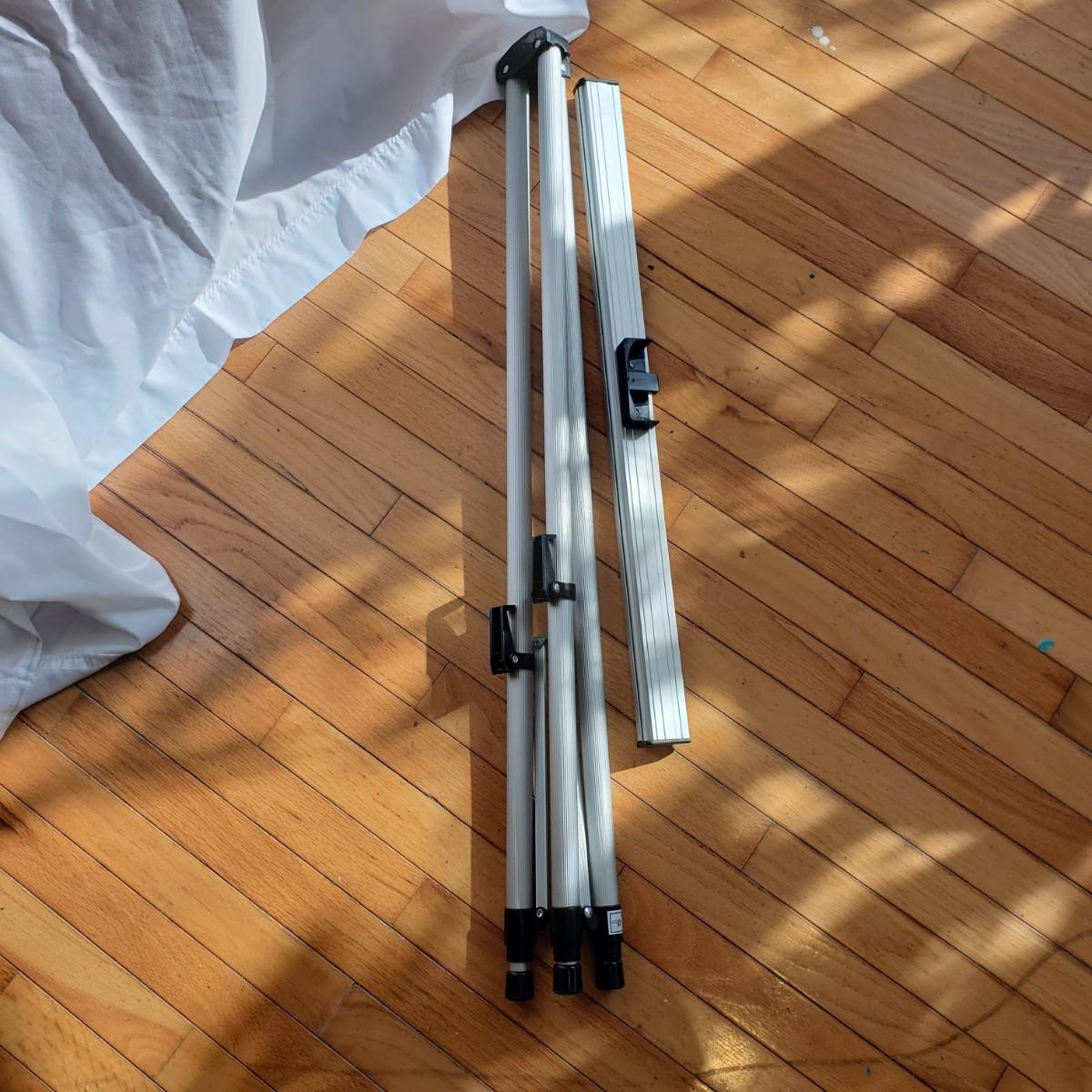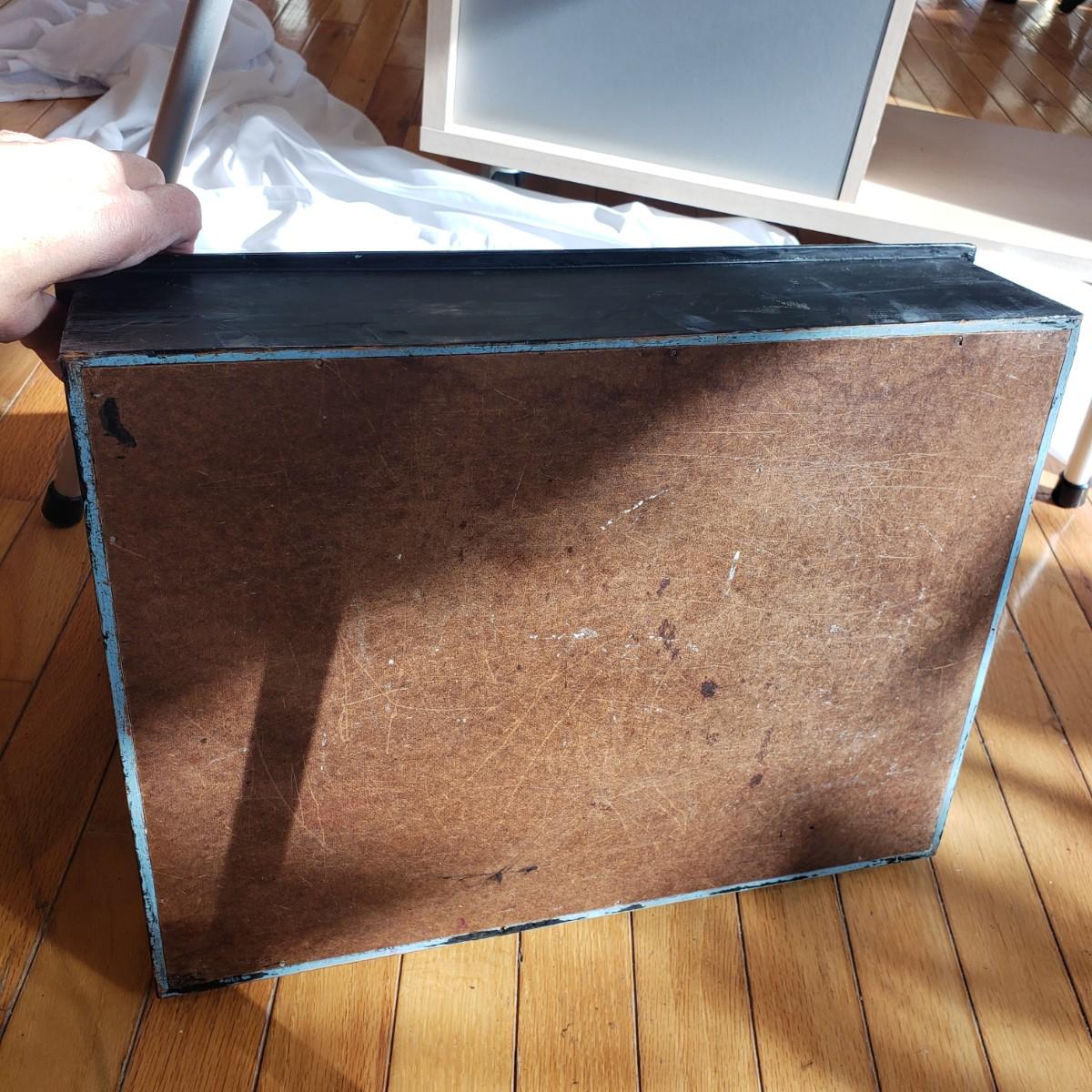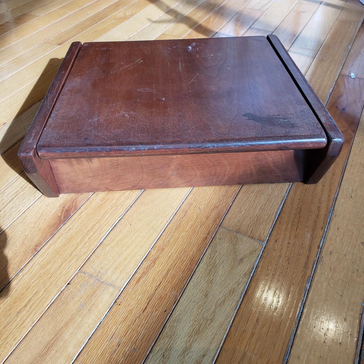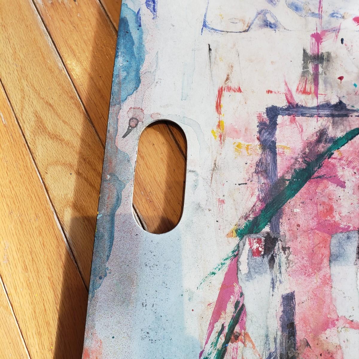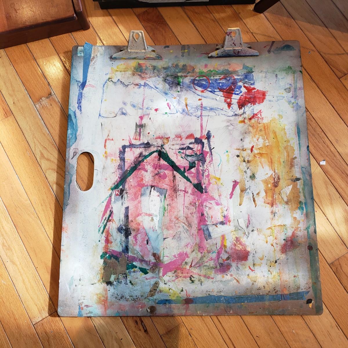 This lot features an adjustable easel, two angled flip top writing/drawing desks, an adjustable TV tray ,and a two-clip tote board. The easel has adjustable legs, two clips that fold down to hold the bottom of a canvas/paper, and two adjustable clips at the top. The two flip top desks each measure approximately 14" x 13" x 4"H. The TV tray has a lip on the bottom of one section and has adjustable height tray. All of it folds down for easy storage. The two clip tote board measures 23" x 26". The board already has inspirational paint on it!