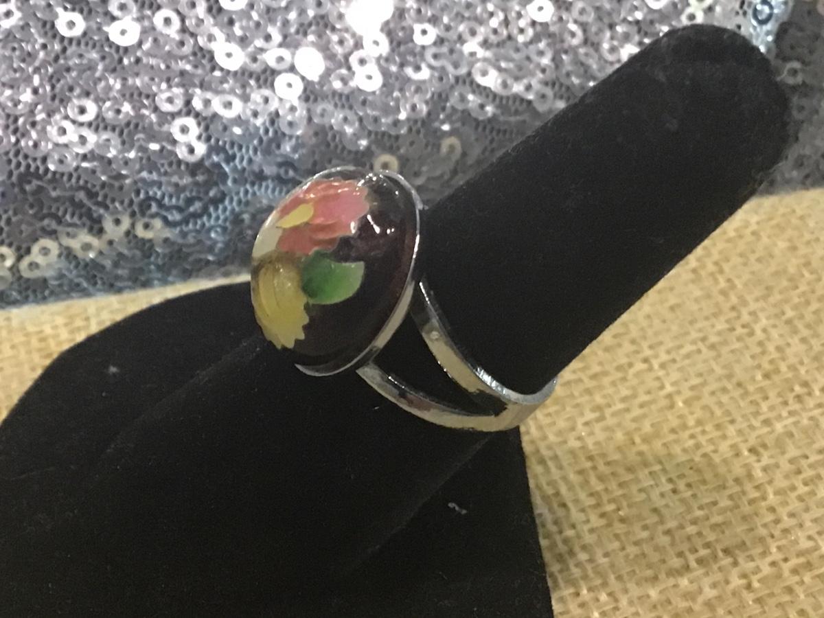 Adjustable Glass Ring Floral Flowers Silver Tone Pink Yellow Green
