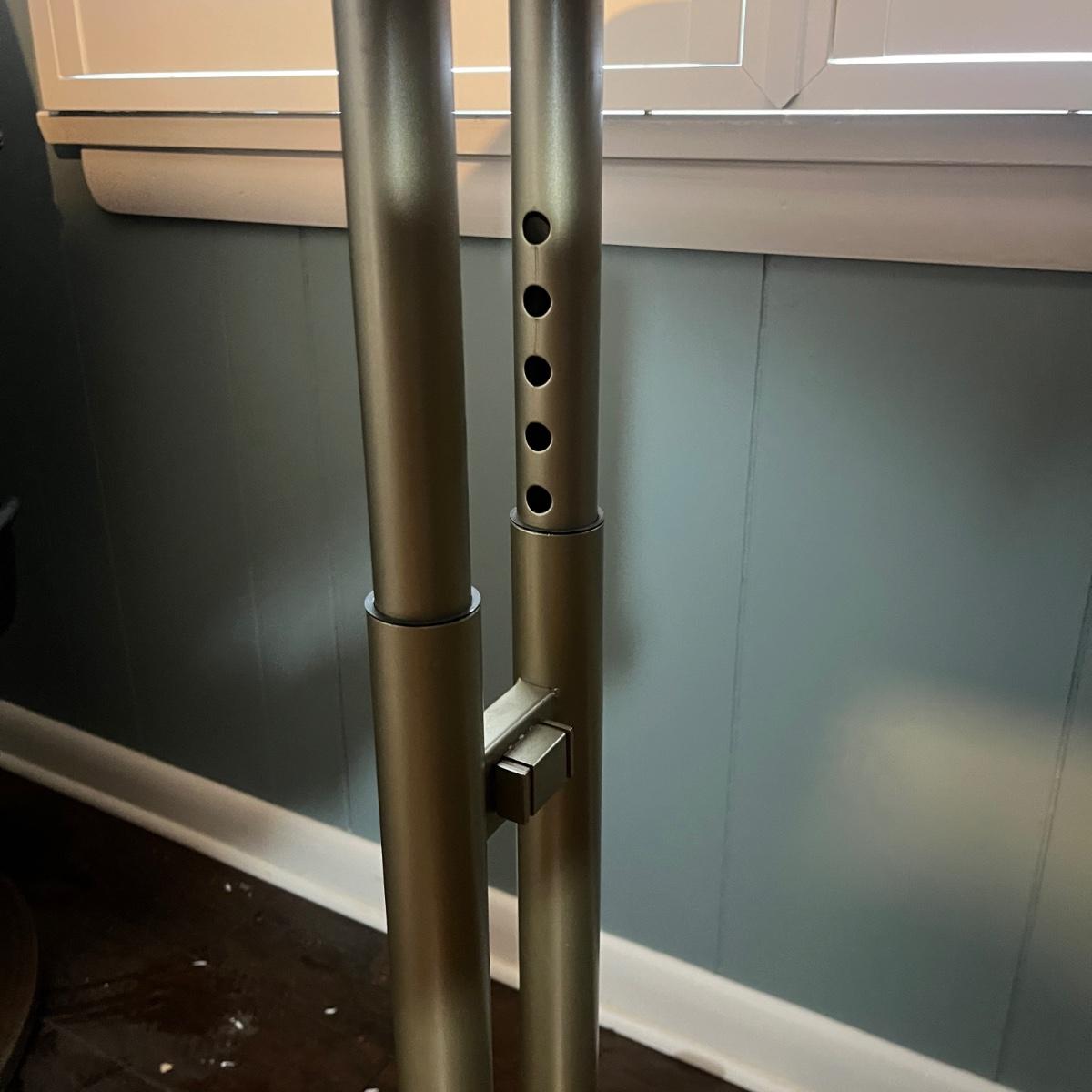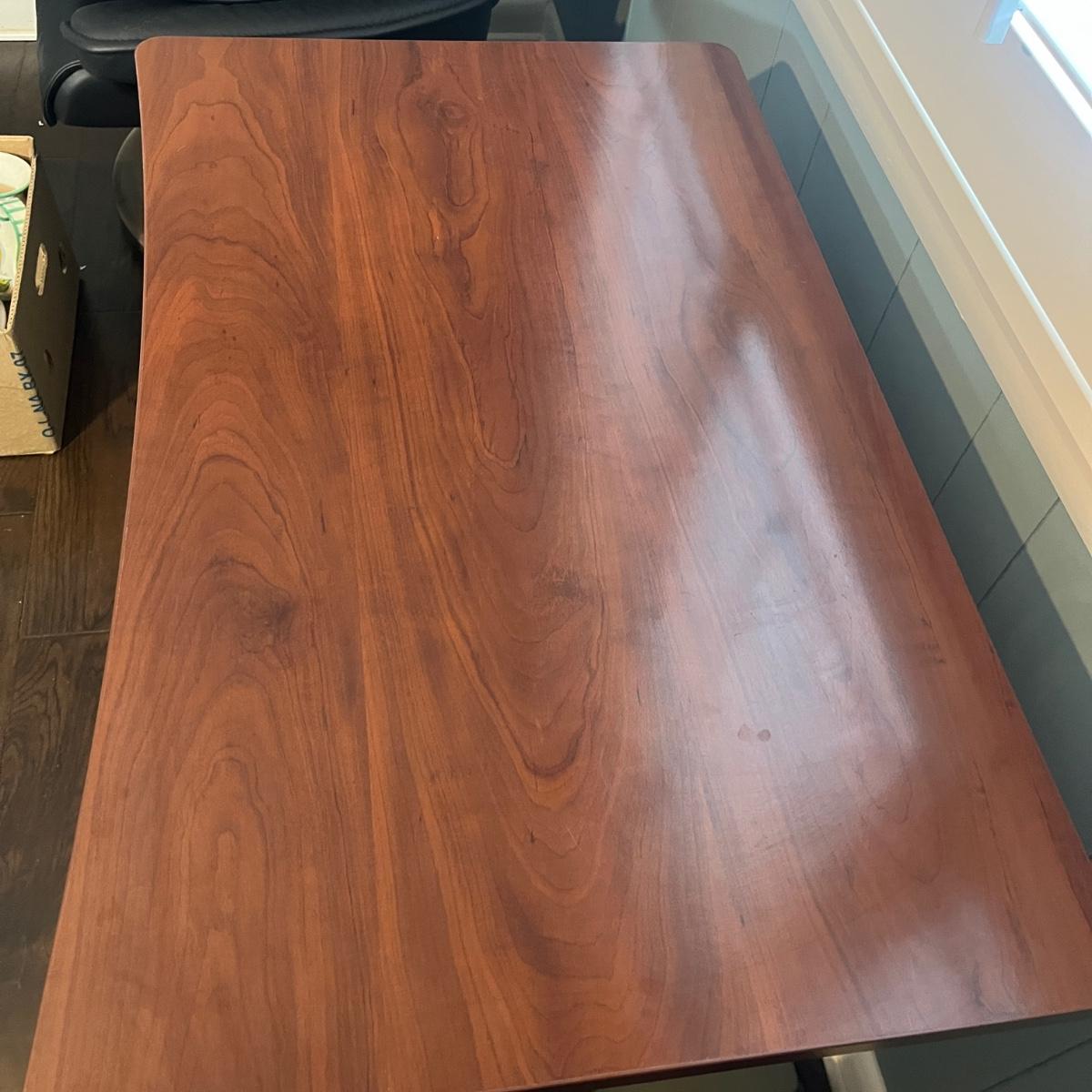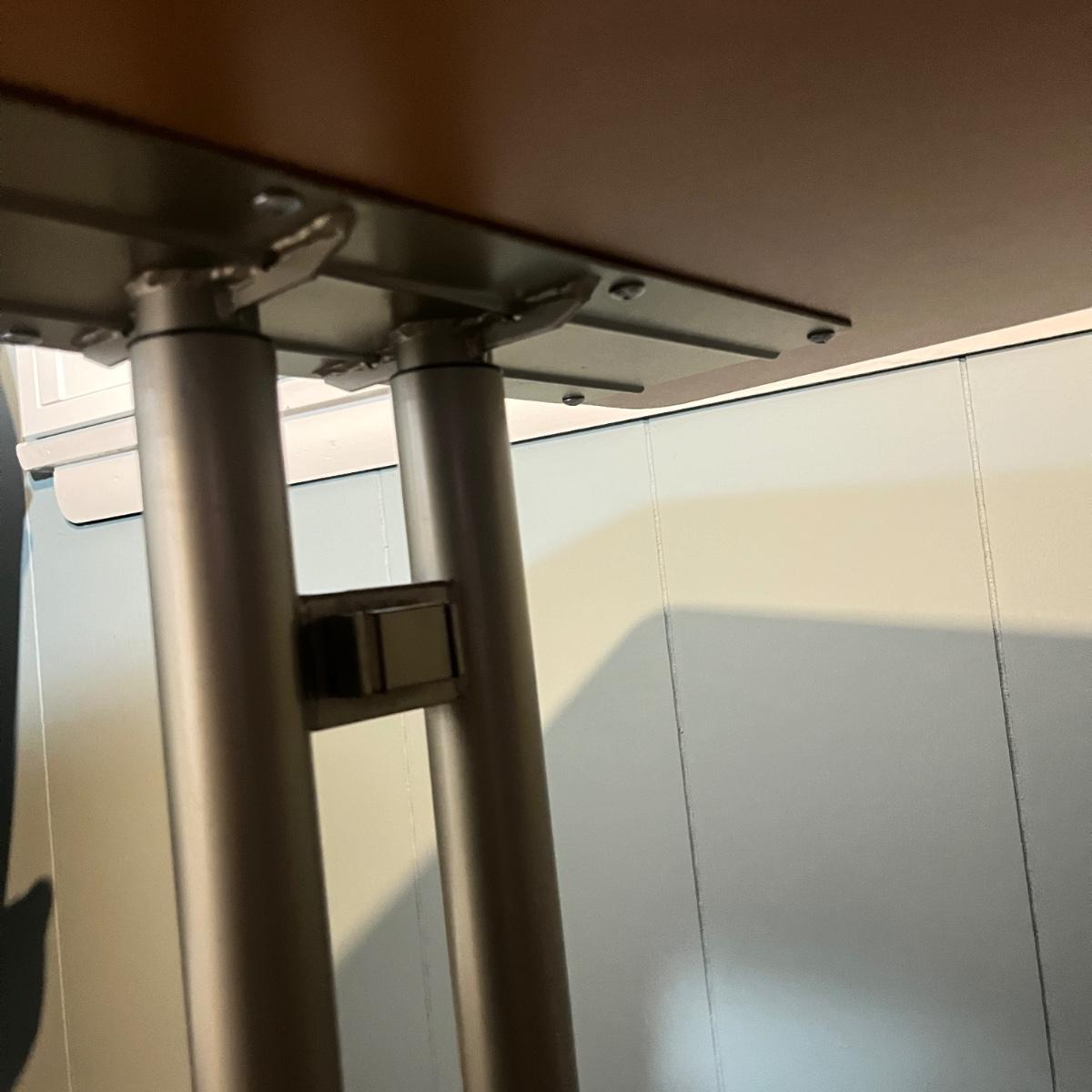 This adjustable height desk has a wooden veneer top with metal legs and plastic wheels. Desk measures 22.5" x 35.5" x 27.5"-36"H.