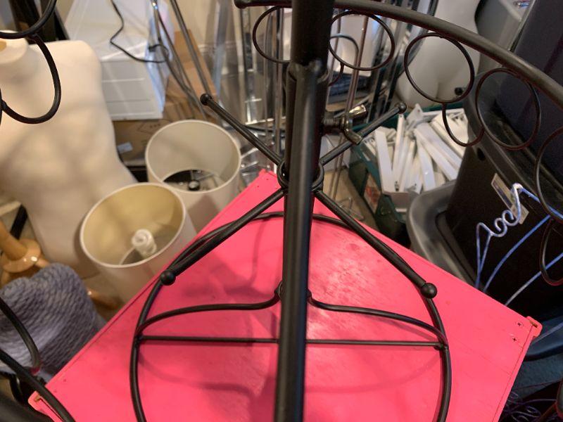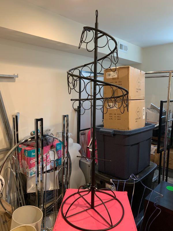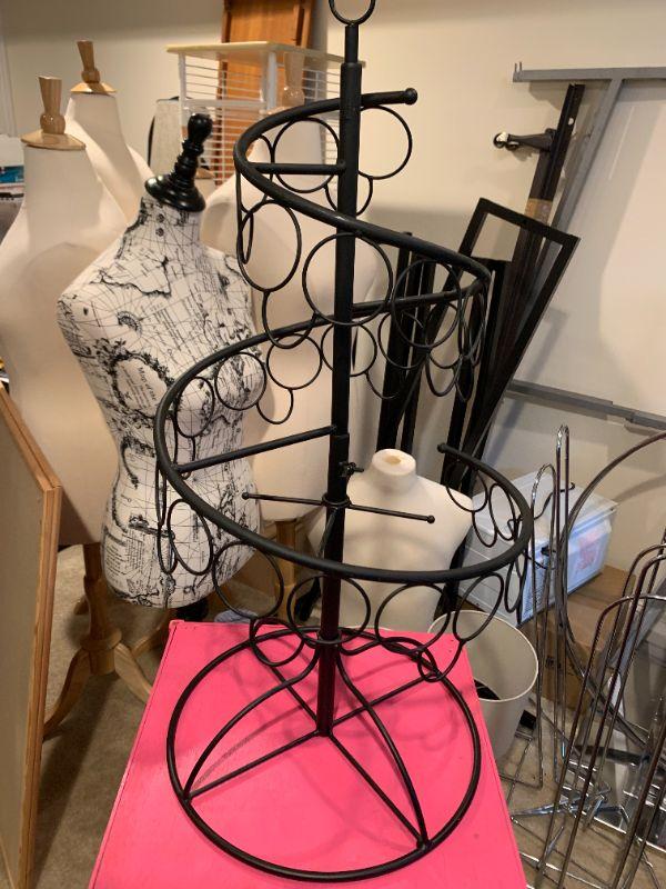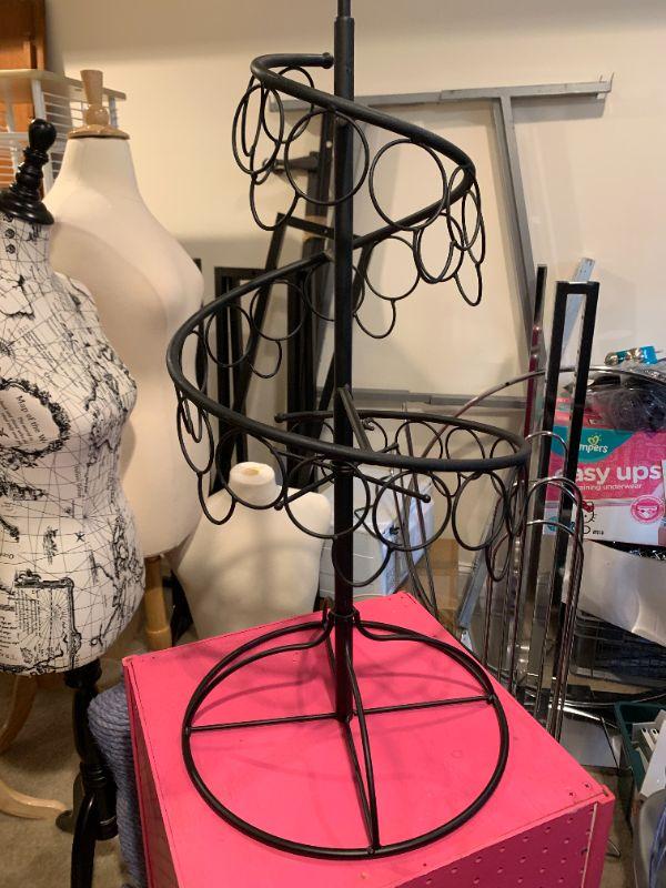 Twisty round display stand with tons of space to hang scarves, jewelry, etc. Does not rotate.