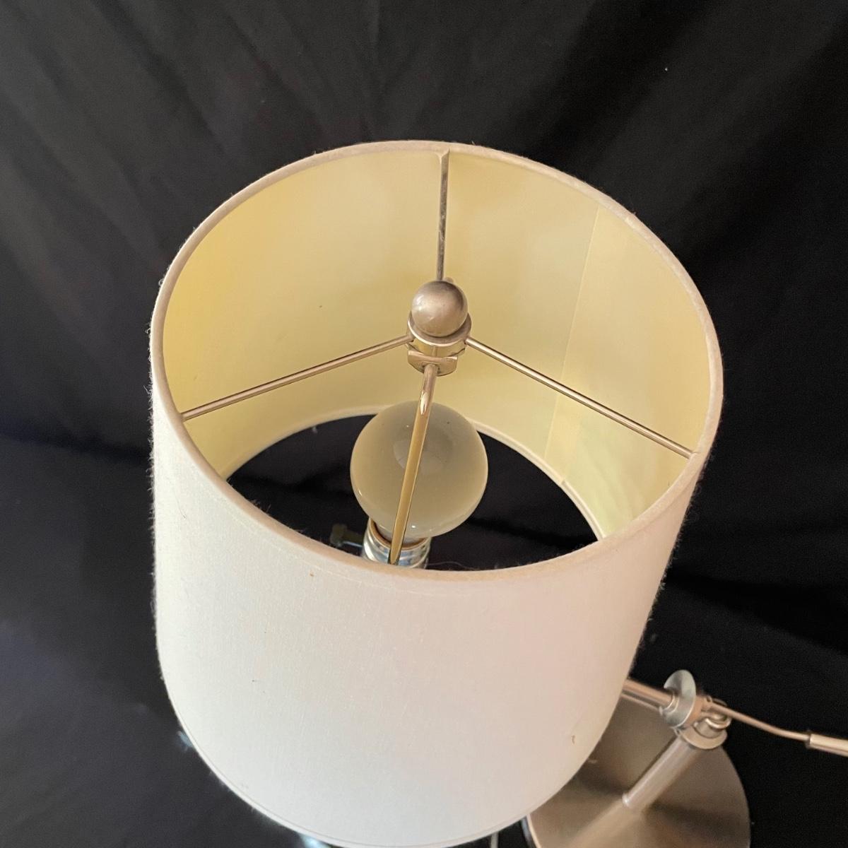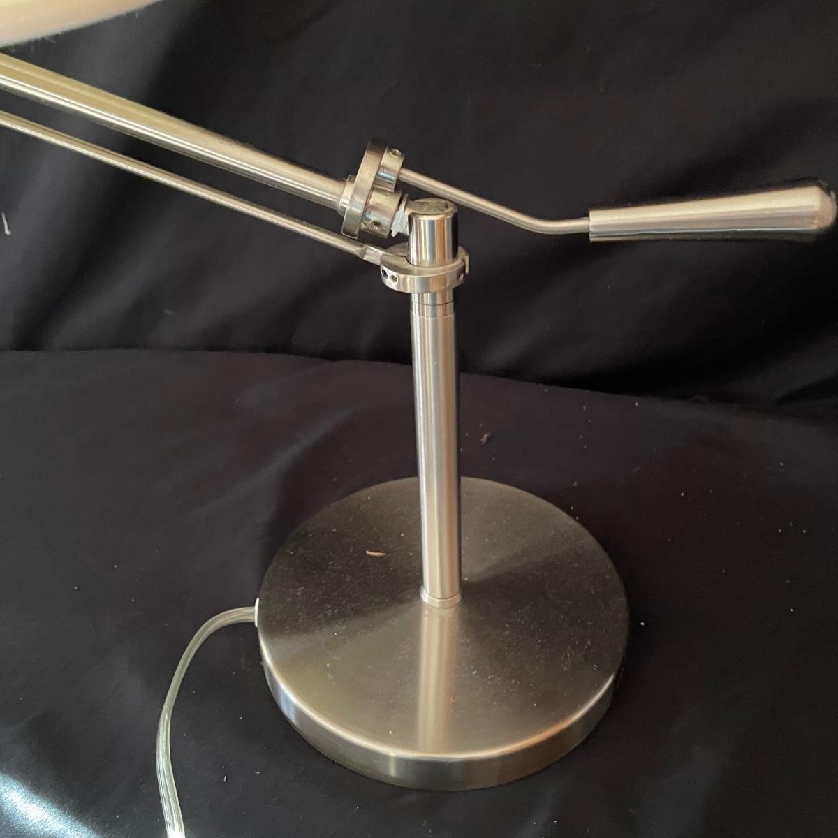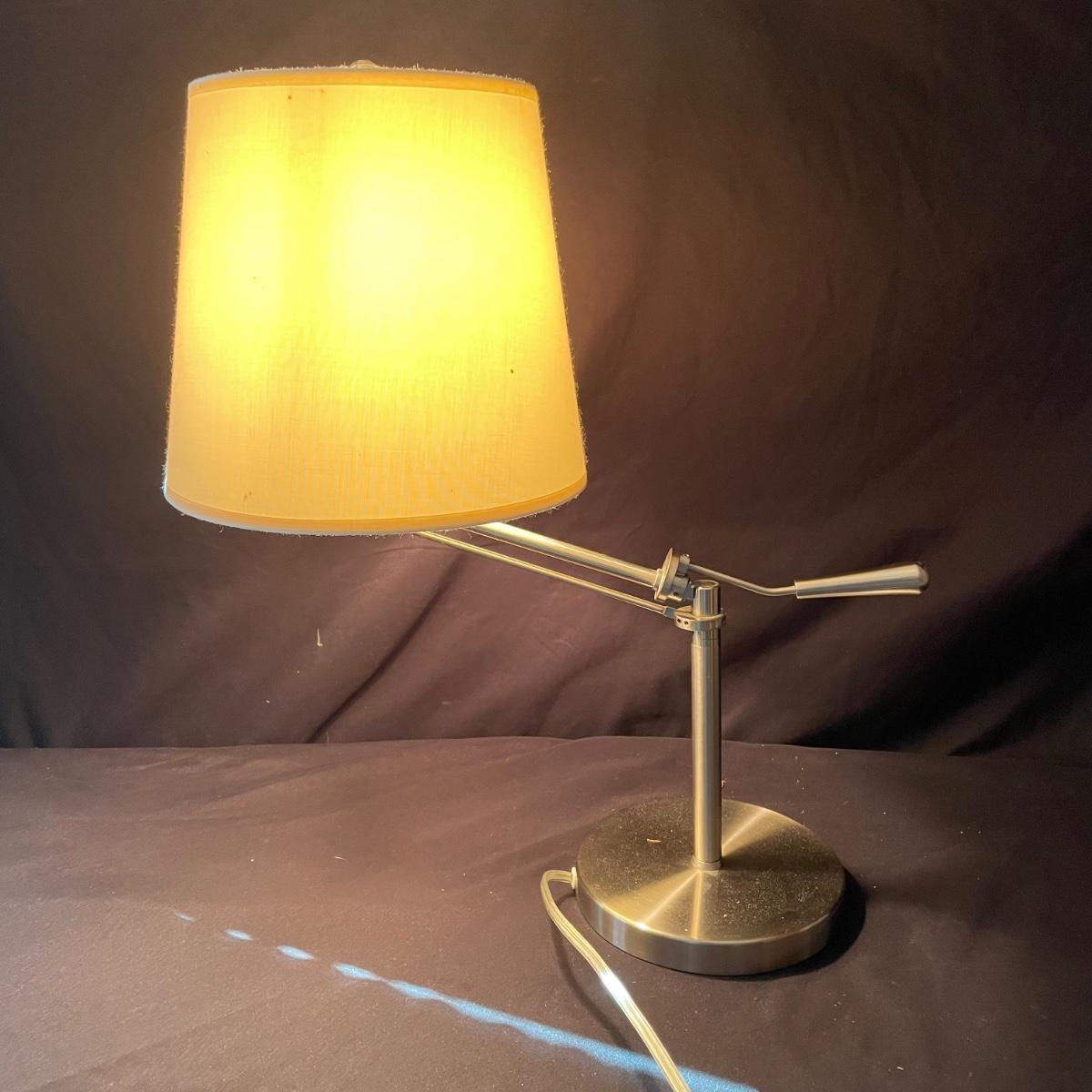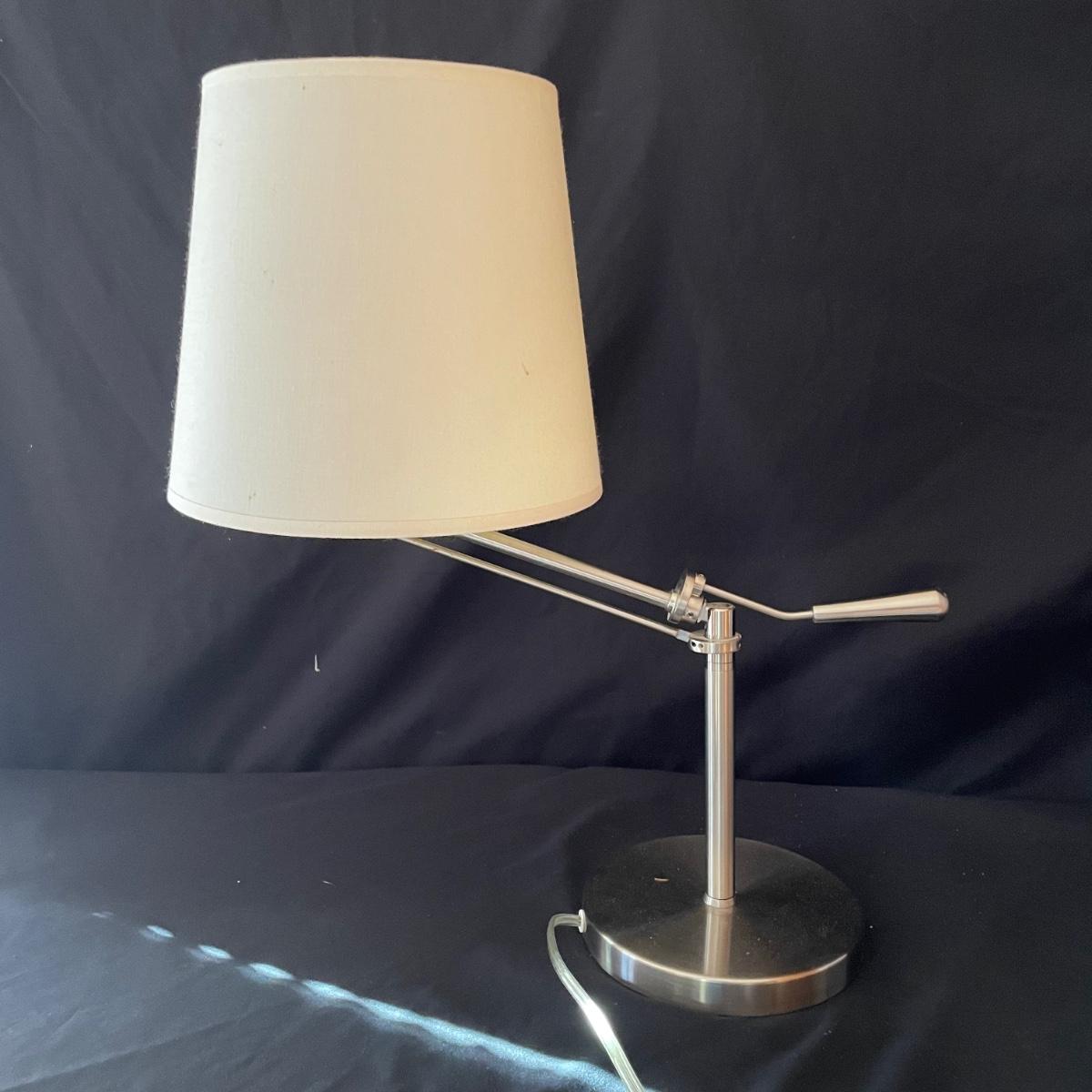 This metal table lamp is very versatile with multiple height/angle options. It comes with a white lamp shade. Good condition with a clean shade. Lamp turned on when tested.