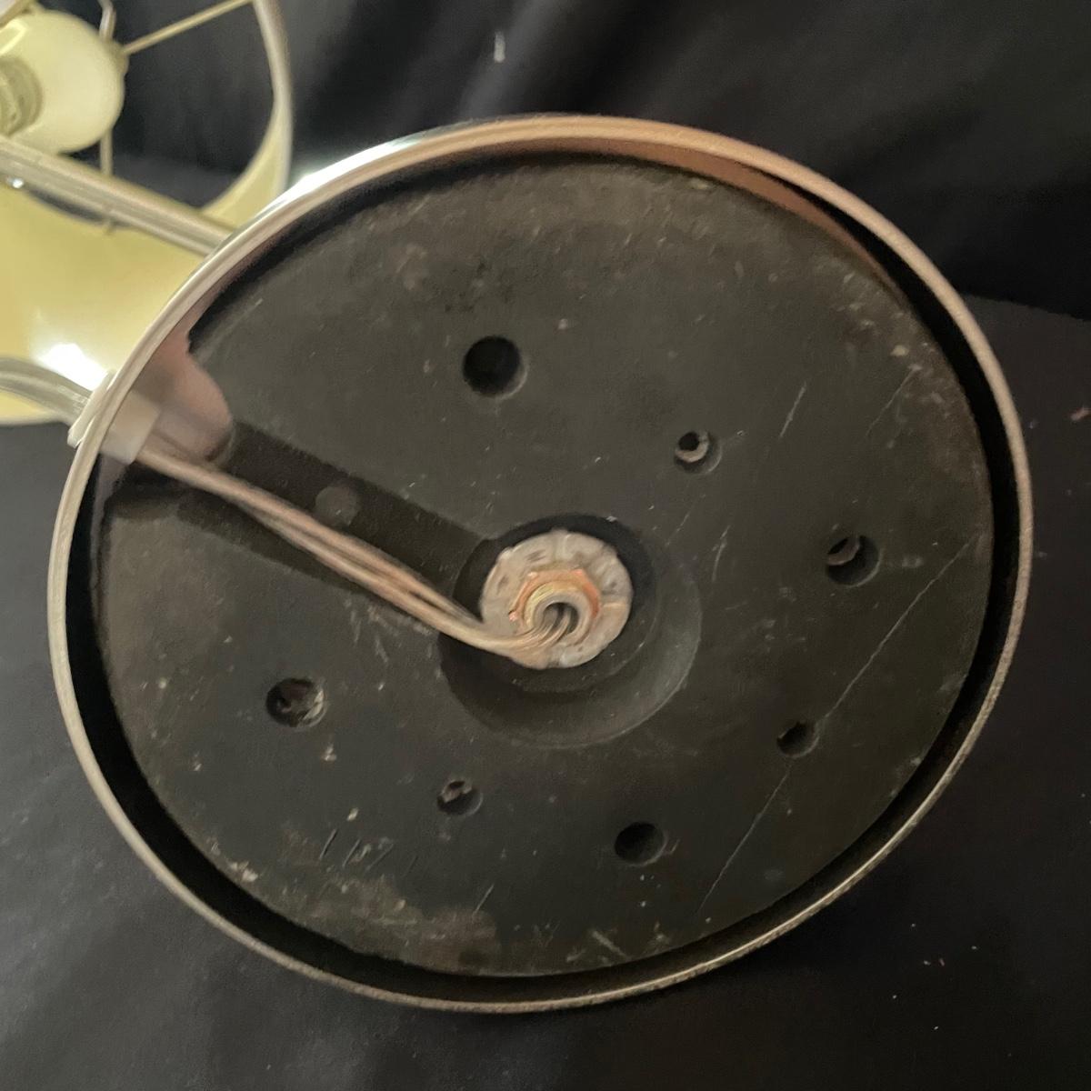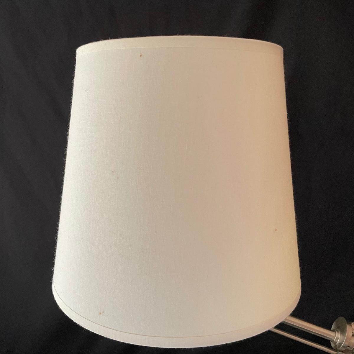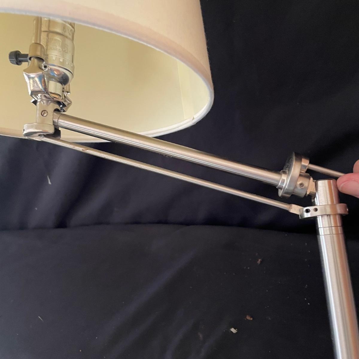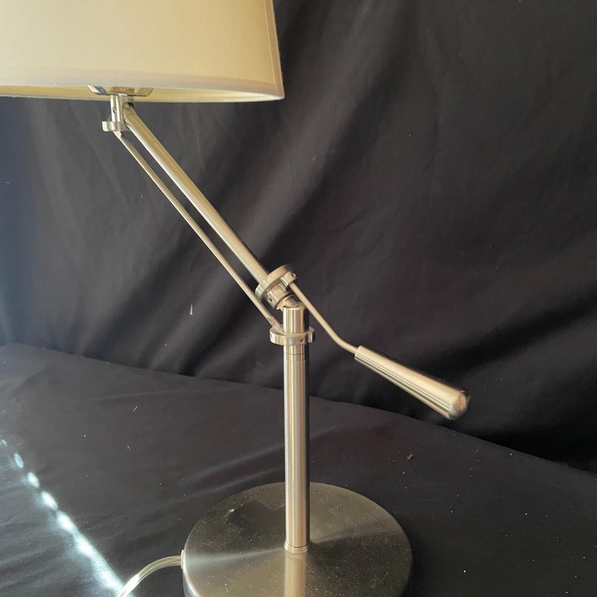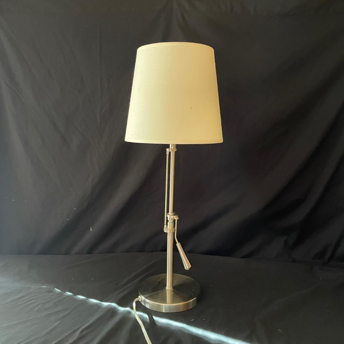 This metal table lamp is very versatile with multiple height/angle options. It comes with a white lamp shade. Good condition with a clean shade. Lamp turned on when tested.