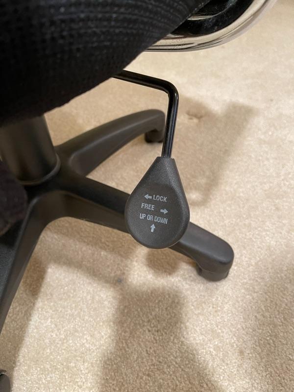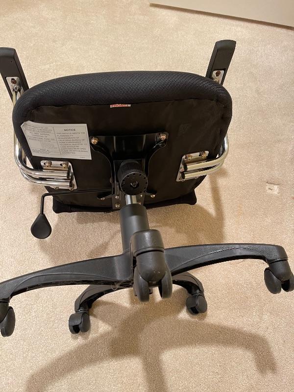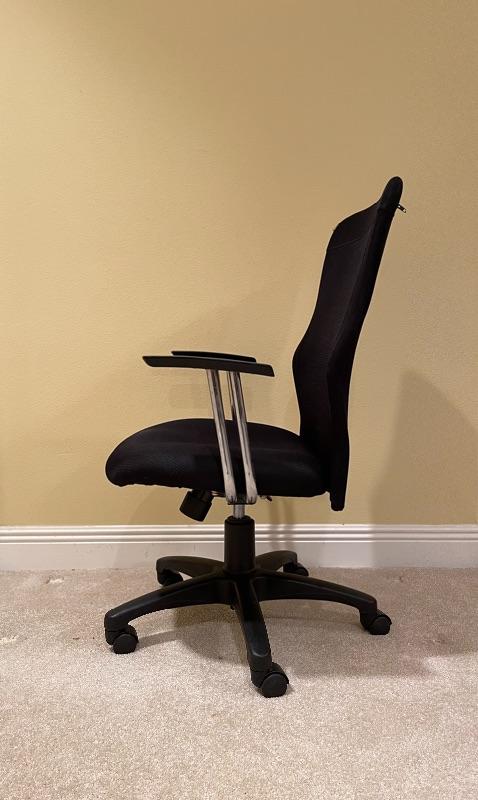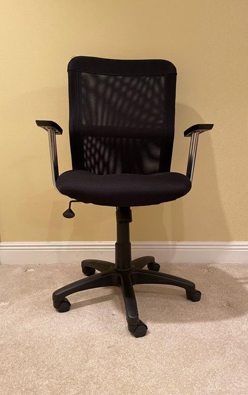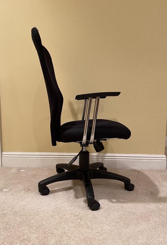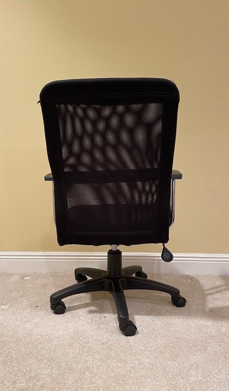 Black with black mesh and chrome arms. Adjusts up, down, and tilt.. Swivels and has 5 caster feet.