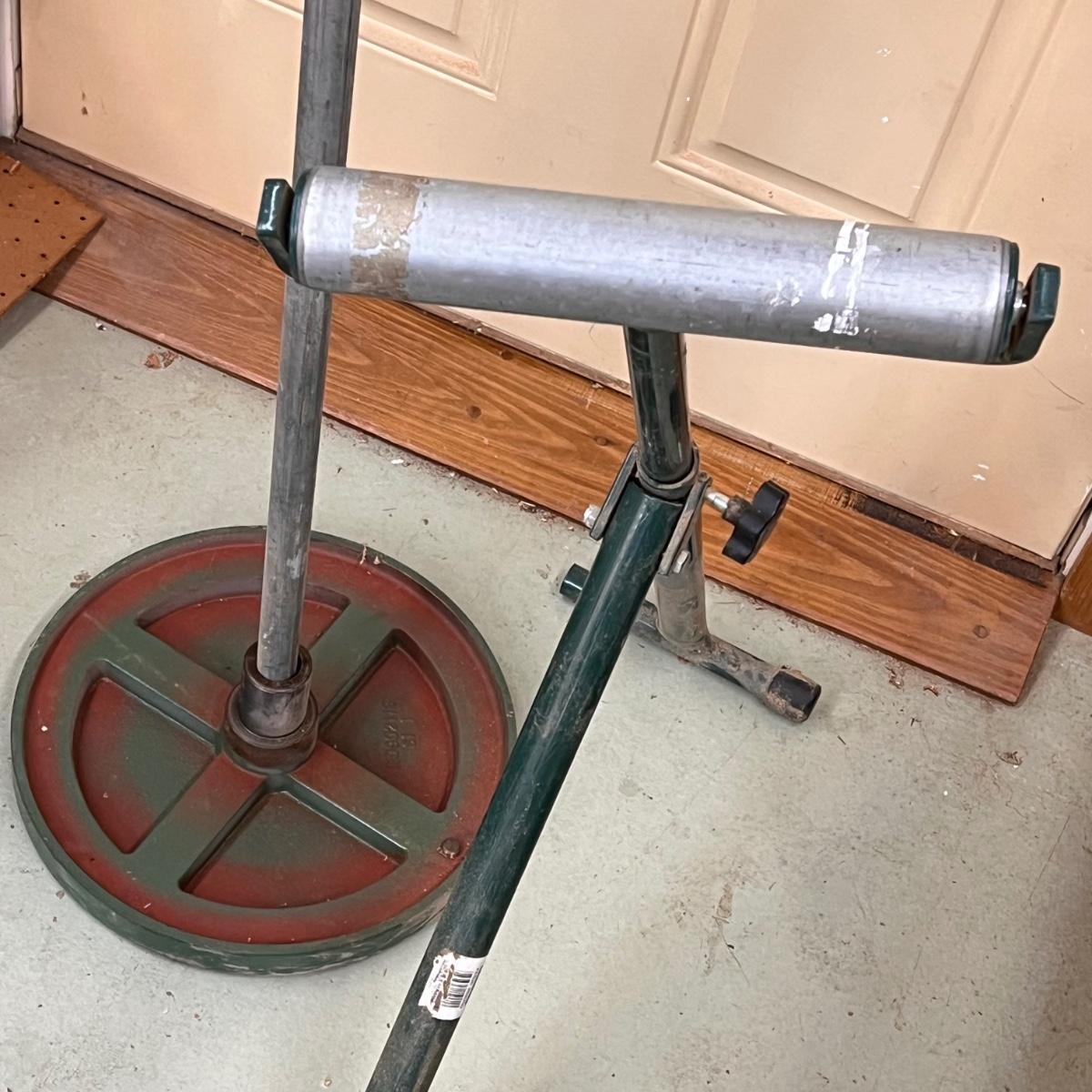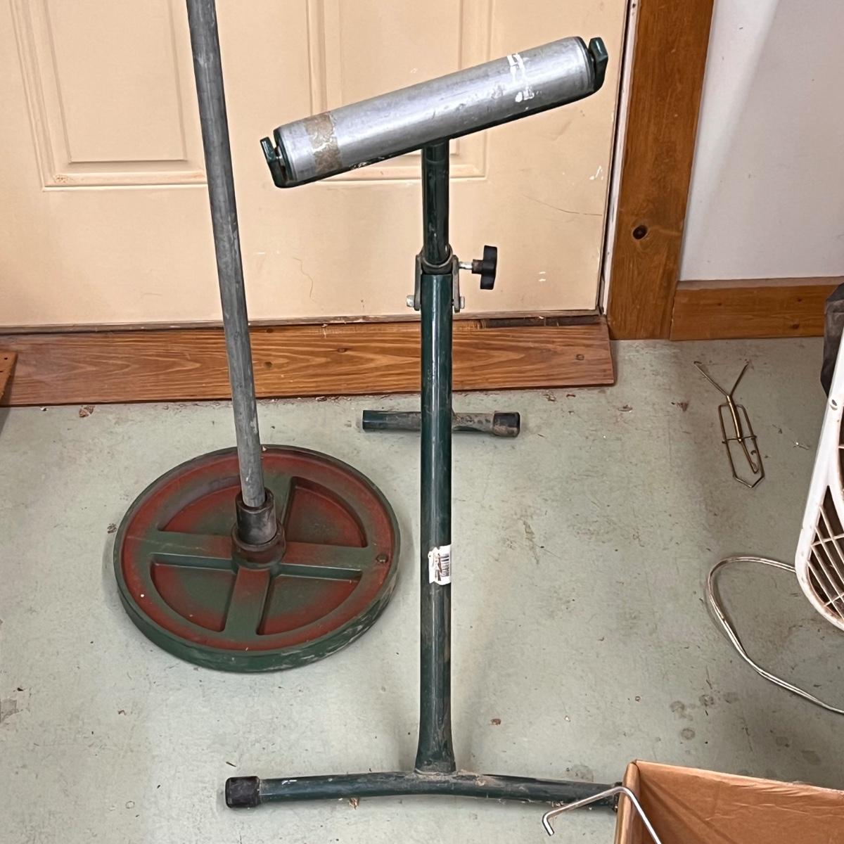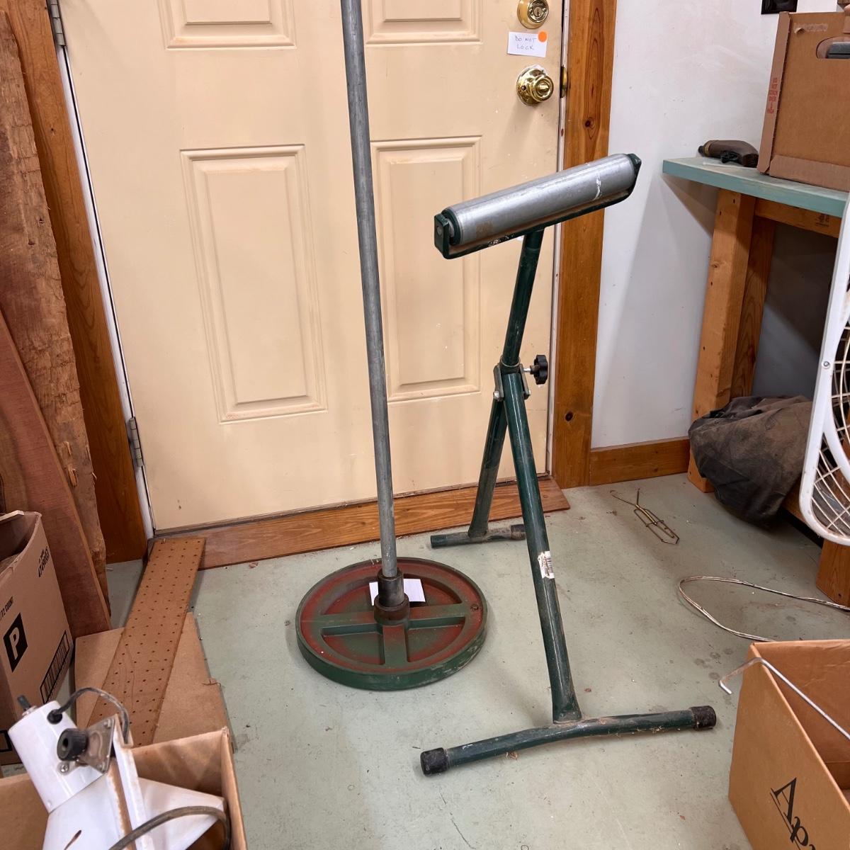 This lot includes one adjustable roller stand and one base of a roller stand. The tallest item measures 14”D x 73”H.