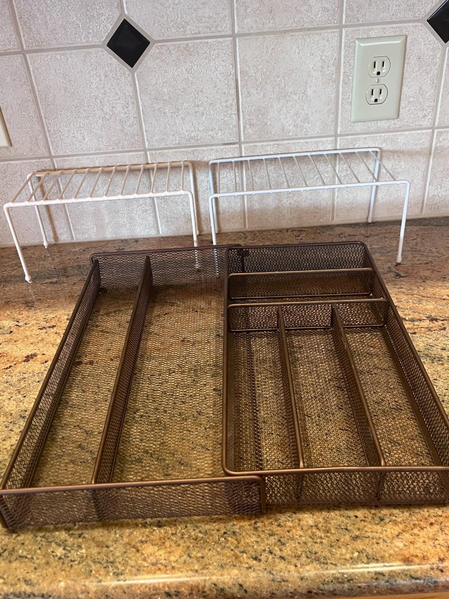 ADJUSTABLE SIZE DRAWER ORGANIZER PLUS 2 CUPBOARD RISERS