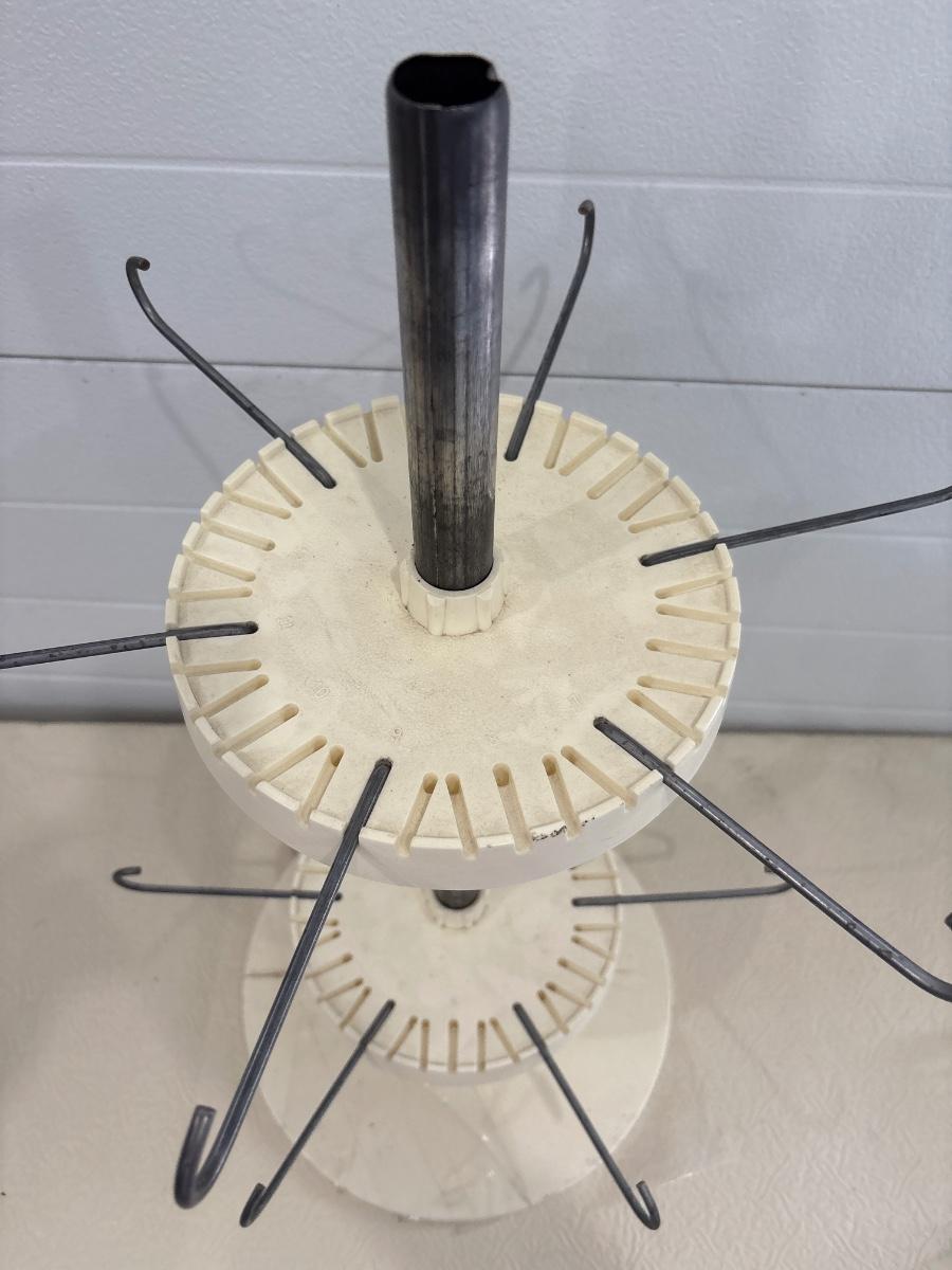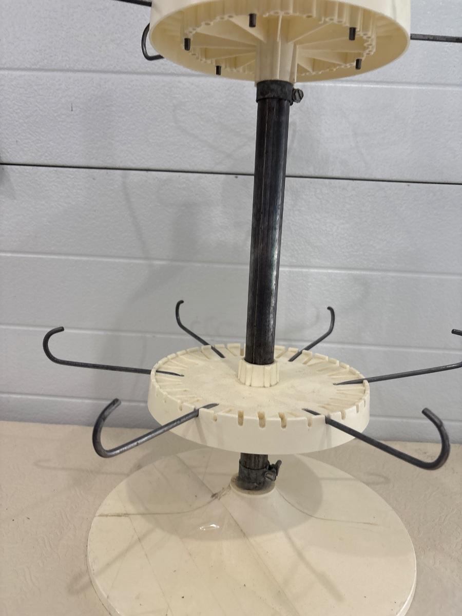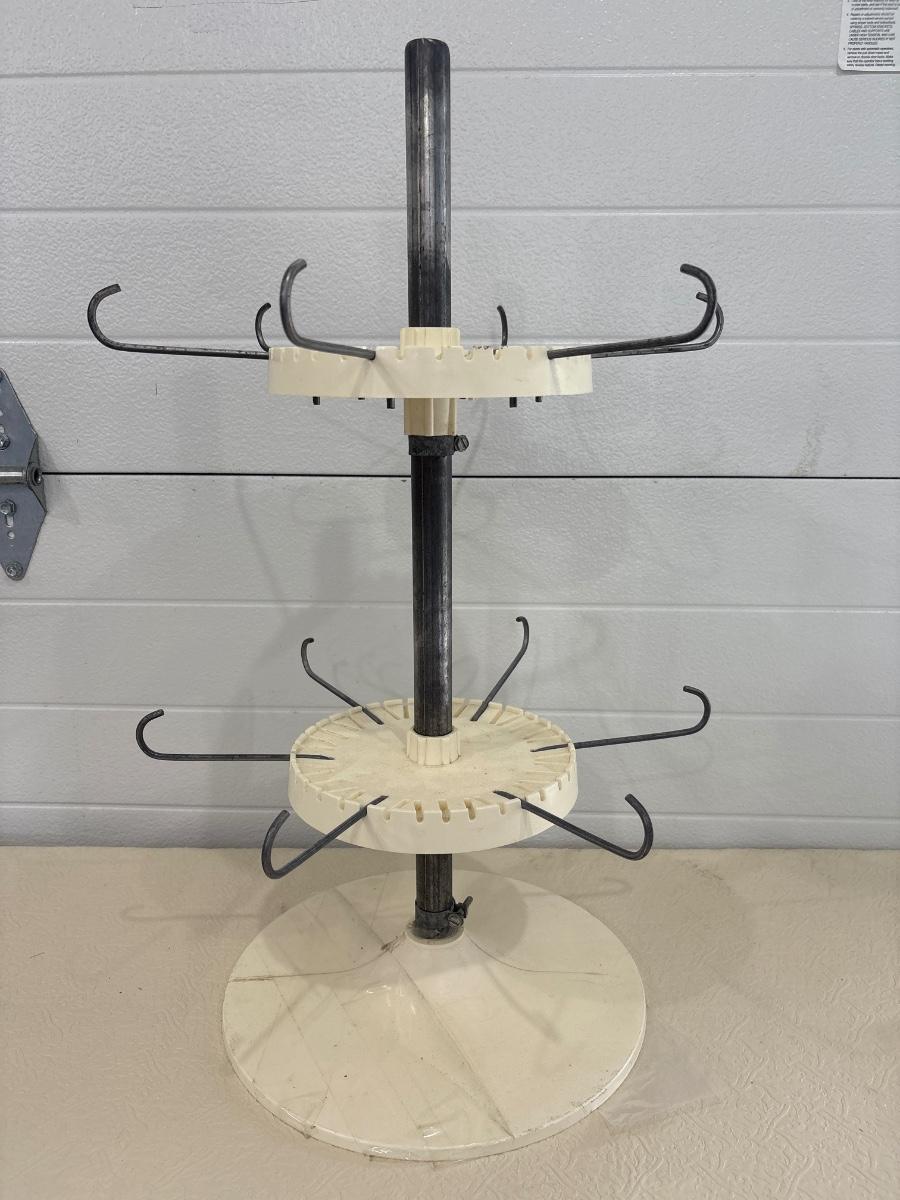 Adjustable plastic and metal stand for displaying items.