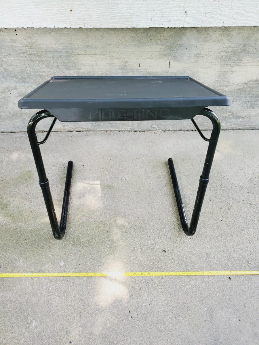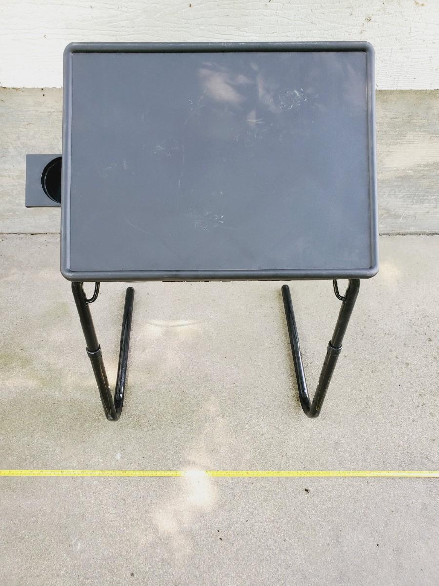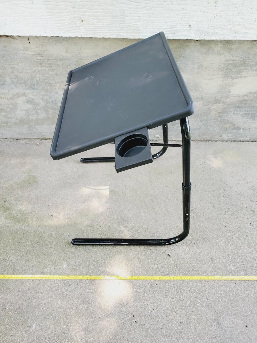 Good condition, very neat. Adjustable table mate can slide under couch or chair with cup holder and adjustable table top.