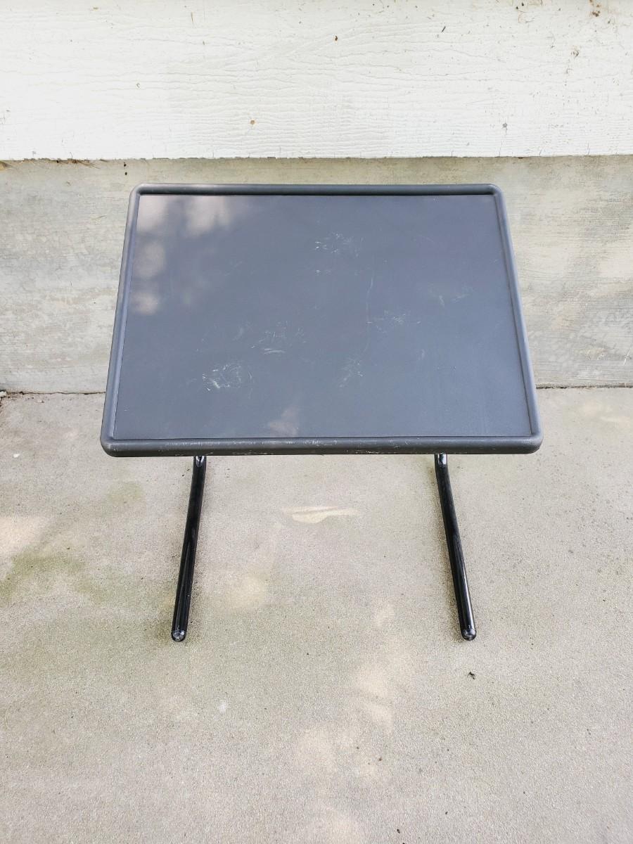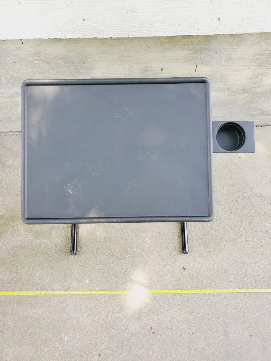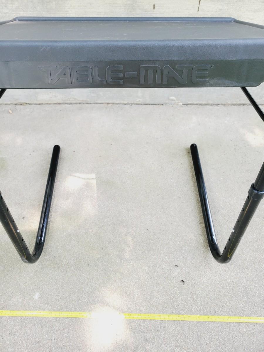 Good condition, very neat. Adjustable table mate can slide under couch or chair with cup holder and adjustable table top.