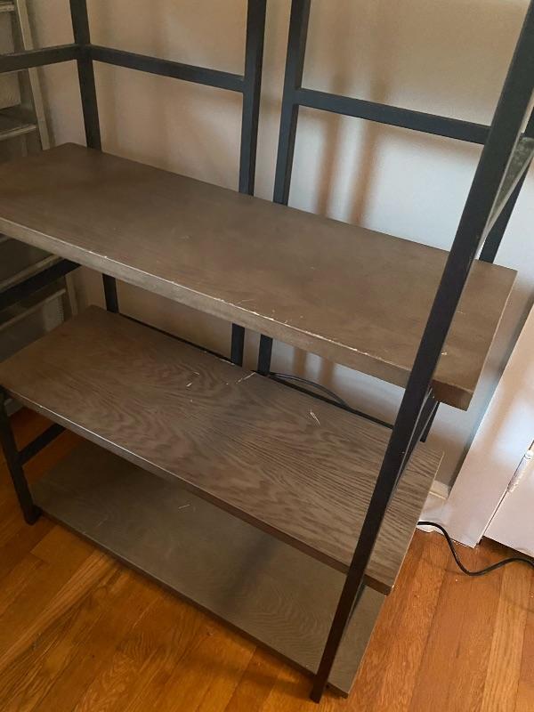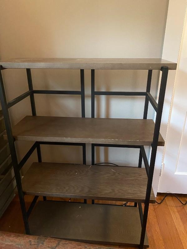Four Tier Adjustable Wooden & Metal Shelving Unit. Each wooden shelf measures 31.5” W x 14” D. Shelving unit 43.5” H