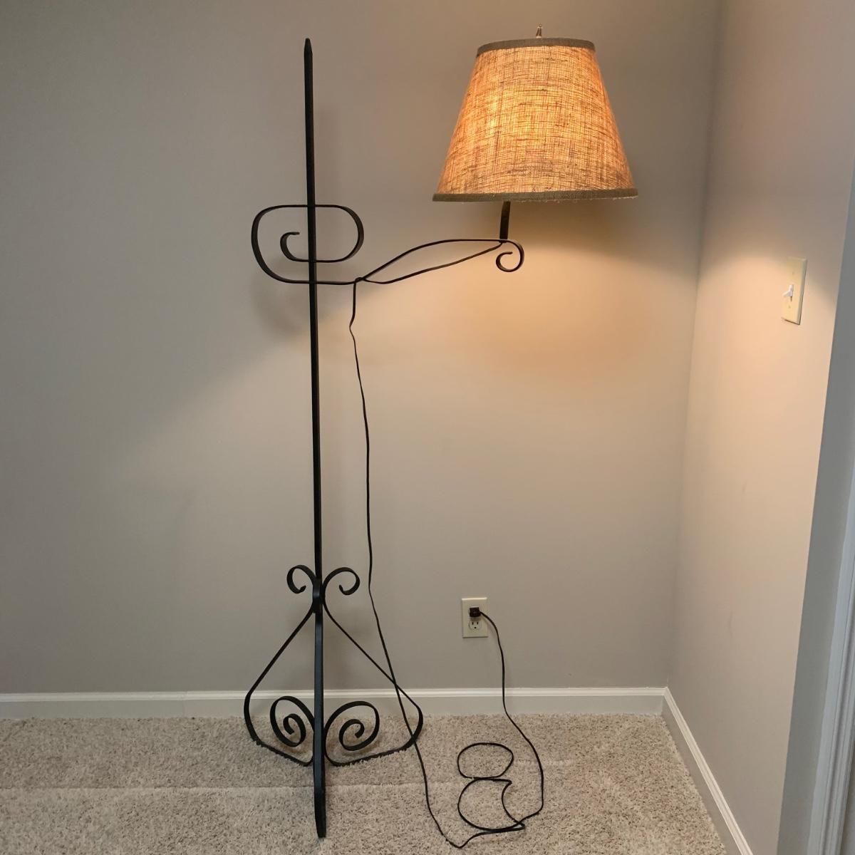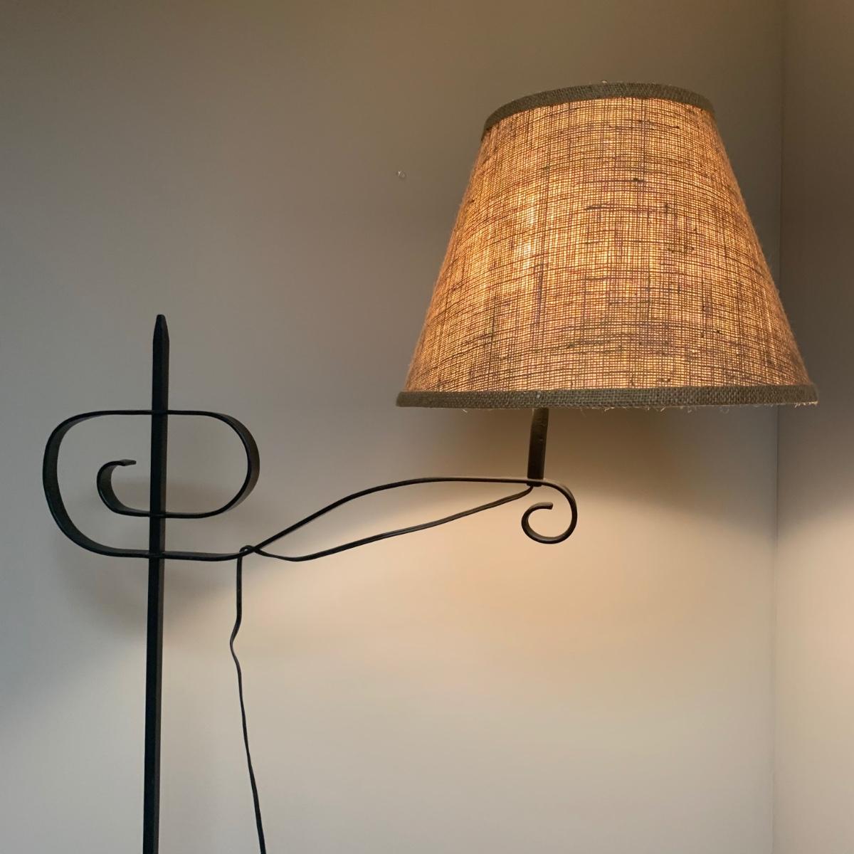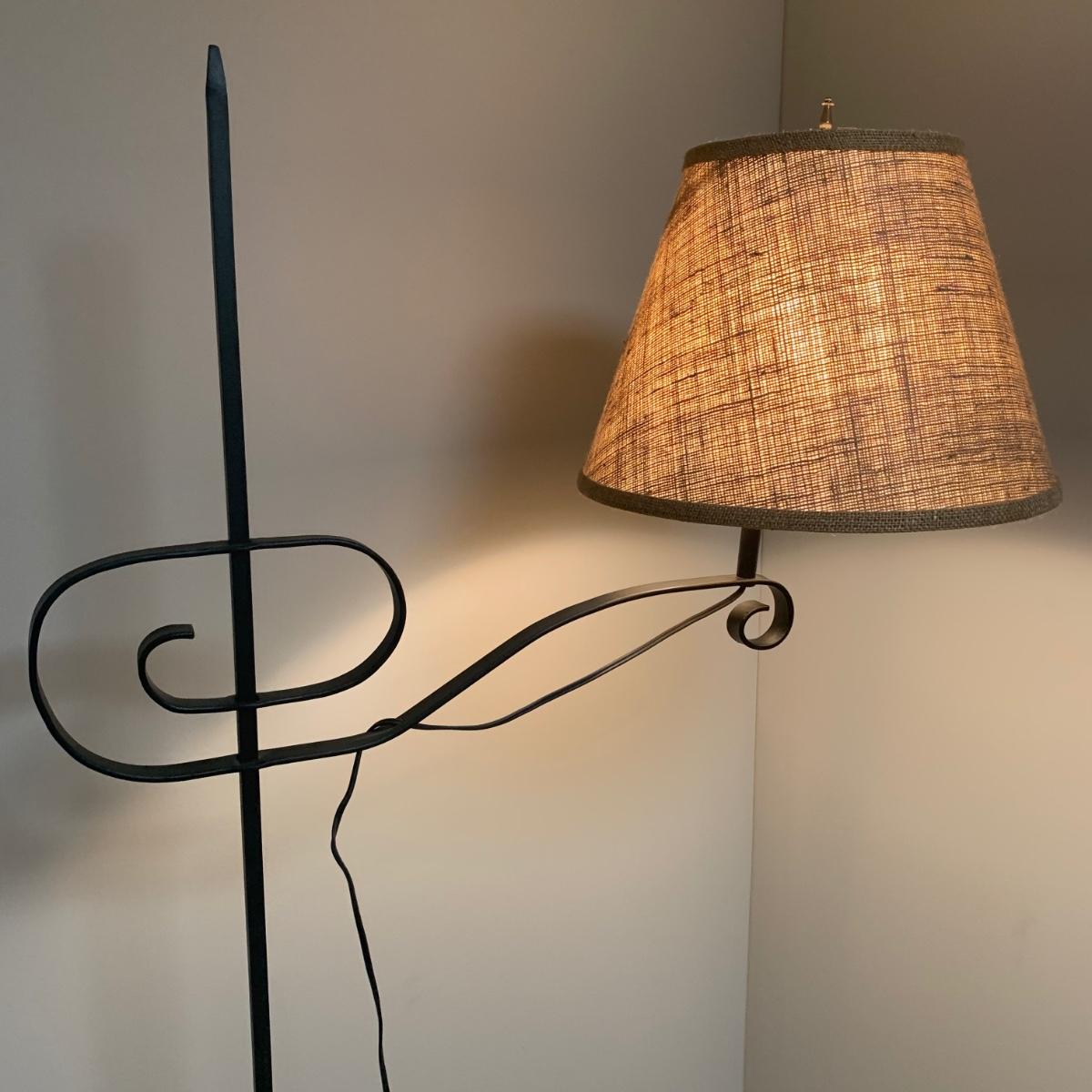 Unique adjustable wrought iron style floor lamp with burlap shade. At the tallest setting lamp measures approximately, 17” x 17” x 77”H. Could be used as reading lamp in shorter setting, or used as lighting for the whole room in the tallest setting. Single brightness switch. Local pickup only.