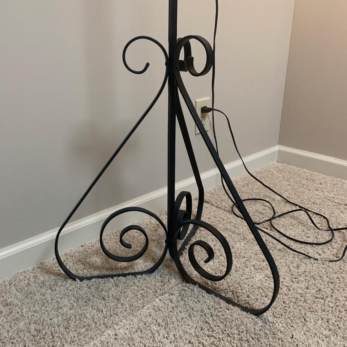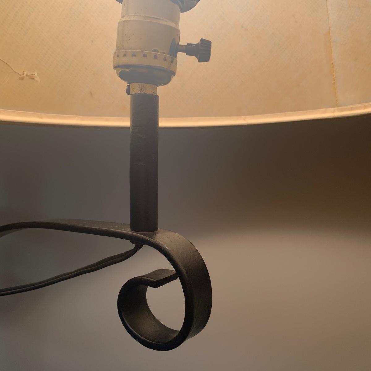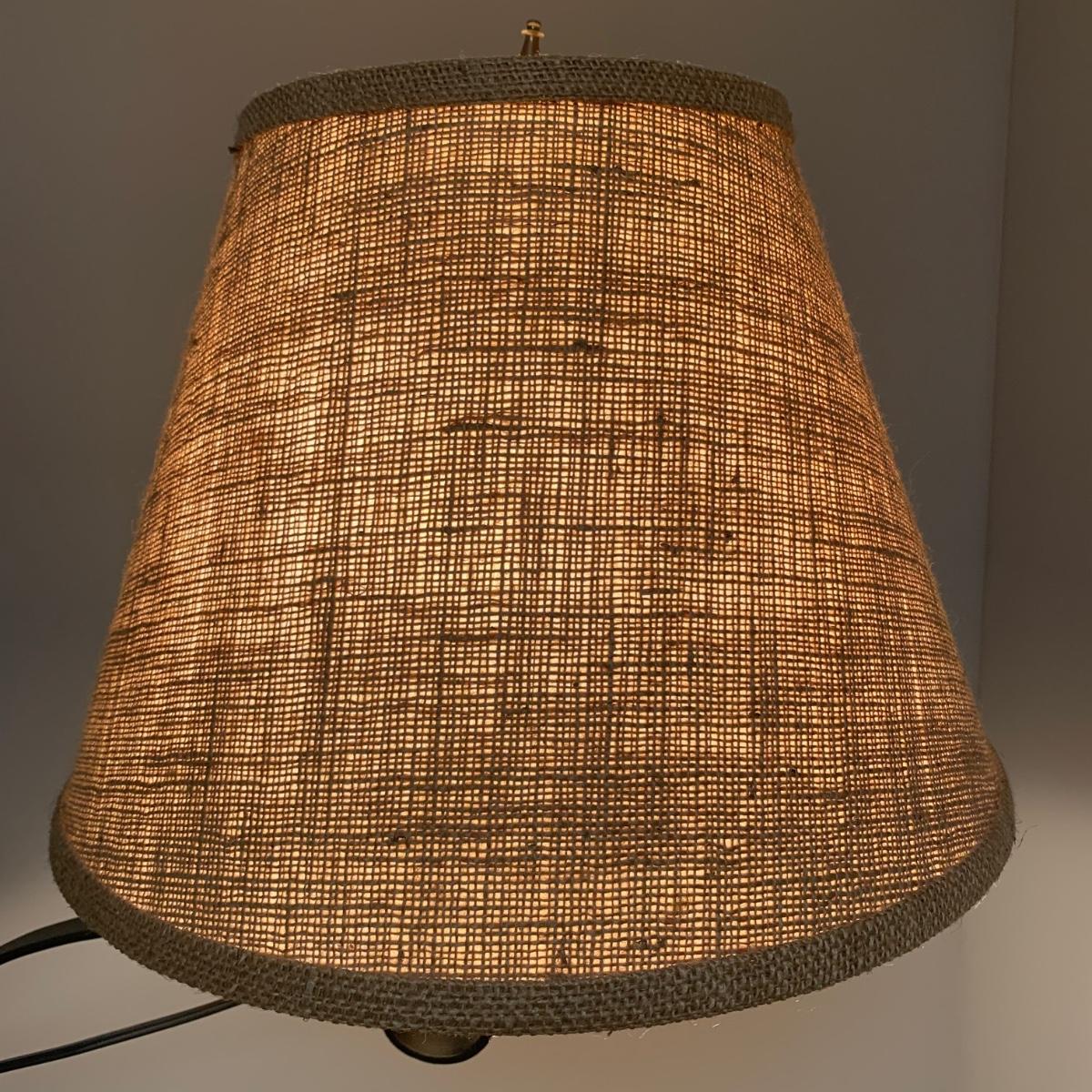 Unique adjustable wrought iron style floor lamp with burlap shade. At the tallest setting lamp measures approximately, 17” x 17” x 77”H. Could be used as reading lamp in shorter setting, or used as lighting for the whole room in the tallest setting. Single brightness switch. Local pickup only.