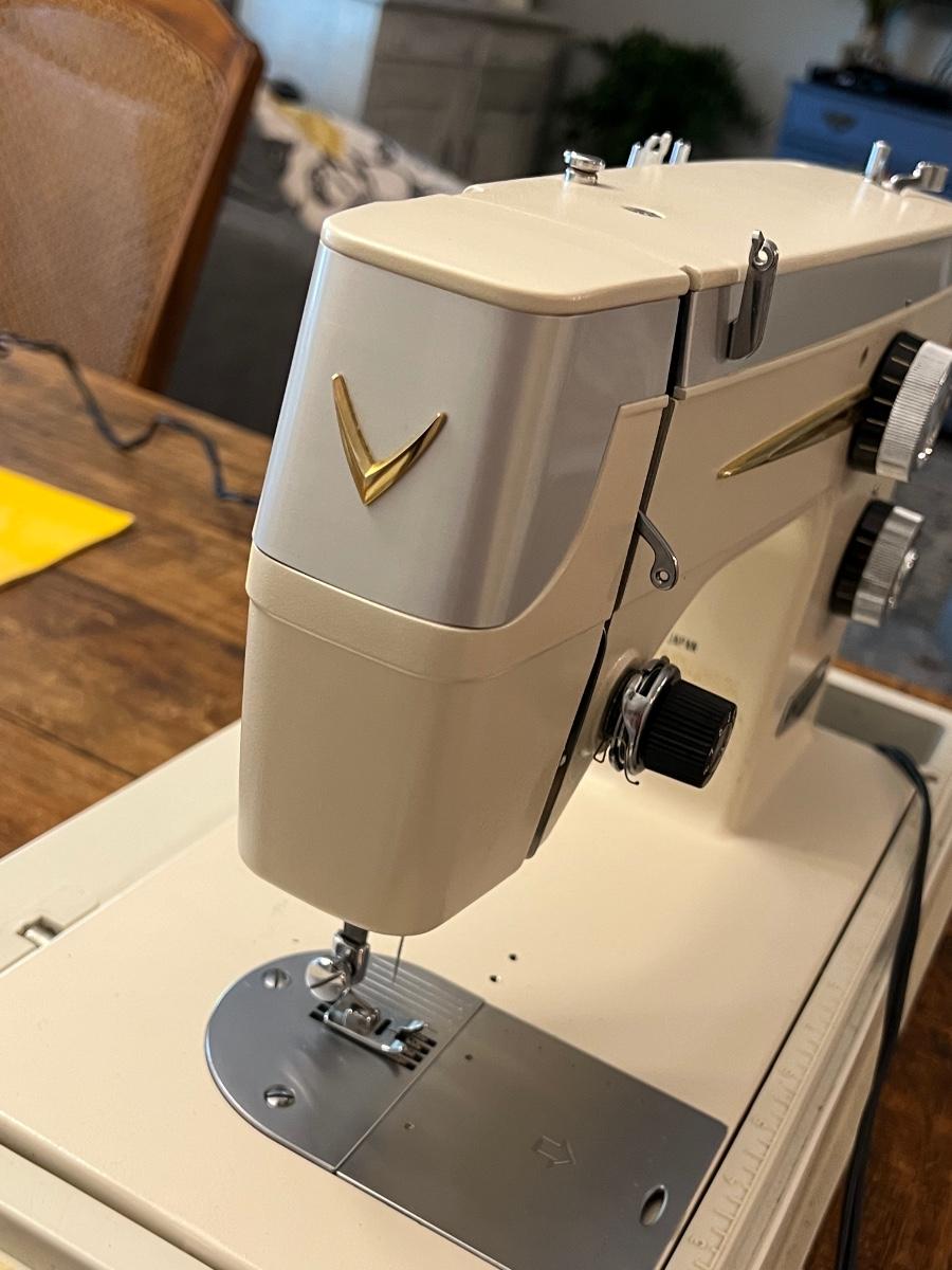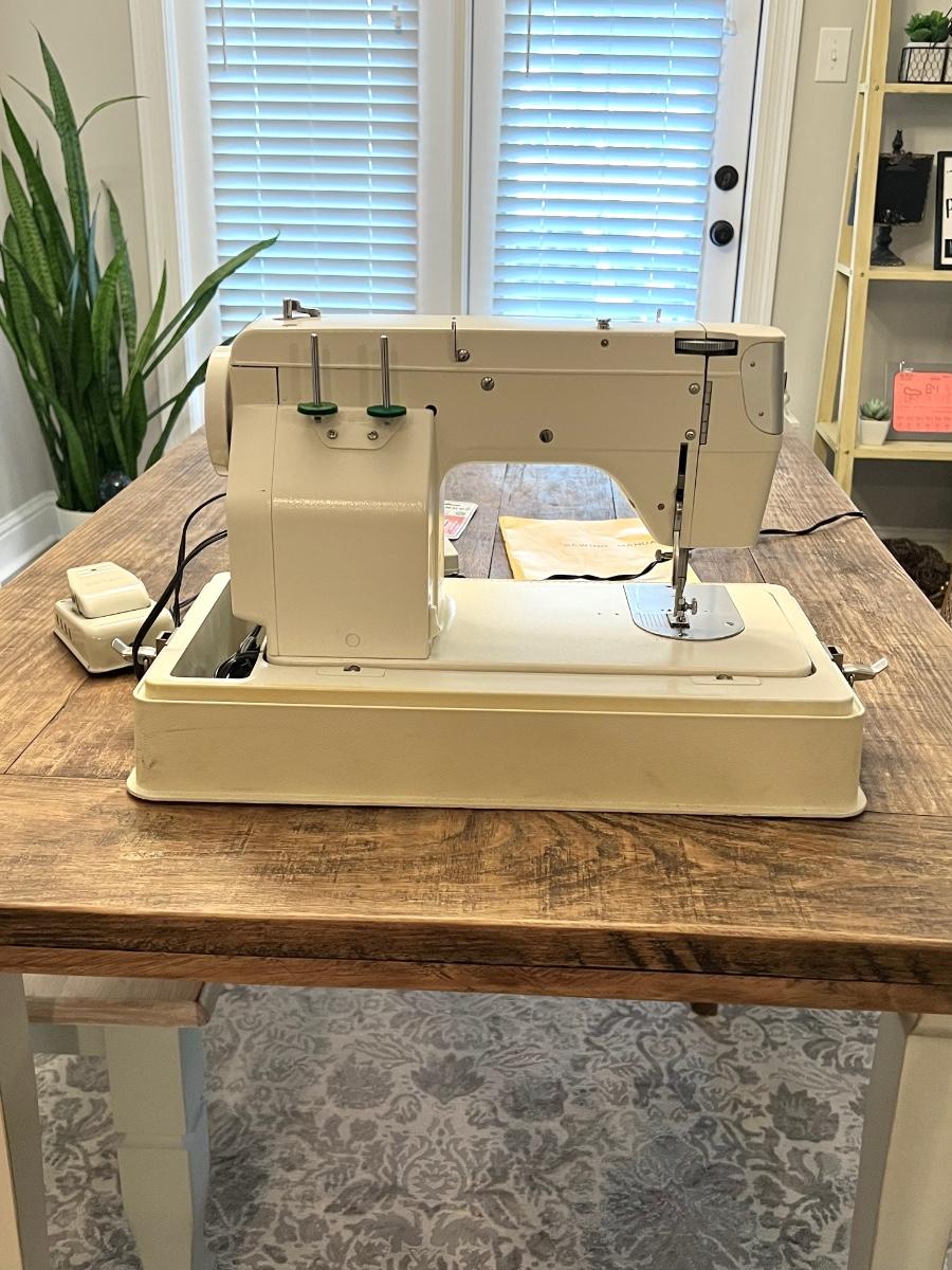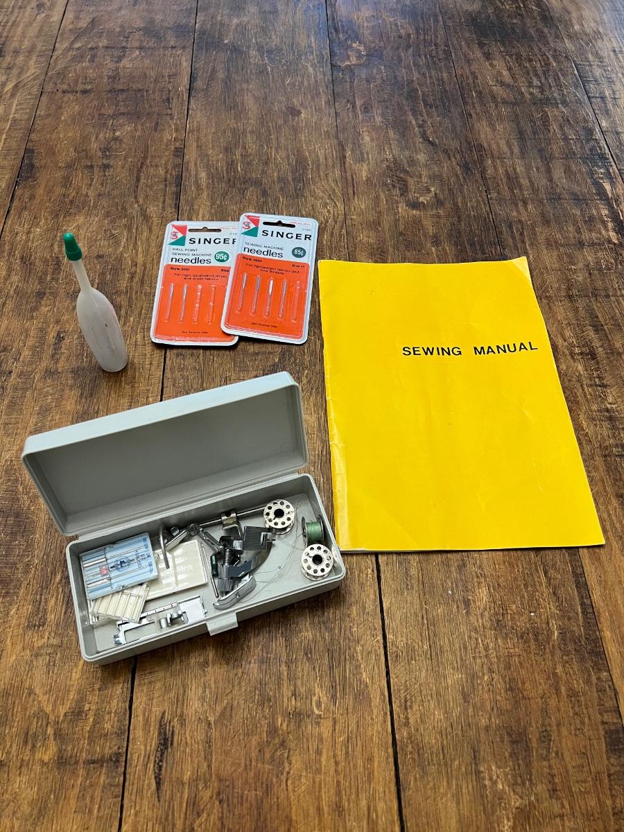 Works! Includes: sewing machine, manual, sewing machine needles, oil bottle, & misc sewing box. Table & other things pictured are not for sale ~ only the sewing machine & it’s accessories.