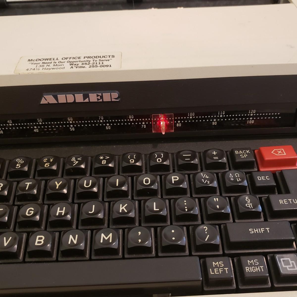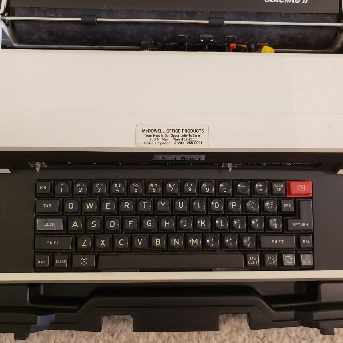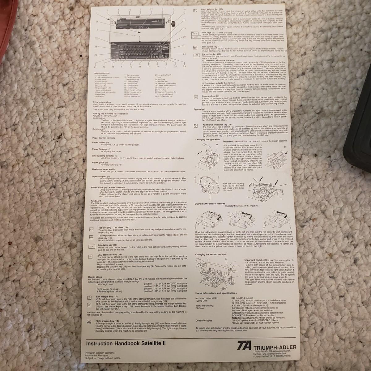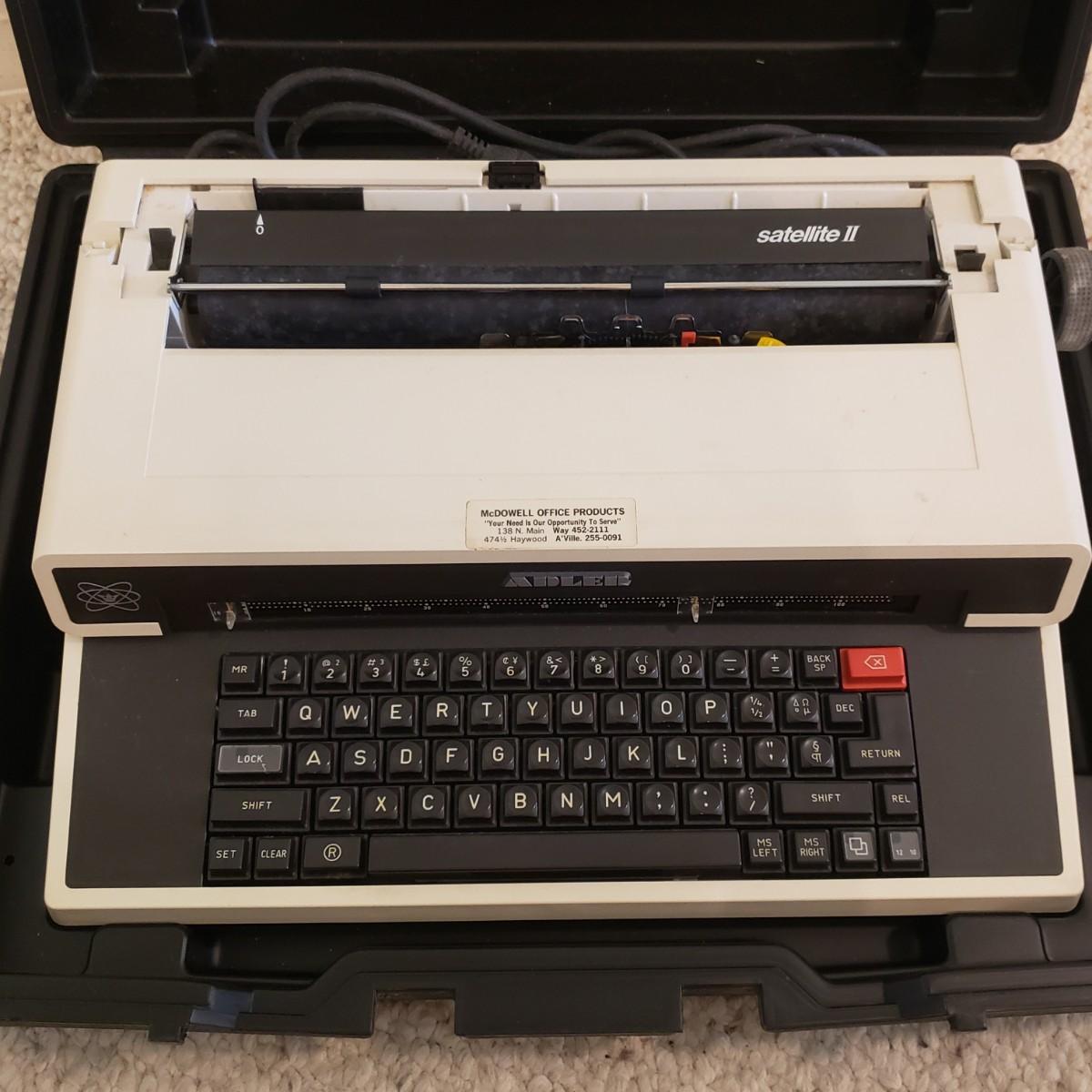 This Adler Satellite II electronic typewriter powers on when plugged in, notice the red light. The typewriter comes with a black plastic carrying case and instruction manual. The case measures 20" x 16" x 7"H.