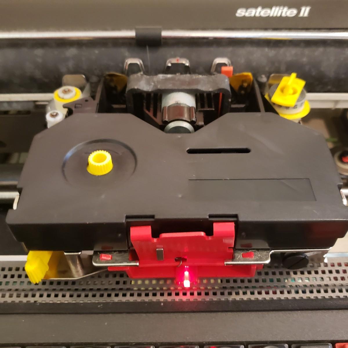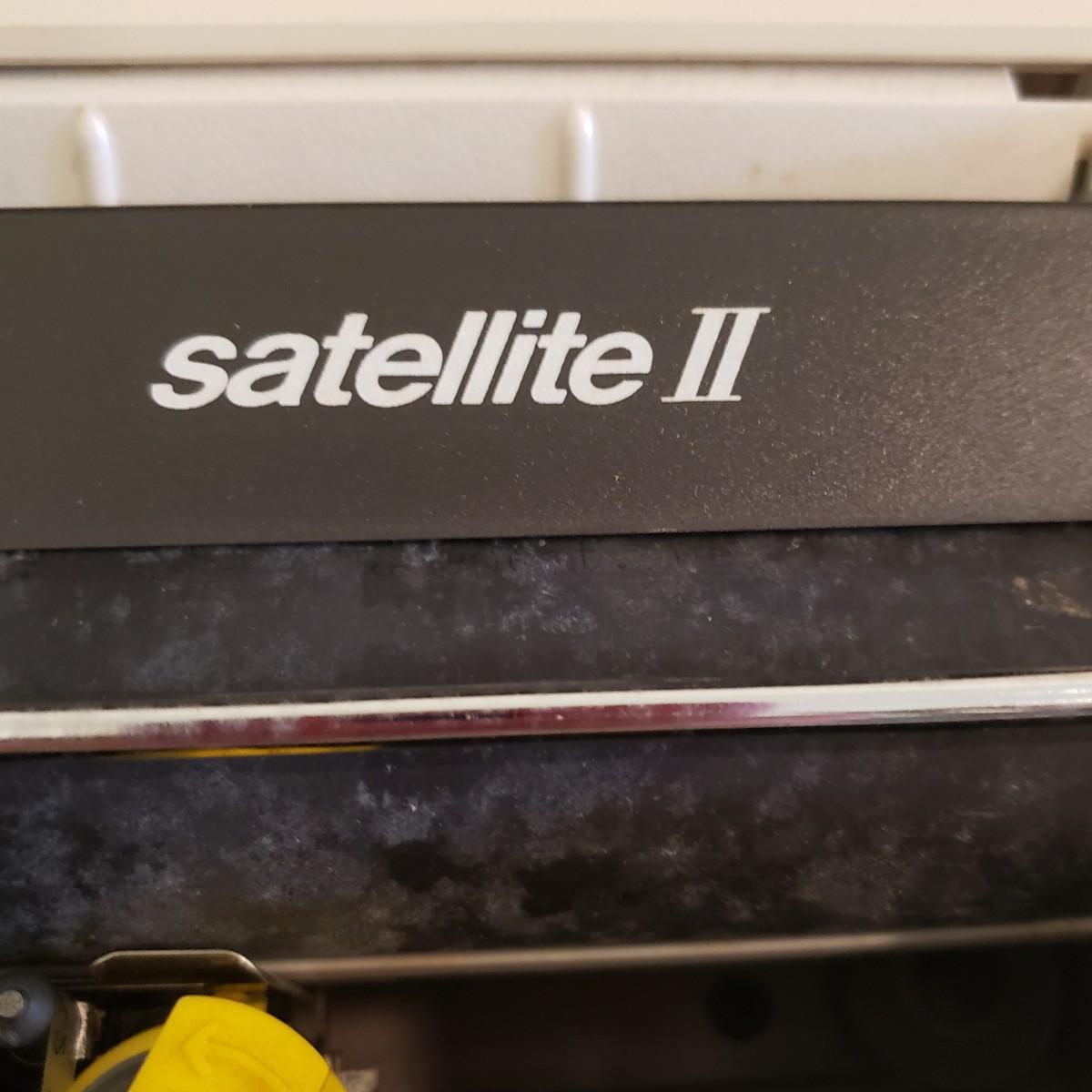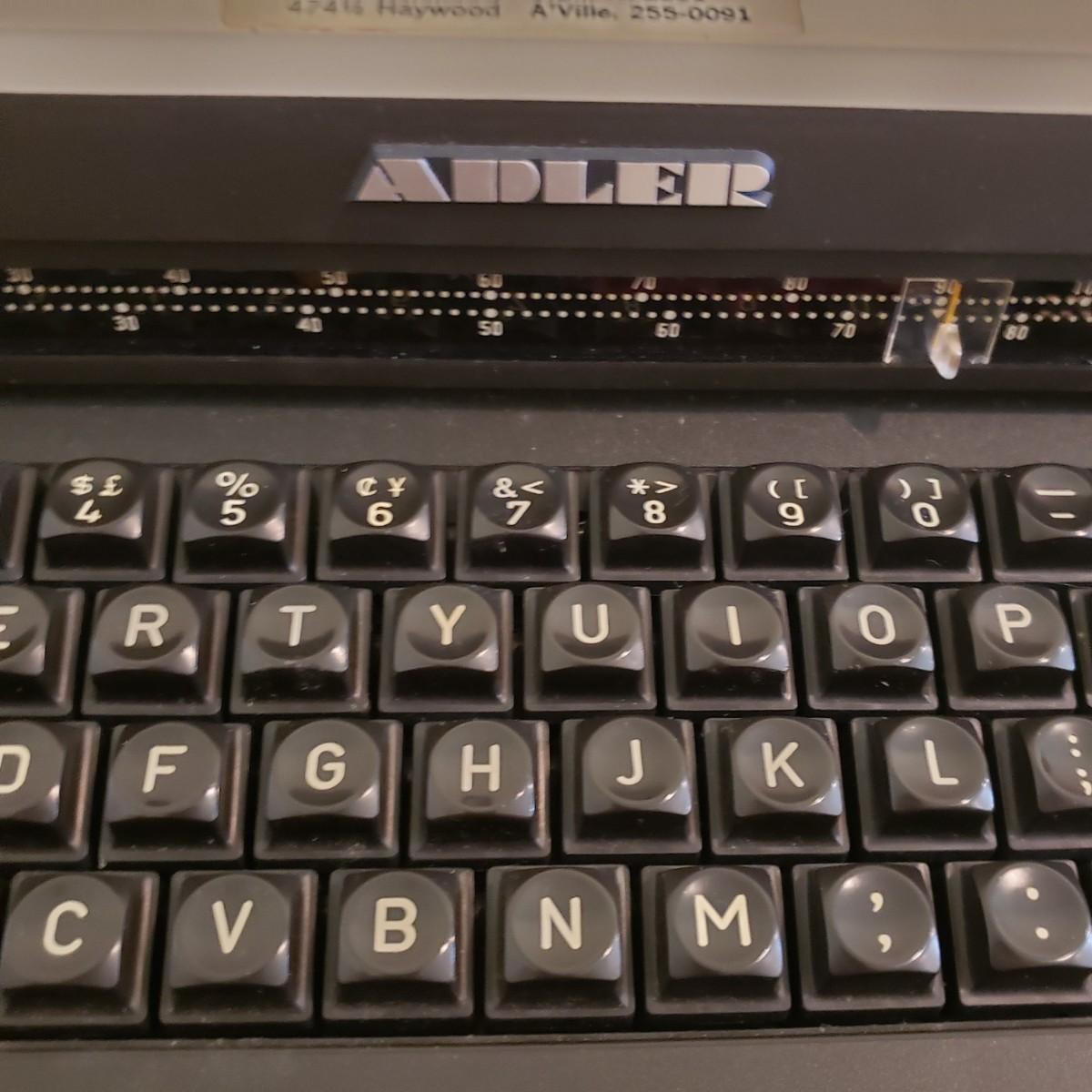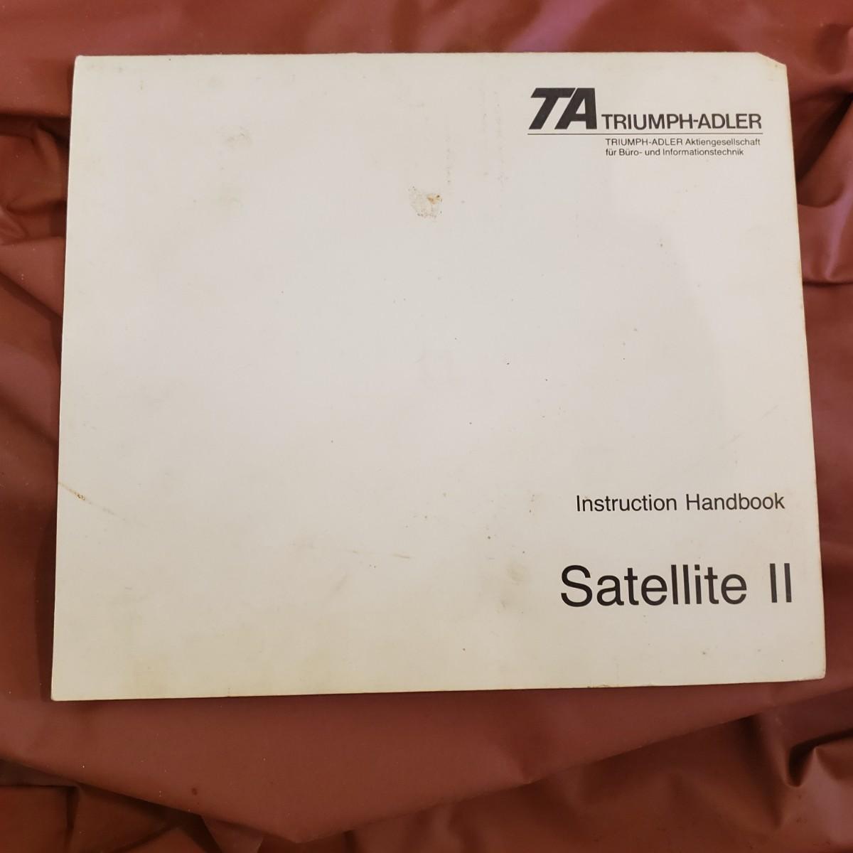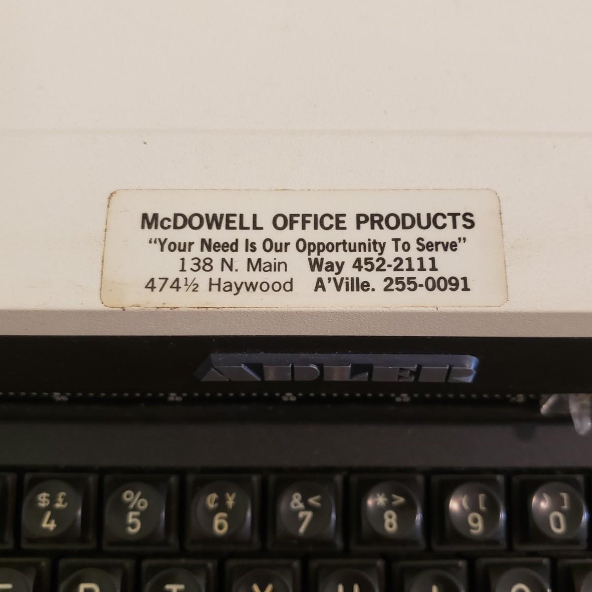 This Adler Satellite II electronic typewriter powers on when plugged in, notice the red light. The typewriter comes with a black plastic carrying case and instruction manual. The case measures 20" x 16" x 7"H.