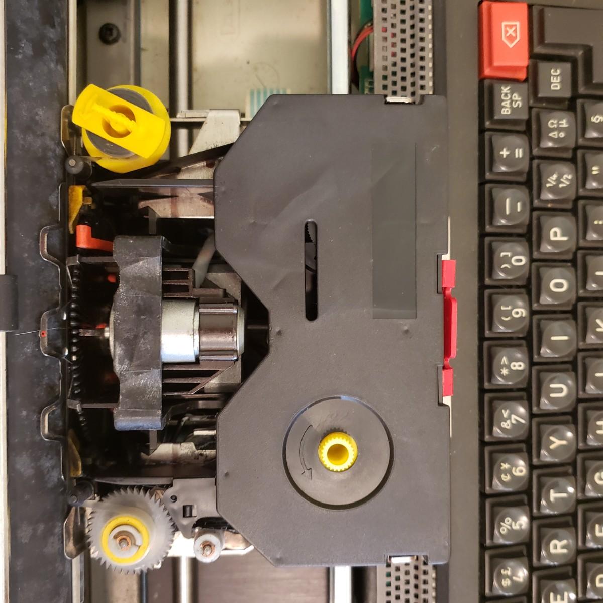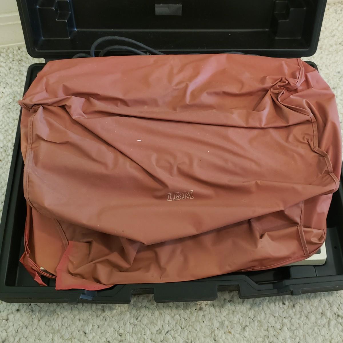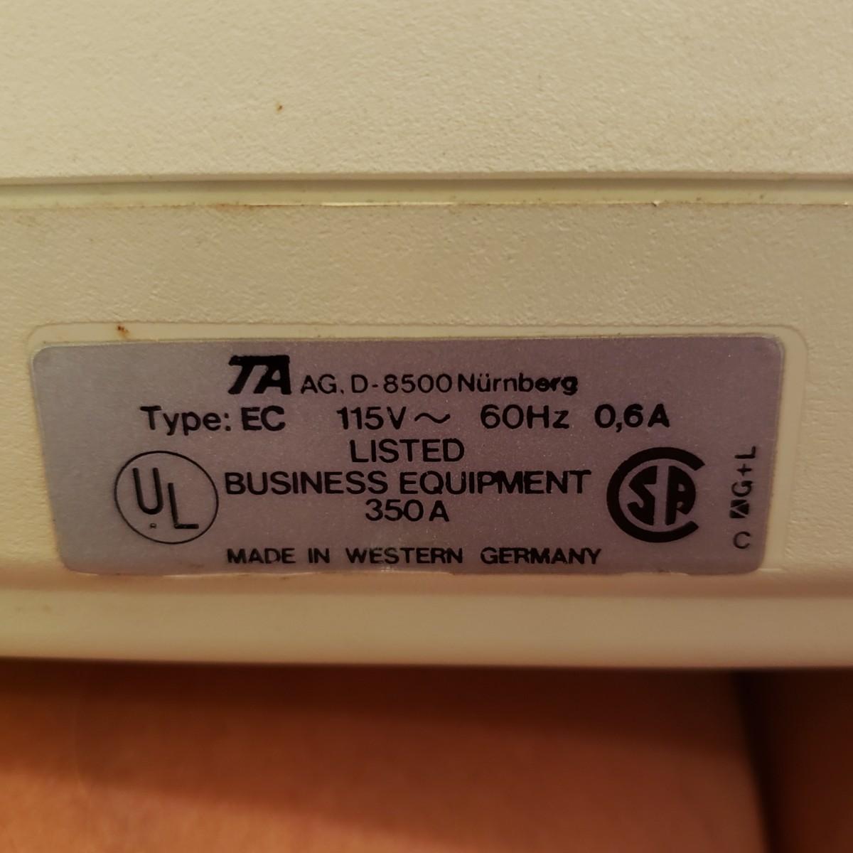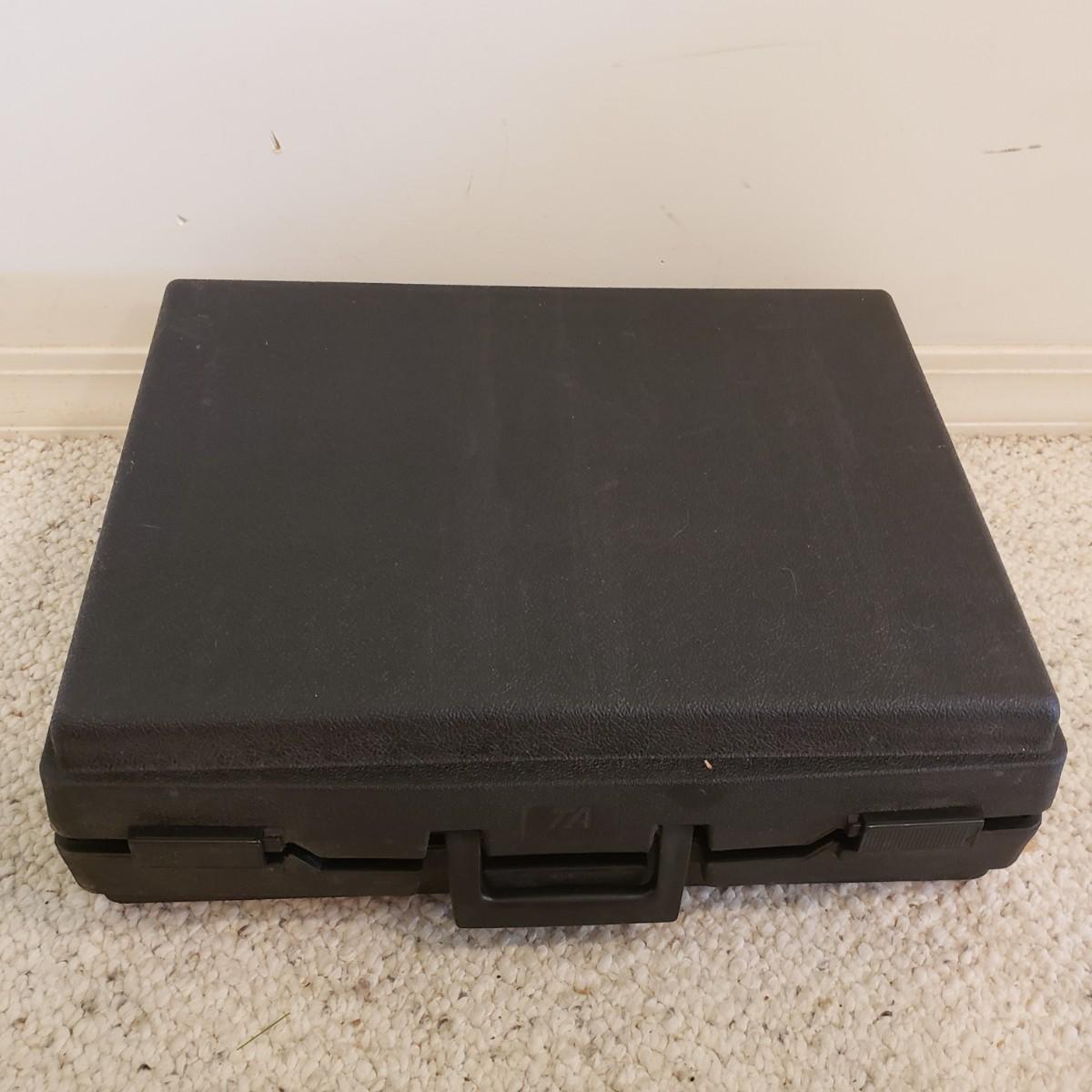 This Adler Satellite II electronic typewriter powers on when plugged in, notice the red light. The typewriter comes with a black plastic carrying case and instruction manual. The case measures 20" x 16" x 7"H.